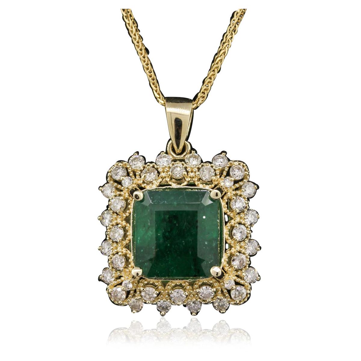 One electronically tested 14KT yellow gold Ladies pendant & chain 17.5" long, medium fancy herringbone link with a lobster claw clasp with a bright polish finish. Condition is new. Identified with markings of "14K". Containing: One prong set emerald standard step cut natural emerald, measuring 10.40 x 10.00 x 6.80mm, approximate weight of 5.19ct., clarity is heavily included, type III, medium dark, moderately strong, green color, (GIA G 6/4), cut is good. Colored gemstones are presumed to have been subjected to commonly used color/clarity enhancement processes. Thirty-Six prong set round brilliant cut diamonds, measuring 1.80 - 1.80 x 1.08mm (depth est.) approximate. Total Weight of 36 Stones = 0.77ct. Clarity: SI-2 to I-1. Color: L - M, Cut is Good. Total Weight of Colored Stones 5.19ct. Total Weight of Diamonds 0.77ct. Total Weight of Pendant & Chain 5.80 grams. GGL Appraised at $13,145.00.