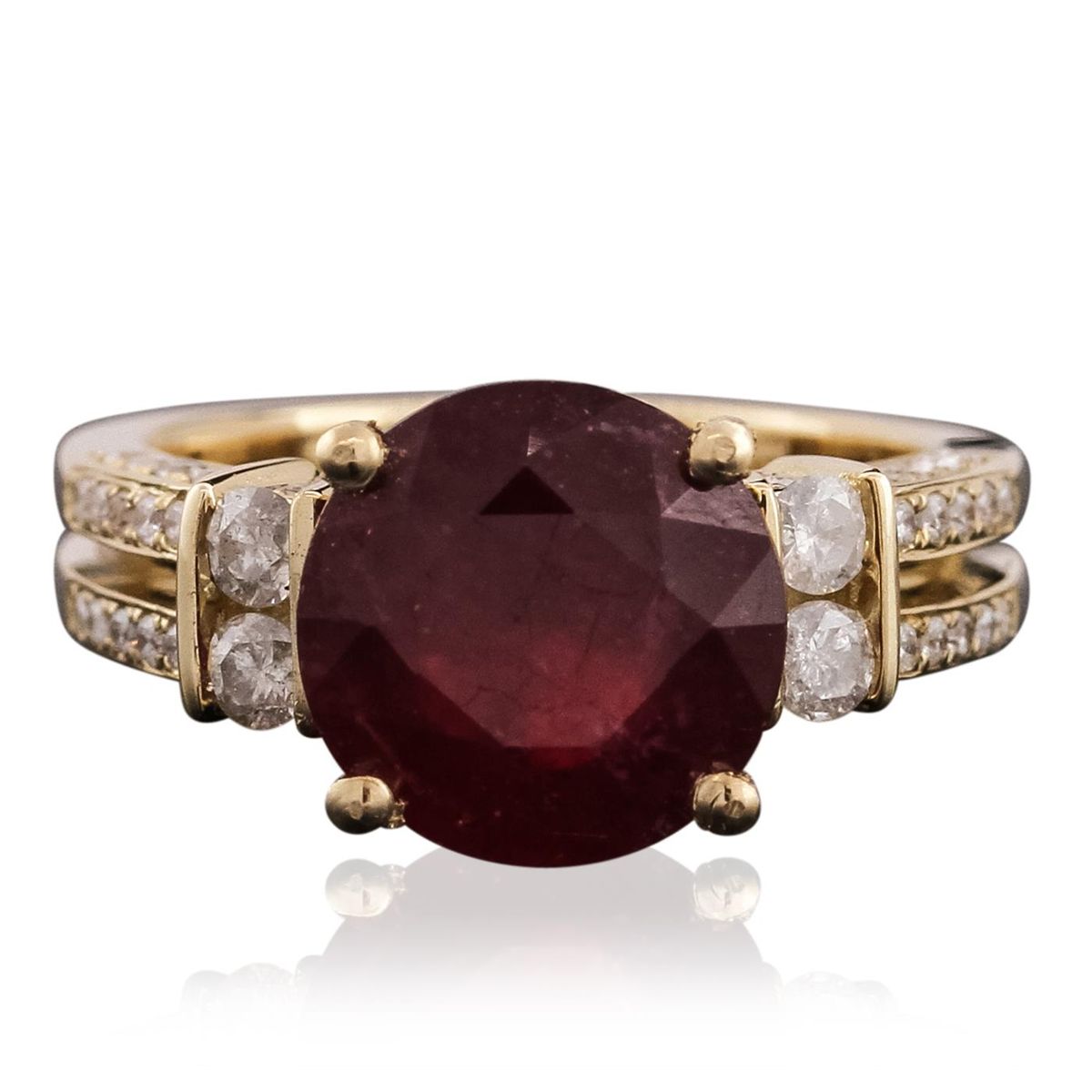 One electronically tested 14KT yellow gold ladies cast & assembled ruby & diamond ring with a bright finish. The featured ruby is set within tapering diamond set shoulders, completed by a three and one half millimeter wide band. Trademark is Orianne. Identified with markings of "14K". Condition is good. Containing: One prong set round mixed cut natural ruby, measuring 10.30 - 10.30 x 5.88 mm, 4% bulge factor, approximate weight of 5.19ct., clarity is heavily included, type II, dark, slightly brownish, slightly purplish red color, (GIA slpR 7/2), cut is good. Transmitting light somewhat diffusely, translucent. Naturally occurring internal & external characteristics are present. Indications of laboratory high temperature heat treatment, with glass & flux additives. Graded in the setting. Ruby has a low tolerance to rhodium plating, repolishing the surface, & ultrasonic cleaning. Four channel set round brilliant cut diamonds, measuring 2.55 - 2.50 x 1.54mm (depth est.) approximate total weight of 4 Stones = 0.24ct. Graded in the setting. Clarity: I-2 to I-3. Color: H - J Forty-Four bright cut & bead set round brilliant cut diamonds, measuring 1.30 - 1.00 x 0.69mm (depth est.) approximate total weight of 44 Stones = 0.26ct. Graded in the setting. Clarity: I-2 to I-3. Color: G - I. Total Weight of Colored Stones 5.19ct. Total Weight of Diamonds 0.50ct. Total Weight of Ring 7.37 grams. AIG Appraised at $3,130.00.