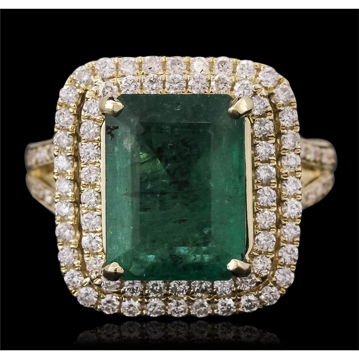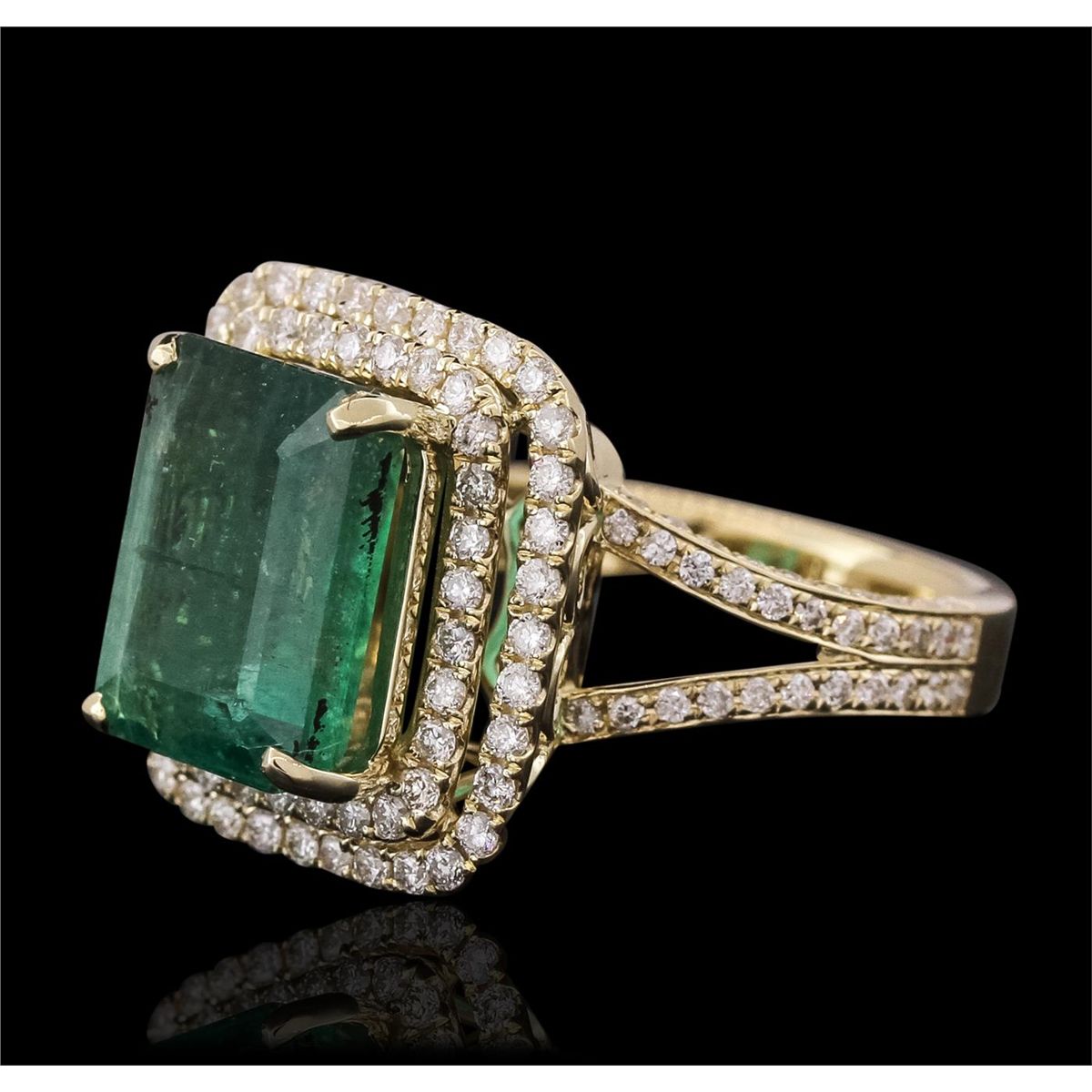 One electronically tested 14KT yellow gold ladies cast emerald and diamond ring with a bright polish finish. The featured emerald is set within two tiered diamond bezels supported by diamond set split shoulders, completed by a three millimeter wide band. Identified with markings of "14K". Condition is new, good workmanship. Containing: One prong set rectangular step cut natural emerald, measuring 12.30 x 9.20 x 5.35mm, 6% bulge factor, approximate weight of 5.24ct., clarity is heavily included, type III, medium dark, moderately strong, very slightly bluish green color, (GIA vslbG 6/4), cut is good. Transmitting light with a minimum of distortion, transparent. Naturally occurring internal & external characteristics are present. Indications of oil residue. Colored Stone Grading Report attached. Graded in the setting. One Hundred Fifty prong set round brilliant cut diamonds, measuring 1.50 - 1.30 x 0.84mm (depth est.) approximate total weight of 150 Stones = 1.60ct. Graded in the setting. Clarity: SI-1 to I-1. Color: G - I. Total Weight of Colored Stones 5.24ct. Total Weight of Diamonds 1.60ct. Total Weight of Ring 8.04 grams. AIG Appraised at $15,170.00.