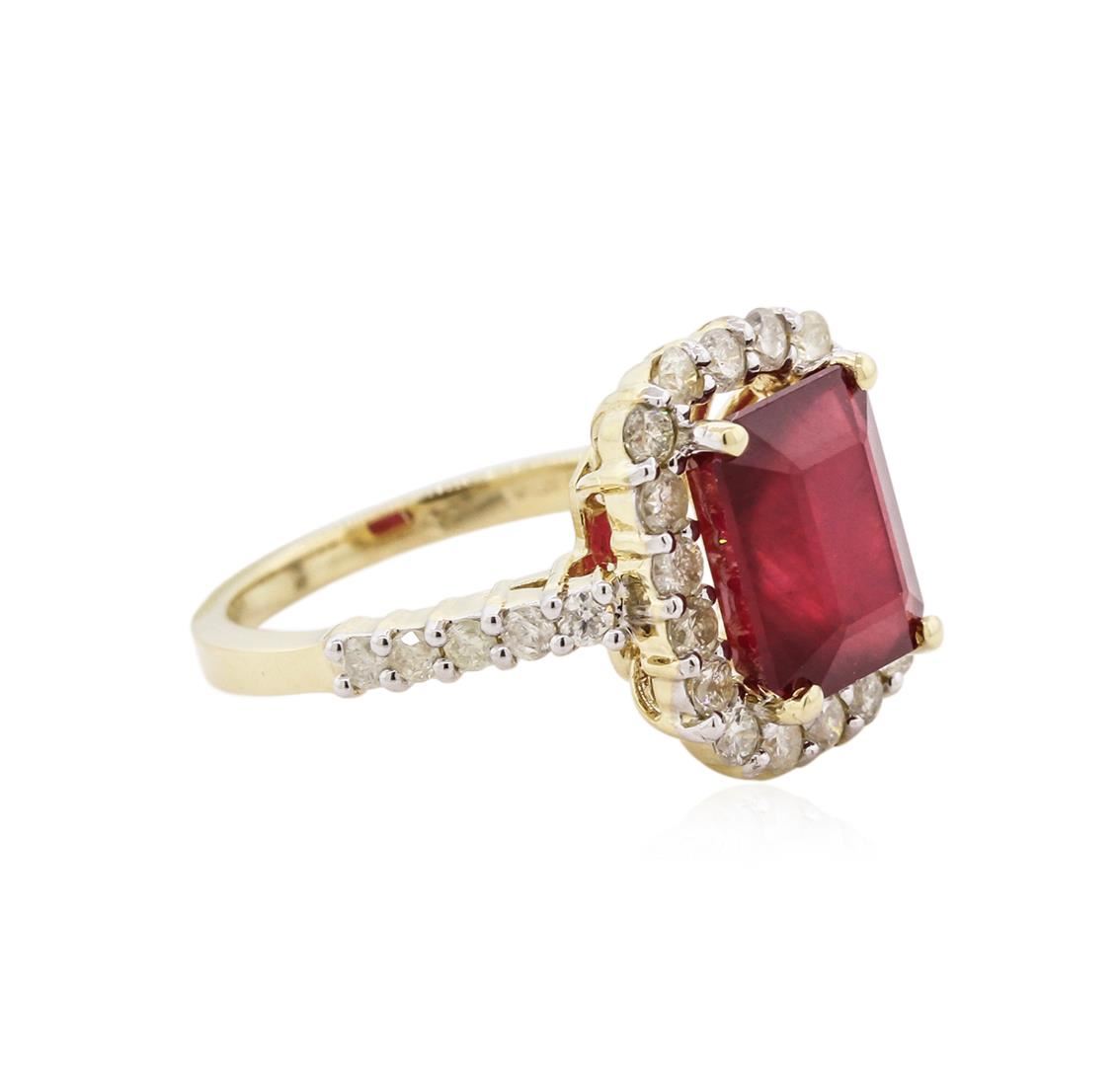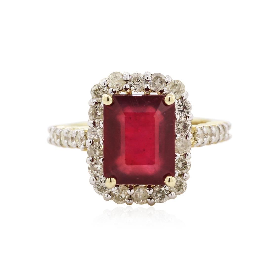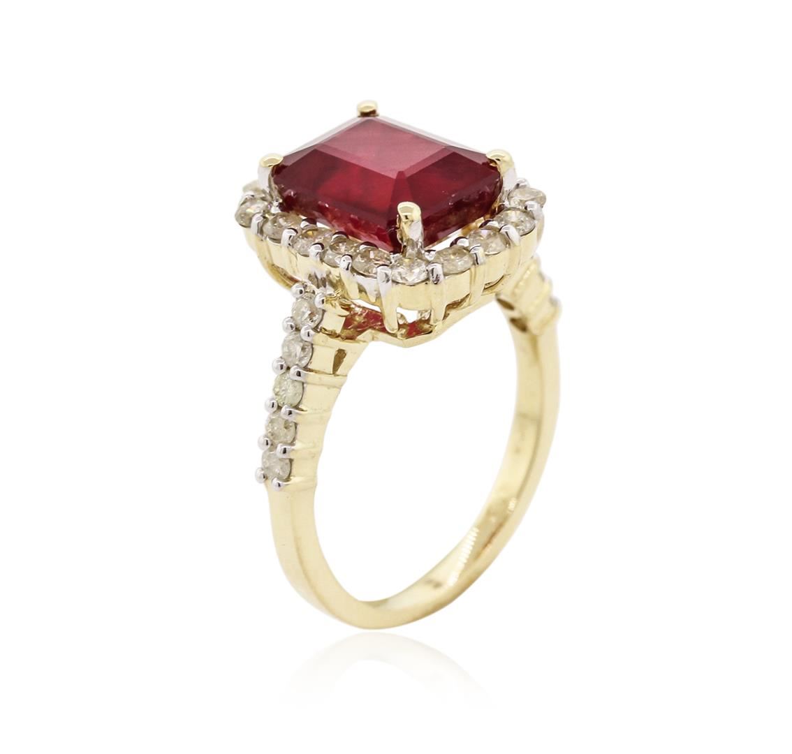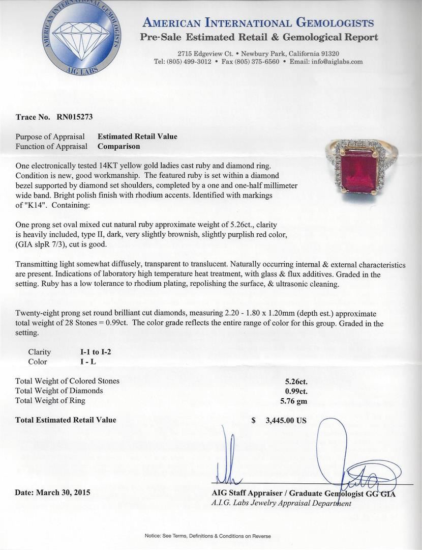 One electronically tested 14KT yellow gold ladies cast ruby and diamond ring. Condition is new, good workmanship. The featured ruby is set within a diamond bezel supported by diamond set shoulders, completed by a one and one-half millimeter wide band. Bright polish finish with rhodium accents. Identified with markings of "K14". Containing: One prong set oval mixed cut natural ruby approximate weight of 5.26ct., clarity is heavily included, type II, dark, very slightly brownish, slightly purplish red color, (GIA slpR 7/3), cut is good. Transmitting light somewhat diffusely, transparent to translucent. Naturally occurring internal and external characteristics are present. Indications of laboratory high temperature heat treatment, with glass and flux additives. Graded in the setting. Ruby has a low tolerance to rhodium plating, repolishing the surface, and ultrasonic cleaning. Twenty-eight prong set round brilliant cut diamonds, measuring 2.20 - 1.80 x 1.20mm (depth est.) approximate total weight 28 Stones = 0.99ct. The color grade reflects the entire range of color for this group. Graded in the setting. Clarity: I-1 to I-2. Color: I-L. Total weight of Colored Stones = 5.26ct. Total weight of Diamonds = 0.99ct. Total weight of Ring = 5.76 grams. AIG Appraised at $3,445.00.