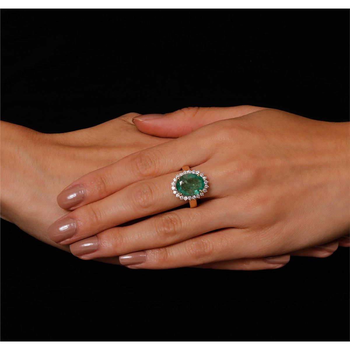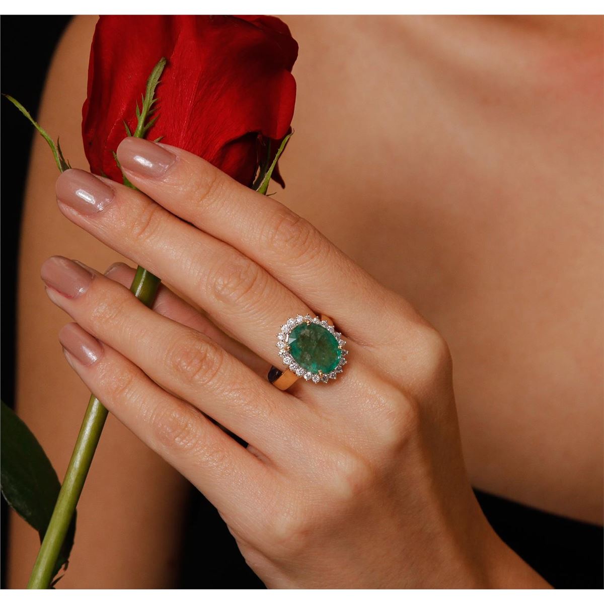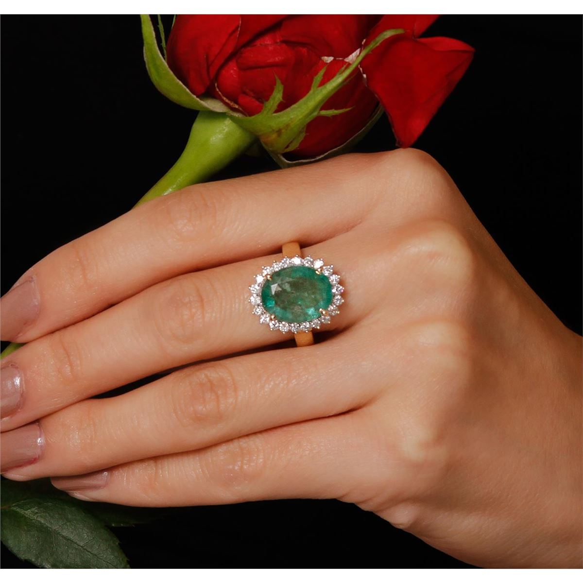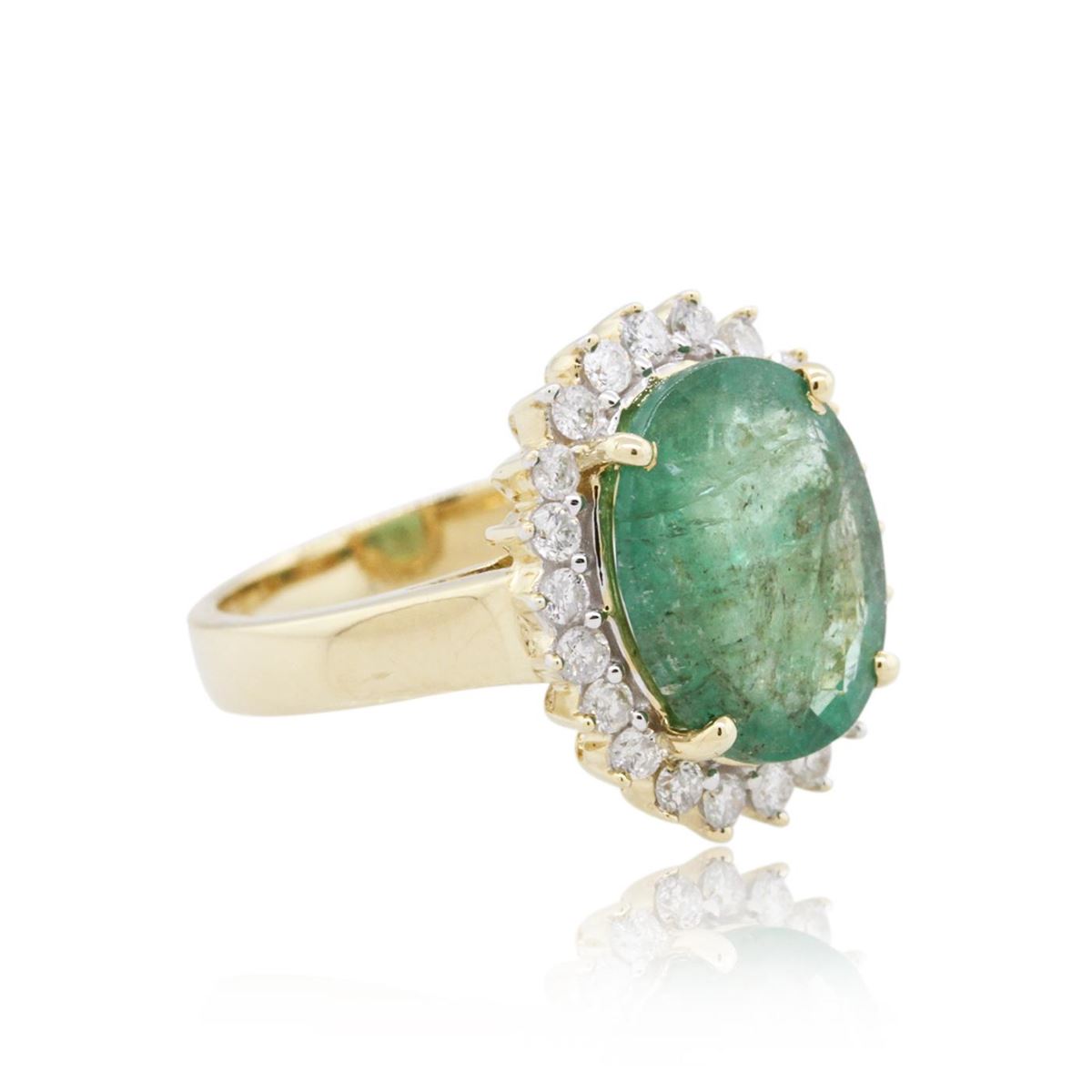 One polished, stamped, and electronically tested solid 14K yellow gold ring mounted with: 1 genuine emerald center stone weighing 5.26 carats and 22 genuine round diamonds weighing 0.61 carats. This item weighs 6.8 grams, condition is new, very good workmanship. AIGL Appraised at $5,400.00.