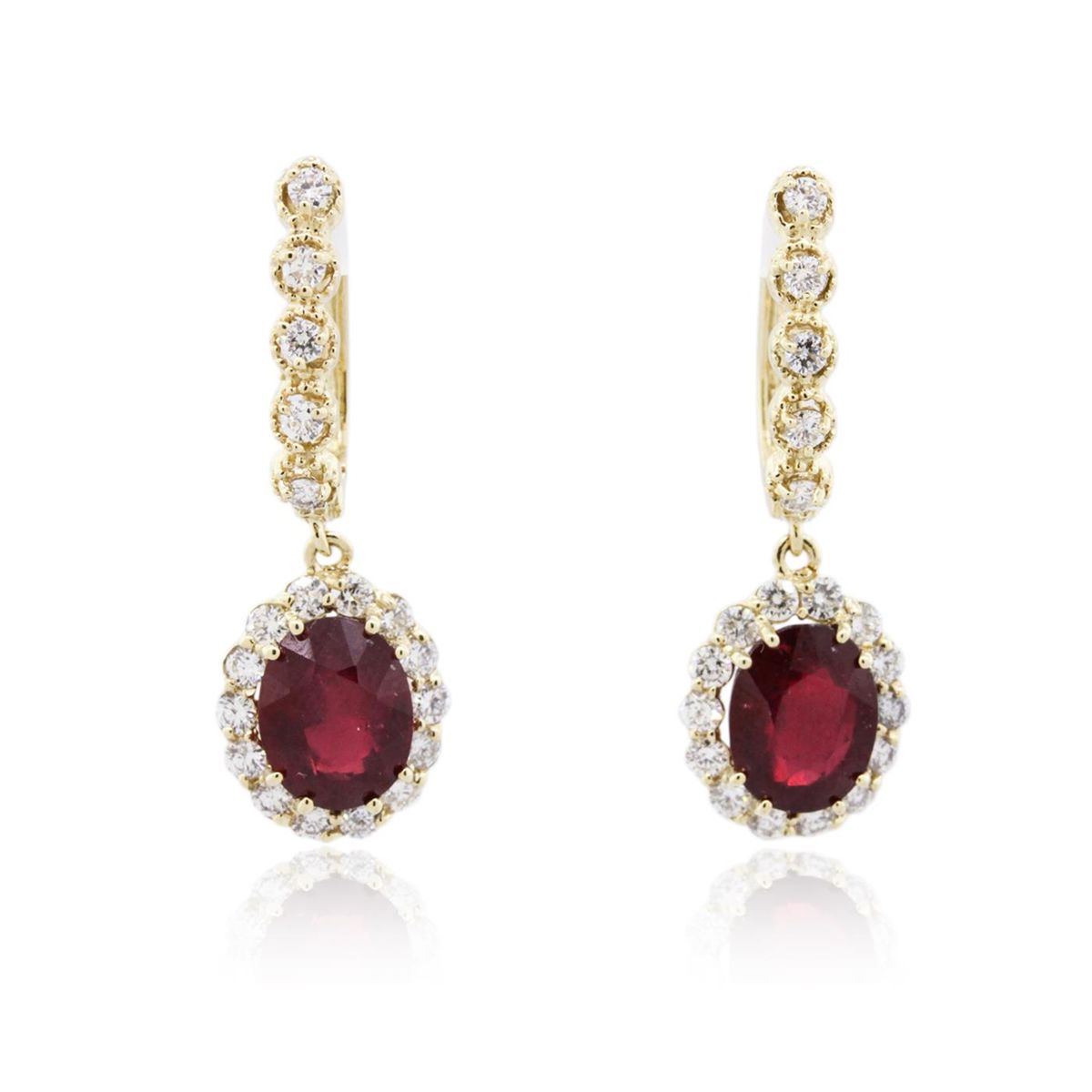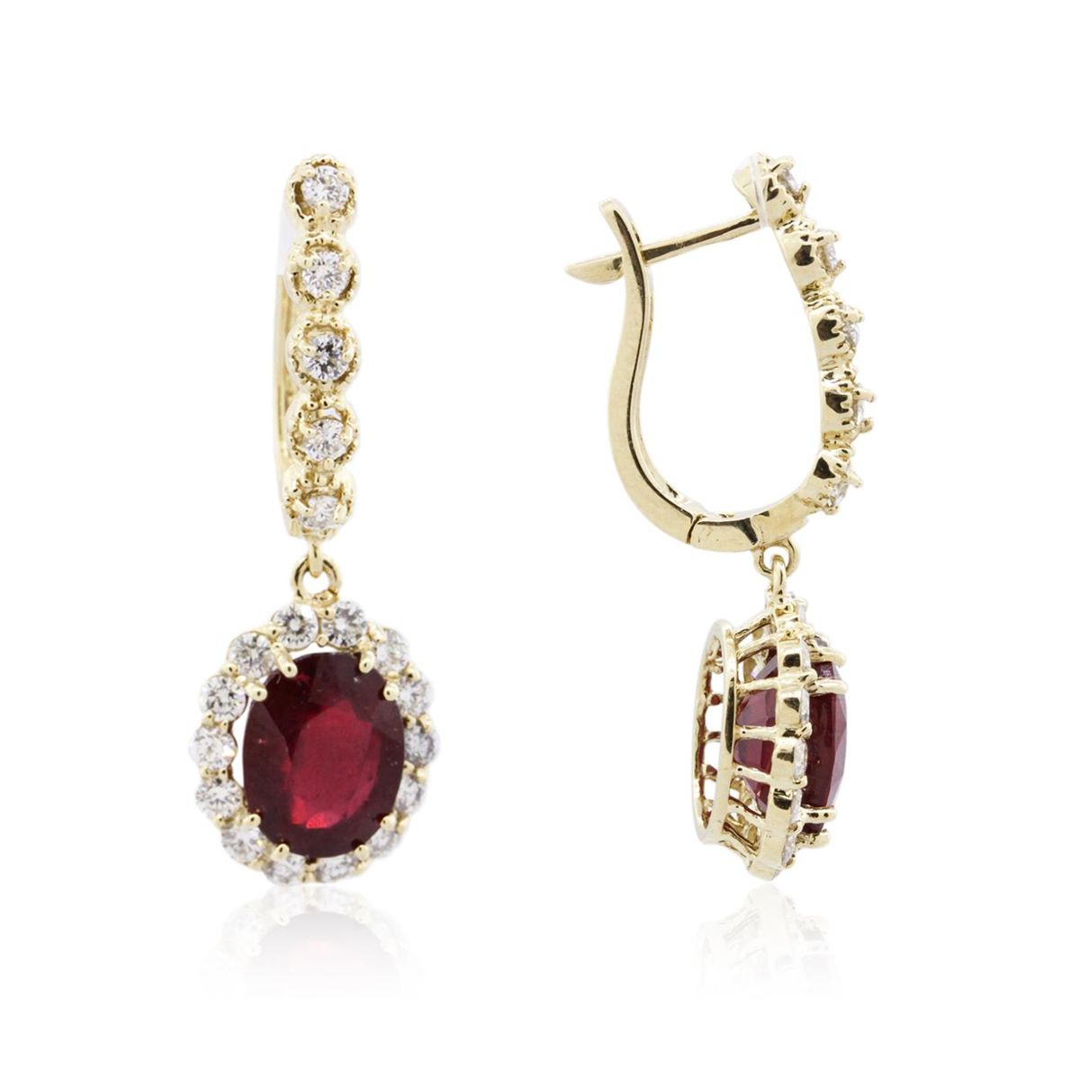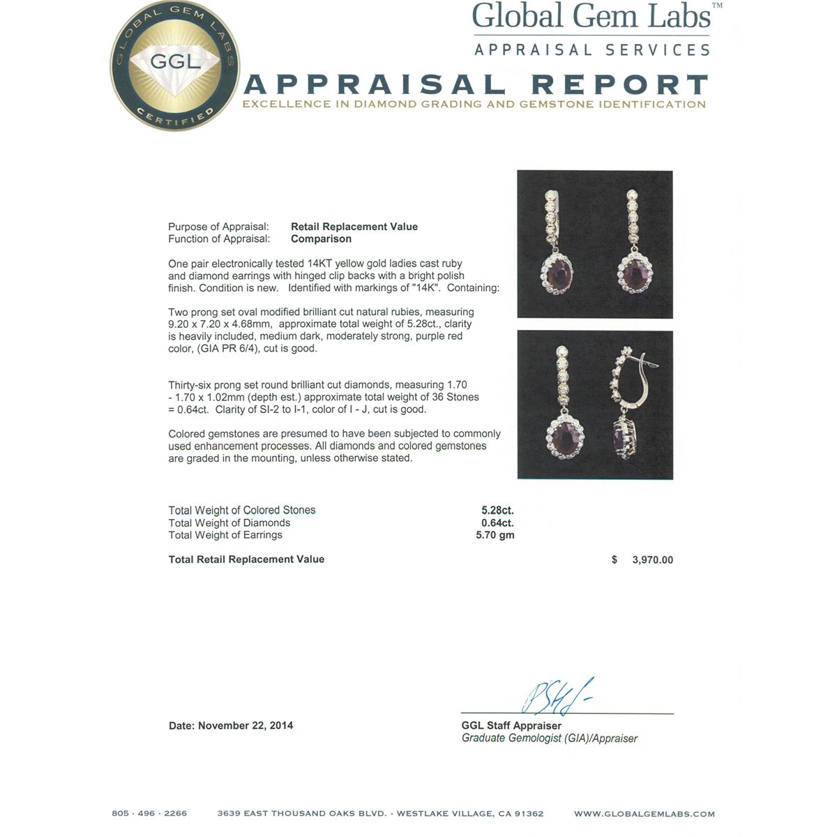 One pair electronically tested 14KT yellow gold ladies cast ruby and diamond earrings with hinged clip backs with a bright polish finish. Identified with markings of "14K". Condition is new. Containing: Two prong set oval modified brilliant cut natural rubies, measuring 9.20 x 7.20 x 4.68mm, approximate total weight of 5.28ct., clarity is heavily included, medium dark, moderately strong, purple red color, (GIA PR 6/4), cut is good. Thirty-Six prong set round brilliant cut diamonds, measuring 1.70 - 1.70 x 1.02mm (depth est.) approximate total weight of 36 Stones = 0.64ct. Clarity: SI-2 to I-1. Color: I - J, Cut is Good. Colored gemstones are presumed to have been subjected to commonly used enhancement processes. All diamonds and colored gemstones are graded in the mounting, unless otherwise stated. Total Weight of Colored Stones 5.28ct. Total Weight of Diamonds 0.64ct. Total Weight of Earrings 5.70 grams. GGL Appraised at $3,970.00.