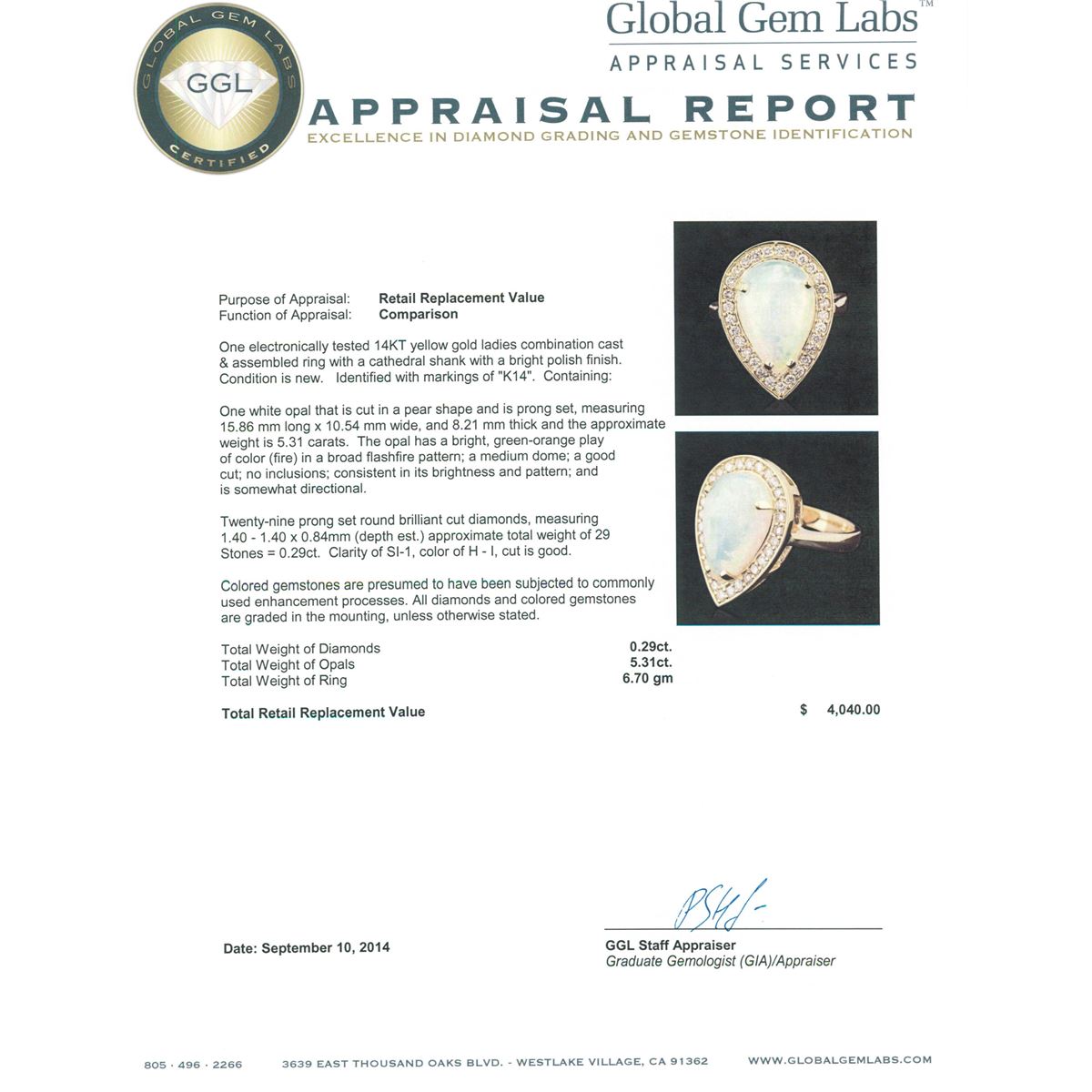 One electronically tested 14KT yellow gold ladies combination cast & assembled ring with a cathedral shank with a bright polish finish. Identified with markings of "K14". Condition is new. Containing: One white opal that is cut in a pear shape and is prong set, measuring 15.86 mm long x 10.54 mm wide, and 8.21 mm thick and the approximate weight is 5.31 carats. The opal has a bright, green-orange play of color (fire) in a broad flashfire pattern; a medium dome; a good cut; no inclusions; consistent in its brightness and pattern; and is somewhat directional. Twenty-Nine prong set round brilliant cut diamonds, measuring 1.40 - 1.40 x 0.84mm (depth est.) approximate total weight of 29 Stones = 0.29ct. Clarity: SI-1. Color: H - I, Cut is Good. Colored gemstones are presumed to have been subjected to commonly used enhancement processes. All diamonds and colored gemstones are graded in the mounting, unless otherwise stated. Total Weight of Diamonds 0.29ct. Total Weight of Opals 5.31ct. Total Weight of Ring 6.70 grams. GGL Appraised at $4,040.00.