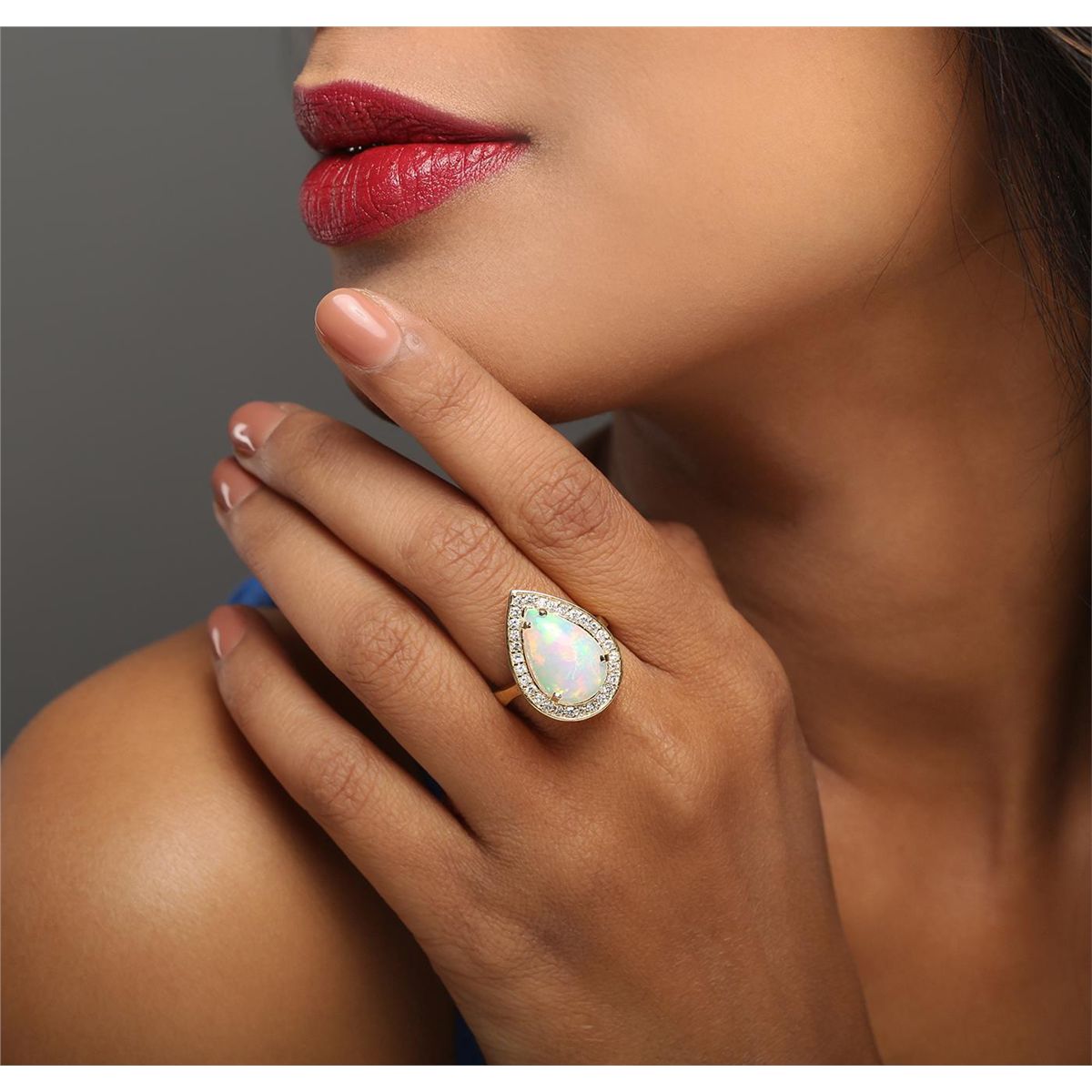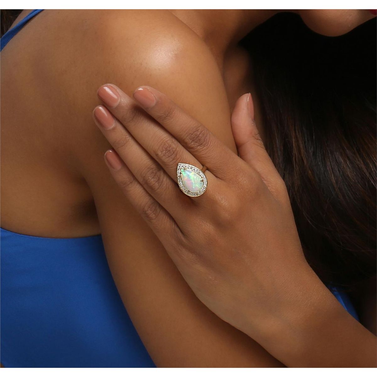 One electronically tested 14KT yellow gold ladies combination cast & assembled ring with a cathedral shank with a bright polish finish. Identified with markings of "K14". Condition is new. Containing: One white opal that is cut in a pear shape and is prong set, measuring 15.86 mm long x 10.54 mm wide, and 8.21 mm thick and the approximate weight is 5.31 carats. The opal has a bright, green-orange play of color (fire) in a broad flashfire pattern; a medium dome; a good cut; no inclusions; consistent in its brightness and pattern; and is somewhat directional. Twenty-Nine prong set round brilliant cut diamonds, measuring 1.40 - 1.40 x 0.84mm (depth est.) approximate total weight of 29 Stones = 0.29ct. Clarity: SI-1. Color: H - I, Cut is Good. Colored gemstones are presumed to have been subjected to commonly used enhancement processes. All diamonds and colored gemstones are graded in the mounting, unless otherwise stated. Total Weight of Diamonds 0.29ct. Total Weight of Opals 5.31ct. Total Weight of Ring 6.70 grams. GGL Appraised at $4,040.00.