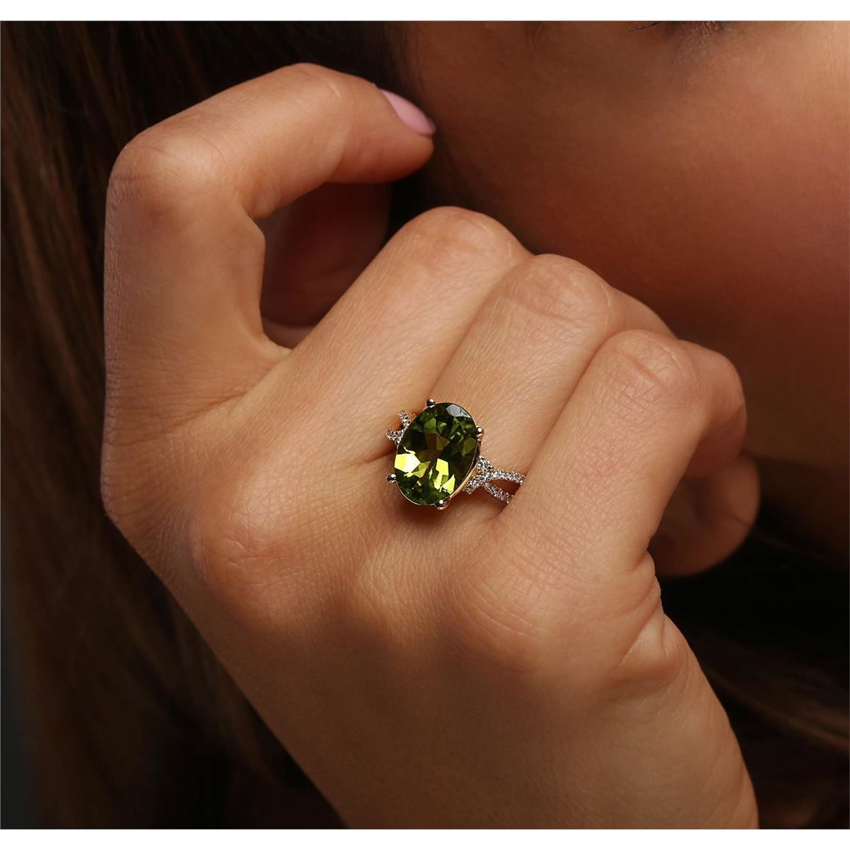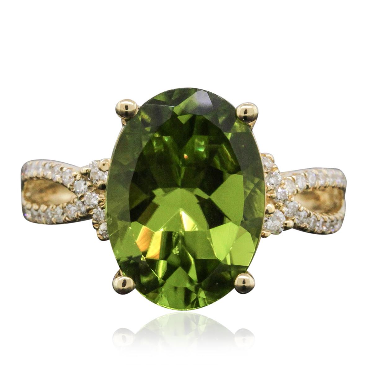 One ring featuring: 14KT yellow gold weighing 4.32 grams containing one peridot with a total weight of 5.38ct and 38 round cut diamonds with a total weight of 0.23cts.