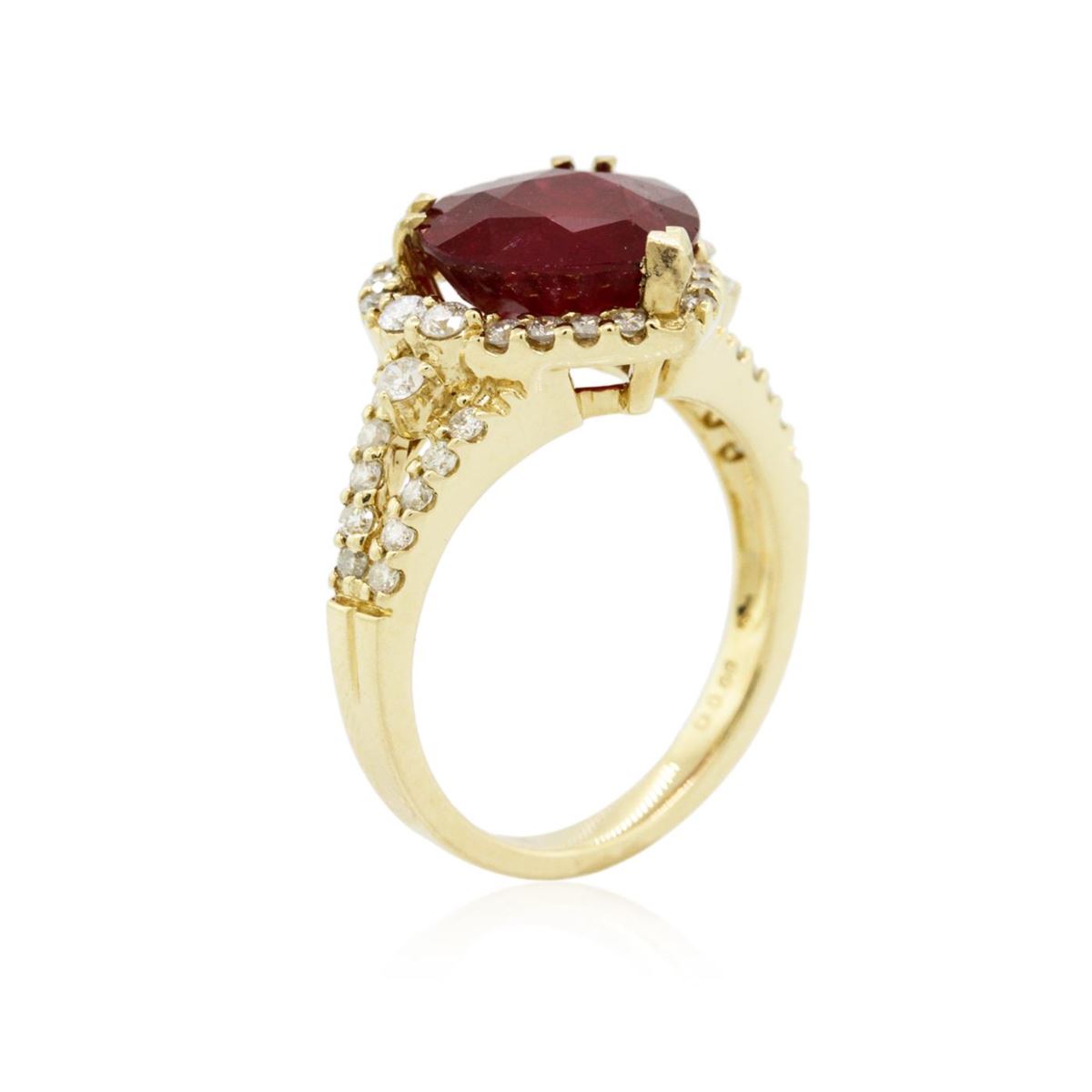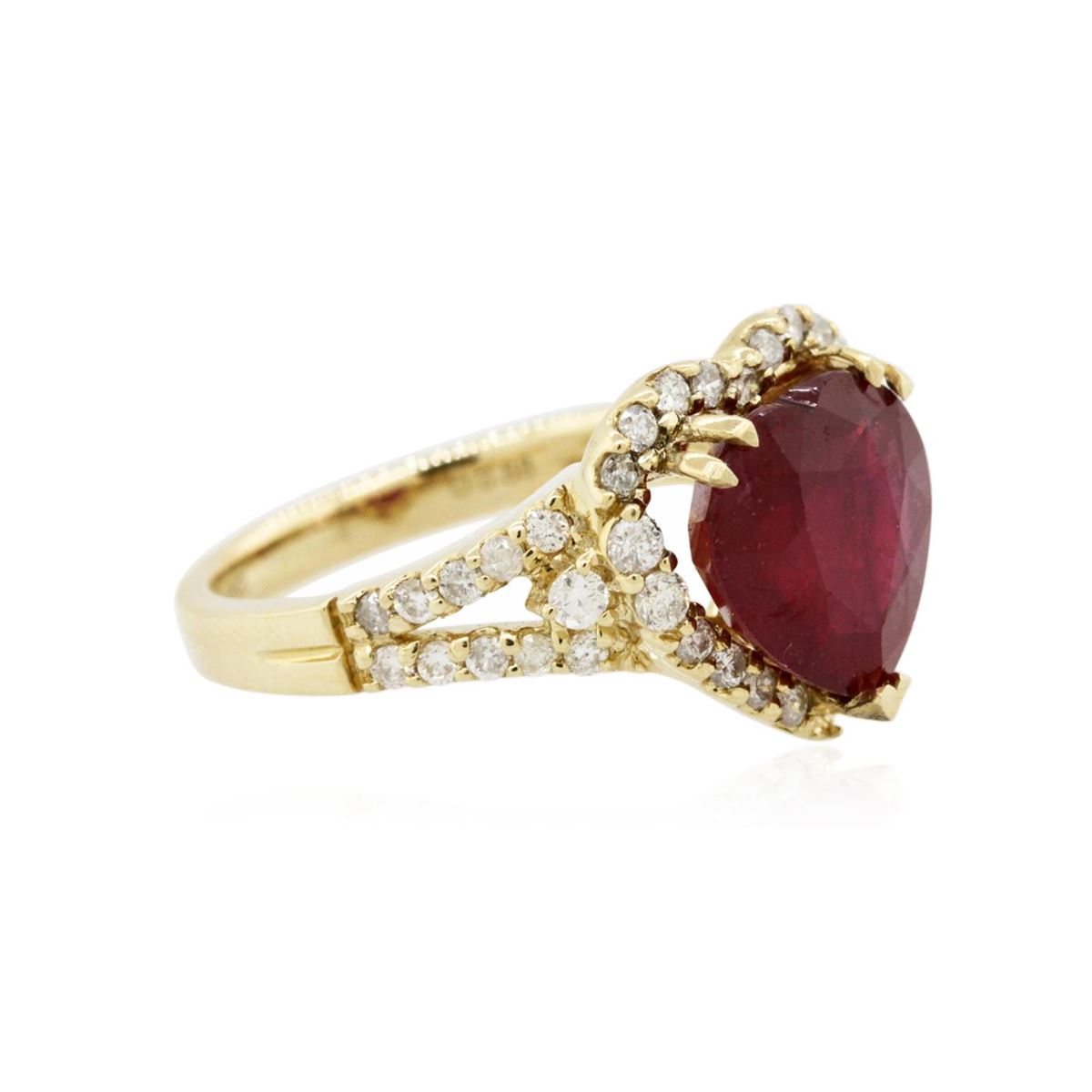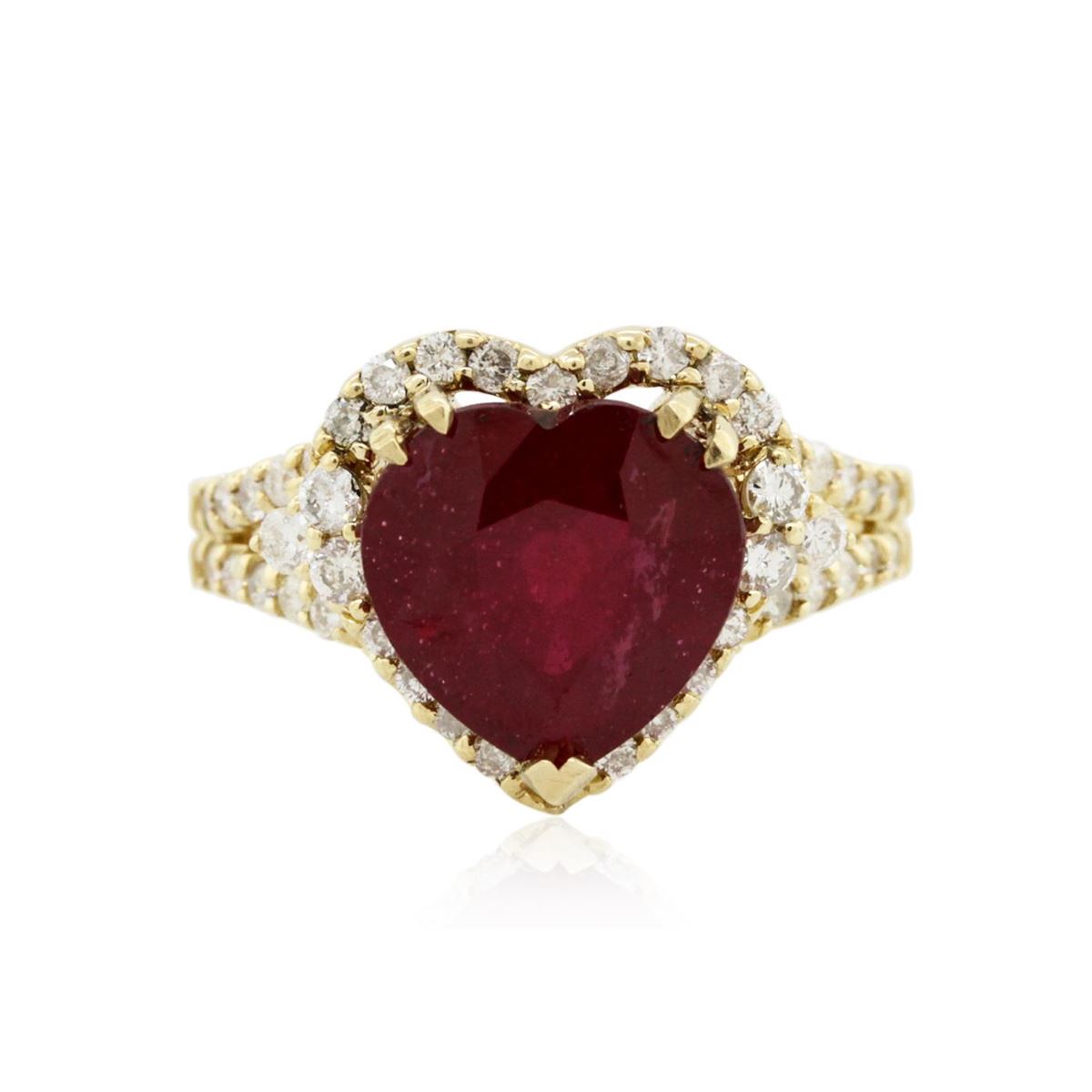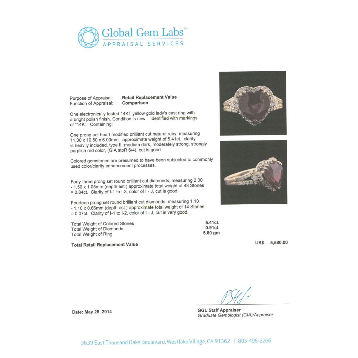 One electronically tested 14KT yellow gold Ladies cast ring with a bright polish finish. Condition is new. Identified with markings of "14K". Containing: One prong set heart modified brilliant cut natural ruby, measuring 11.00 x 10.50 x 6.00mm, approximate weight of 5.41ct., clarity is heavily included, type II, medium dark, moderately strong, strongly purplish red color, (GIA stpR 6/4), cut is good. Colored gemstones are presumed to have been subjected to commonly used color/clarity enhancement processes. Forty-Three prong set round brilliant cut diamonds, measuring 2.00 - 1.50 x 1.05mm (depth est.) approximate. Total Weight of 43 Stones = 0.84ct. Clarity: I-1 to I-3. Color: I - J, Cut is Good. Fourteen prong set round brilliant cut diamonds, measuring 1.10 - 1.10 x 0.66mm (depth est.) approximate. Total Weight of 14 Stones = 0.07ct. Clarity: I-1 to I-2. Color: I - J, Cut is Very Good. Total Weight of Colored Stones 5.41ct. Total Weight of Diamonds 0.91ct. Total Weight of Ring 5.80 Grams. GGL Appraised at $5,580.00.