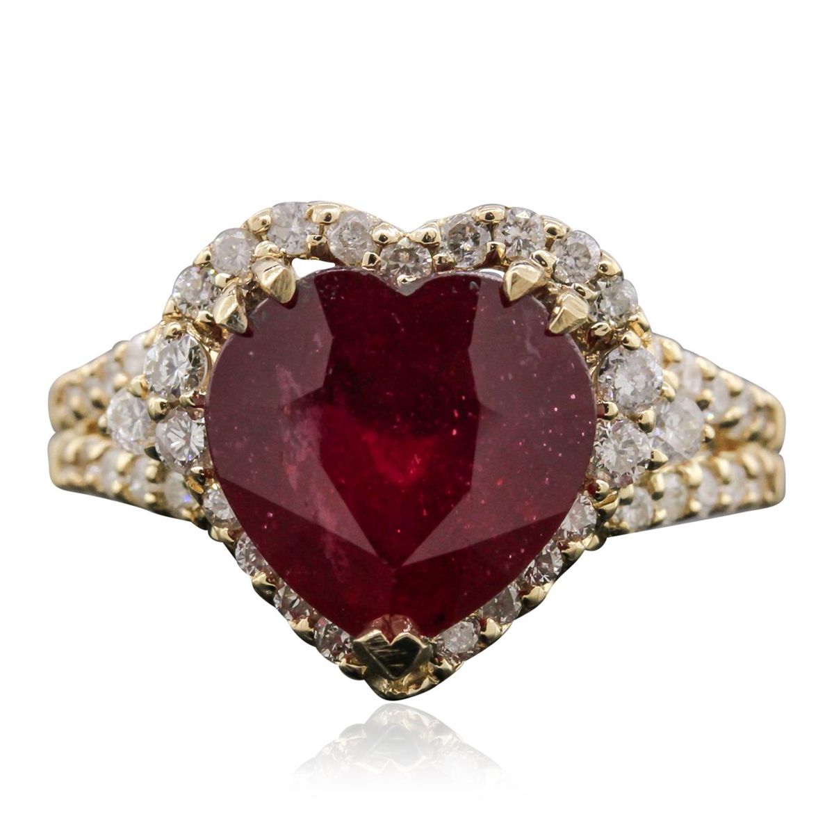 One electronically tested 14KT yellow gold Ladies cast ring with a bright polish finish. Condition is new. Identified with markings of "14K". Containing: One prong set heart modified brilliant cut natural ruby, measuring 11.00 x 10.50 x 6.00mm, approximate weight of 5.41ct., clarity is heavily included, type II, medium dark, moderately strong, strongly purplish red color, (GIA stpR 6/4), cut is good. Colored gemstones are presumed to have been subjected to commonly used color/clarity enhancement processes. Forty-Three prong set round brilliant cut diamonds, measuring 2.00 - 1.50 x 1.05mm (depth est.) approximate. Total Weight of 43 Stones = 0.84ct. Clarity: I-1 to I-3. Color: I - J, Cut is Good. Fourteen prong set round brilliant cut diamonds, measuring 1.10 - 1.10 x 0.66mm (depth est.) approximate. Total Weight of 14 Stones = 0.07ct. Clarity: I-1 to I-2. Color: I - J, Cut is Very Good. Total Weight of Colored Stones 5.41ct. Total Weight of Diamonds 0.91ct. Total Weight of Ring 5.80 Grams. GGL Appraised at $5,580.00.