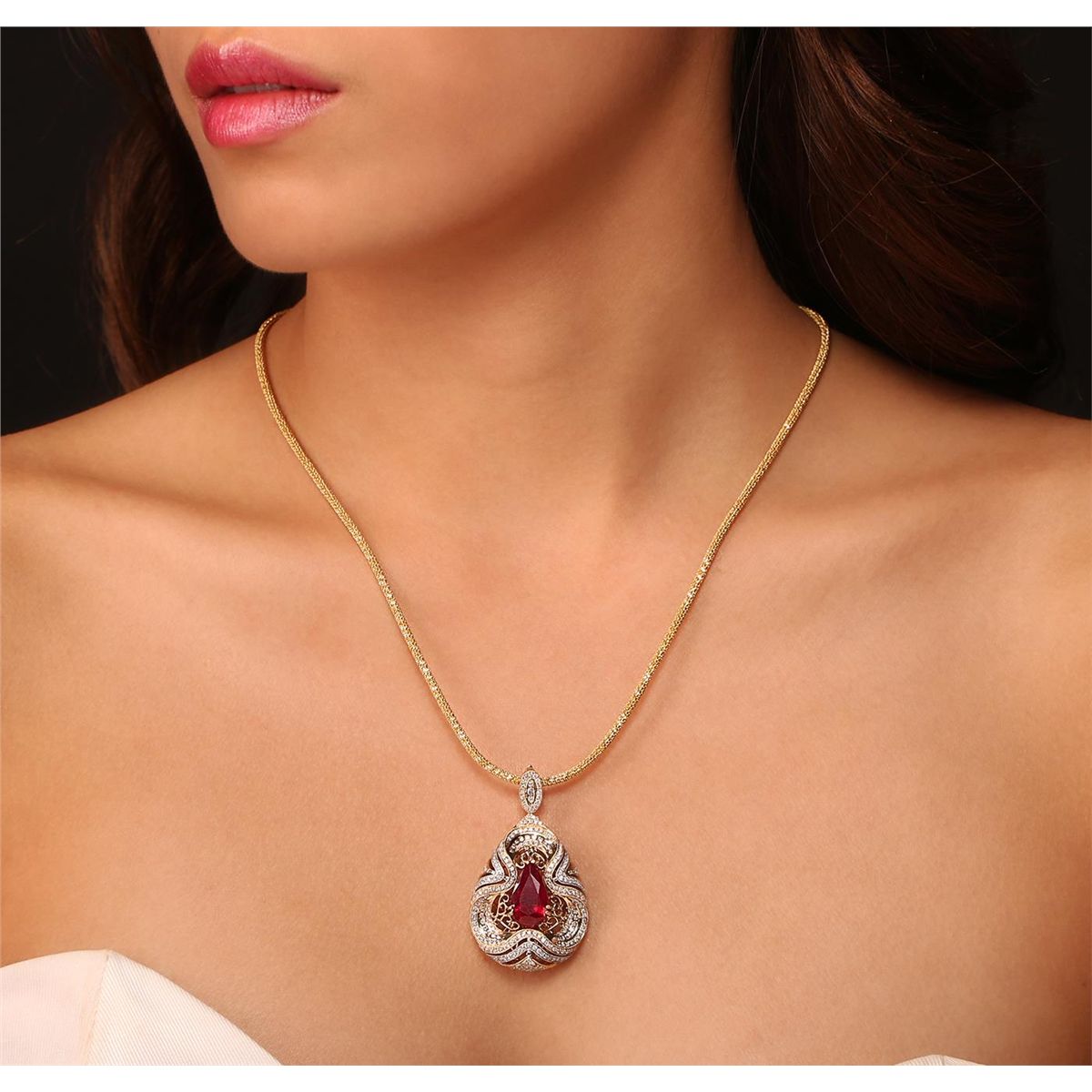 One electronically tested 14KT yellow gold Ladies combination cast & die struck pendant & chain 16.0" long, medium fancy cable link with a lobster claw clasp with a bright polish finish. Condition is new. Identified with markings of "14K". Containing: One prong set pear modified brilliant cut natural ruby, measuring 14.00 x 9.00 x 5.85mm, approximate weight of 5.44ct., clarity is heavily included, type II, medium, moderately strong, strongly purplish red color, (GIA stpR 5/4), cut is good. Colored gemstones are presumed to have been subjected to commonly used color/clarity enhancement processes. Two Hundred Eighty-Two prong set round brilliant cut diamonds, measuring 1.50 - 1.30 x 0.84mm (depth est.) approximate. Total Weight of 282 Stones = 1.51ct. Clarity: I-1 to I-2. Color: H - I, Cut is Good. Total Weight of Colored Stones 5.44ct. Total Weight of Diamonds 1.51ct. Total Weight of Pendant & Chain 22.20 grams. GGL Appraised at $14,035.00.