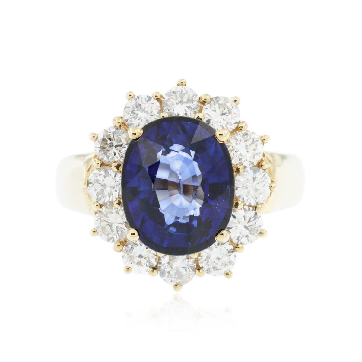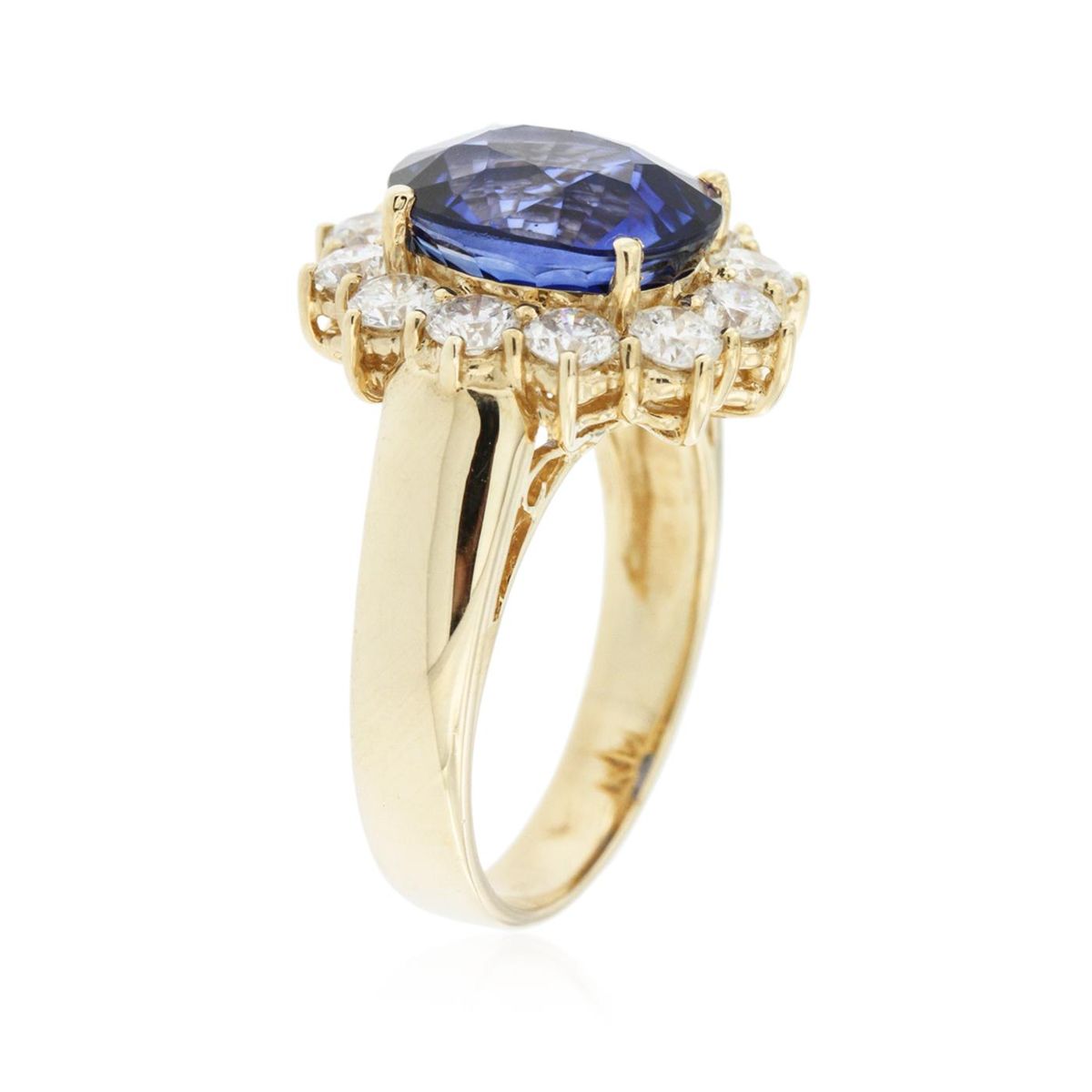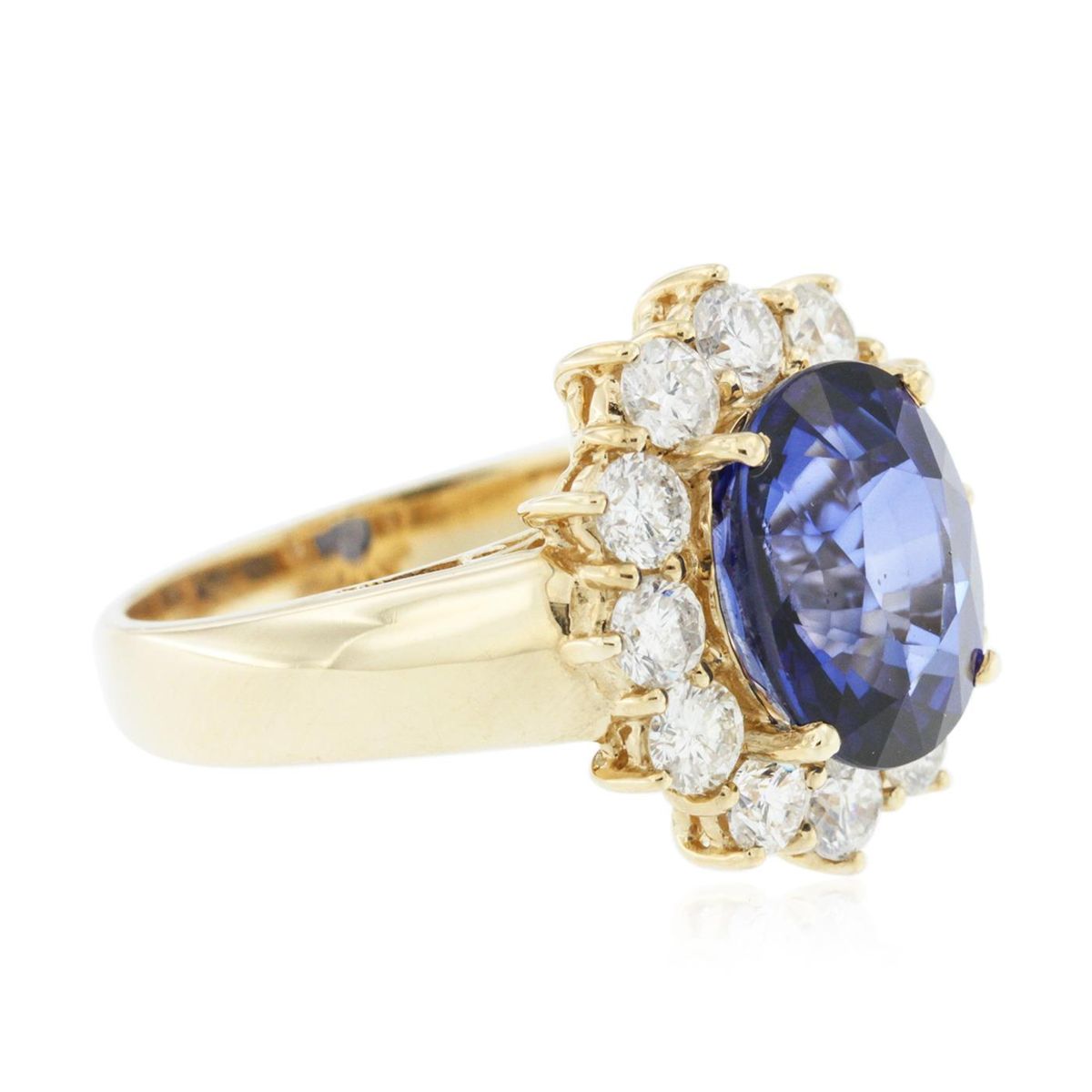 One electronically tested 14KT yellow gold Ladies combination cast & assembled ring with a bright polish finish. Condition is new. Identified with markings of "14K". Containing: Twelve prong set round brilliant cut diamonds, measuring 2.90 - 2.90 x 1.74mm (depth est.) approximate. Total Weight of 12 Stones = 1.52ct. Clarity: I-1 to I-2. Color: H - J, Cut is Good. One prong set oval modified brilliant cut natural tanzanite, measuring 11.00 x 9.00 x 6.20mm, exact weight 5.48ct., clarity is eye clean, type I, medium dark, moderately strong, violetish blue color, (GIA vB 6/4), cut is very good. Colored gemstones are presumed to have been subjected to commonly used color/clarity enhancement processes. Total Weight of Colored Stones 5.48ct. Total Weight of Diamonds 1.52ct. Total Weight of Ring 7.30 grams. GGL Appraised at $12,325.00.