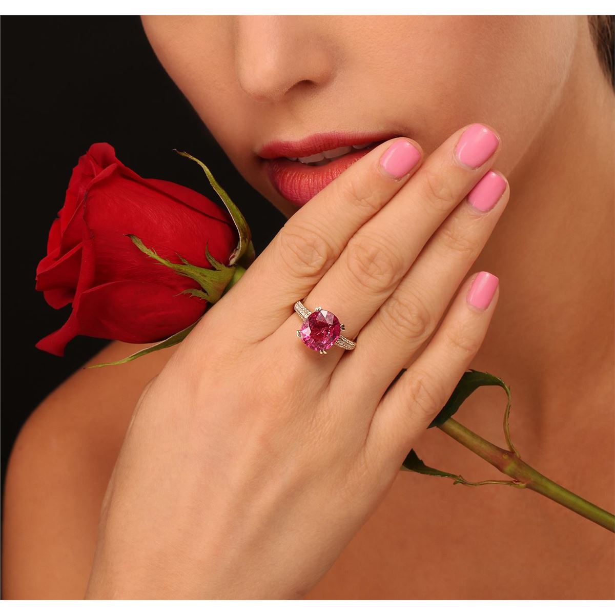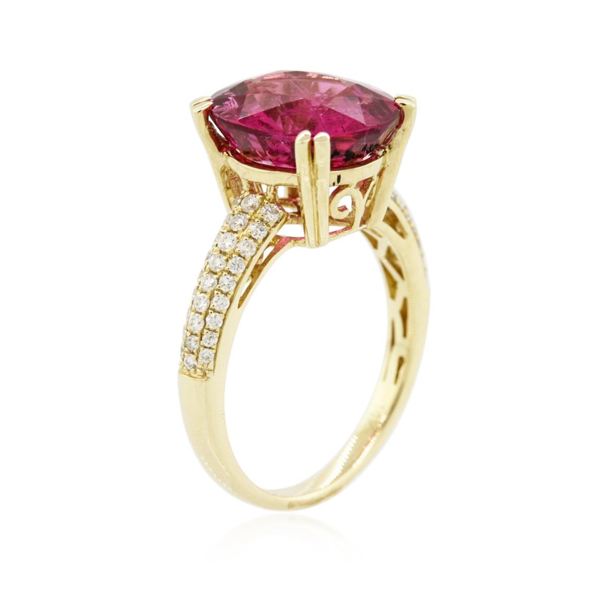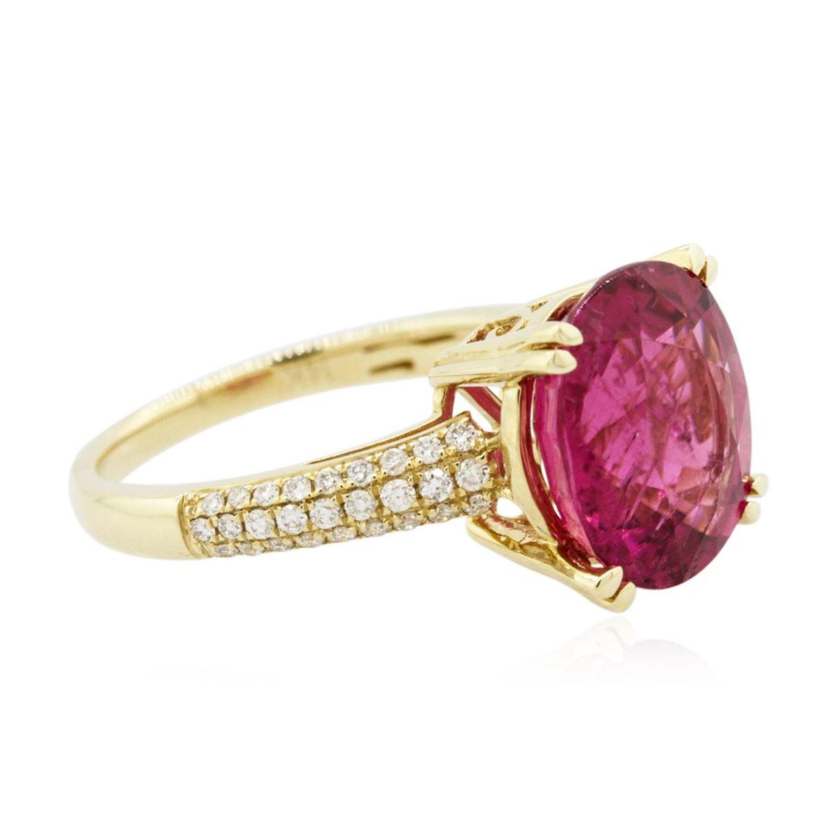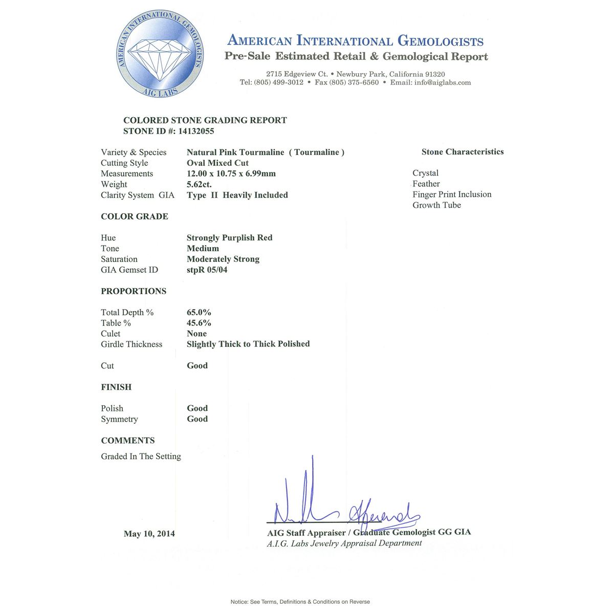 One electronically tested 14KT yellow gold ladies cast pink tourmaline and diamond ring with a bright polish finish. Condition is new, good workmanship. The featured pink tourmaline is supported by diamond set shoulders and completed by a two millimeter wide band. Identified with markings of "14K". Containing: One prong set oval mixed cut natural pink tourmaline, measuring 12.00 x 10.75 x 6.99mm, approximate weight of 5.62ct., clarity is heavily included, type II, medium, moderately strong, strongly purplish red color, (GIA stpR 5/4), cut is good. Transmitting light somewhat diffusely, transparent to translucent. Naturally occurring internal & external characteristics are present. Colored Stone Grading Report attached. Graded in the setting. This color of tourmaline is commonly heated or irradiated to improve or change the color. Whether or not this gemstone has been heater or irradiated cannot currently be determined. Fifty-Four pav‚ set round brilliant cut diamonds, measuring 1.30 - 1.00 x 0.69mm (depth est.) approximate. Total Weight of 54 Stones = 0.41ct. Graded in the setting. Clarity: SI-2 to I-2. Color: F - H. Total Weight of Colored Stones 5.62ct. Total Weight of Diamonds 0.41ct. Total Weight of Ring 4.80grams. AIG Appraised at $3,870.00.