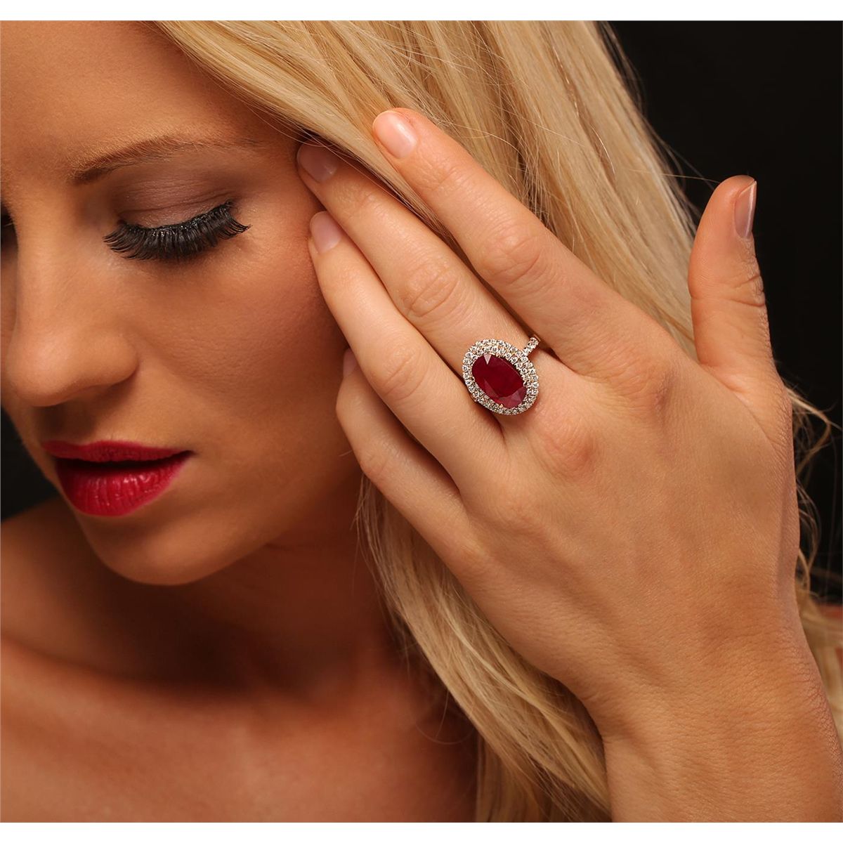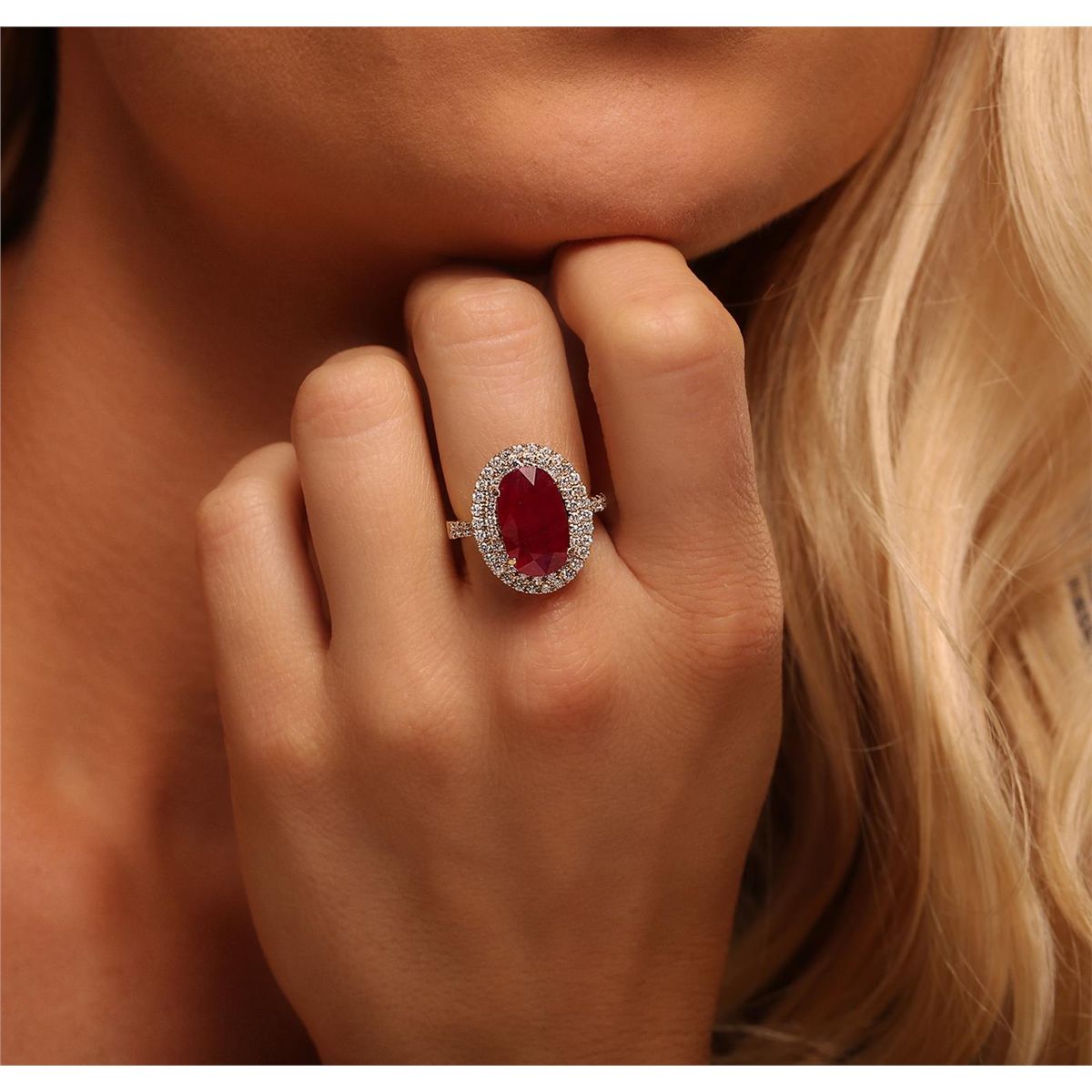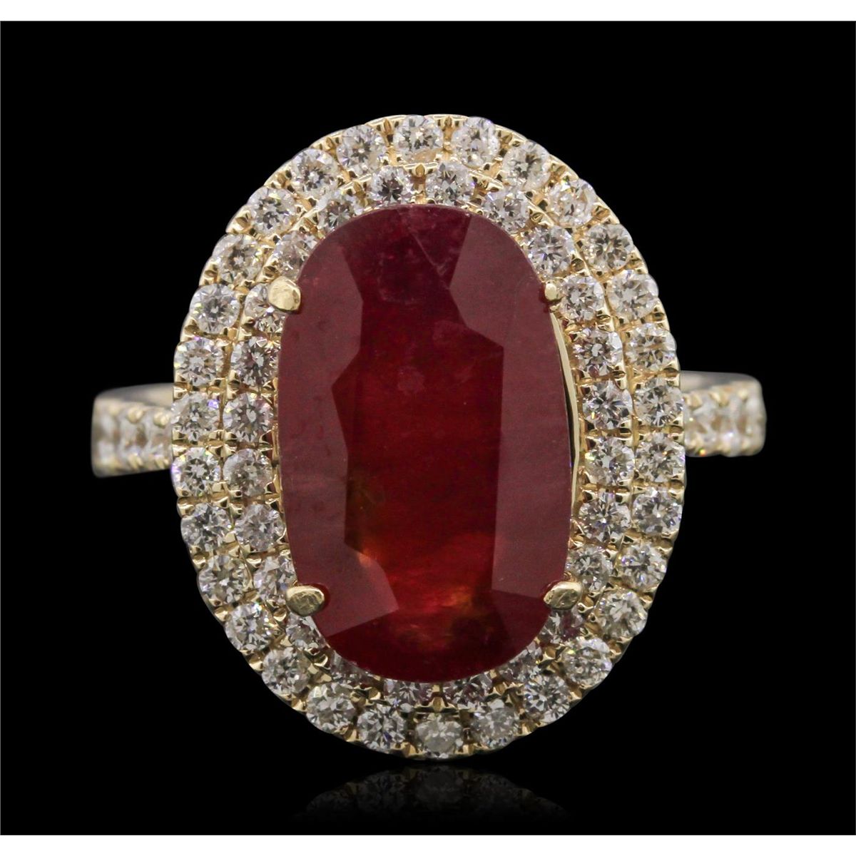 One electronically tested 14KT yellow gold Ladies combination cast & assembled ring with a bright polish finish. Condition is new. Identified with markings of "14K". Containing: One prong set oval modified mixed cut natural ruby, measuring 14.00 x 9.00 x 4.30mm, approximate weight of 5.70ct., clarity is heavily included, type II, medium dark, moderately strong, strongly purplish red color, (GIA stpR 6/4), cut is fair. Colored gemstones are presumed to have been subjected to commonly used color/clarity enhancement processes. Sixty-Two prong set round brilliant cut diamonds, measuring 2.00 - 1.50 x 1.05mm (depth est.) approximate. Total Weight of 62 Stones = 1.12ct. Clarity: I-1 to I-2. Color: I - J, Cut is Good. Total Weight of Colored Stones 5.70ct. Total Weight of Diamonds 1.12ct. Total Weight of Ring 7.30 grams. GGL Appraised at $6,545.00.