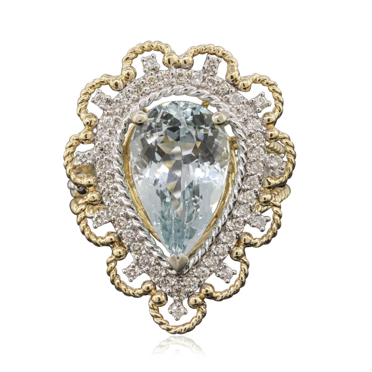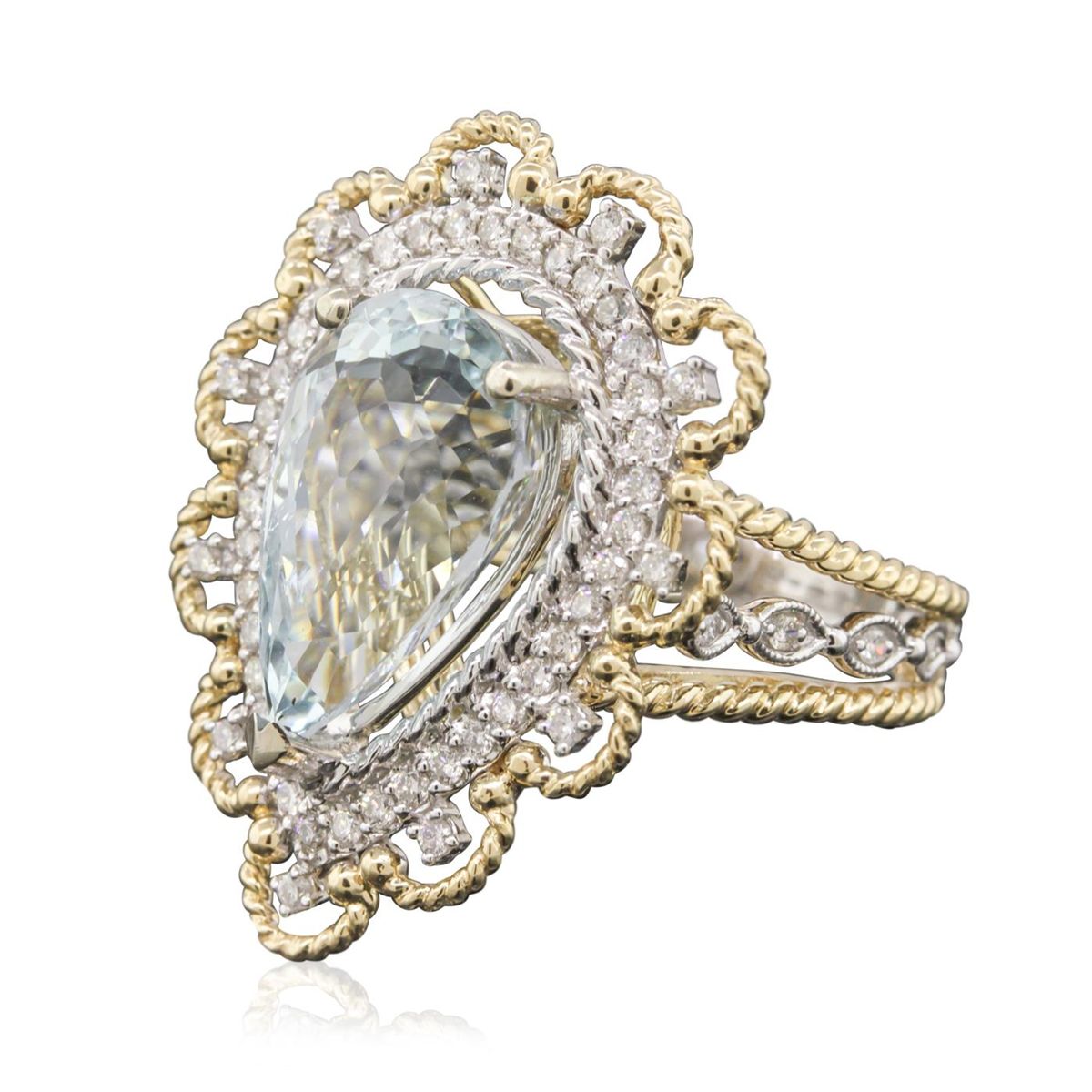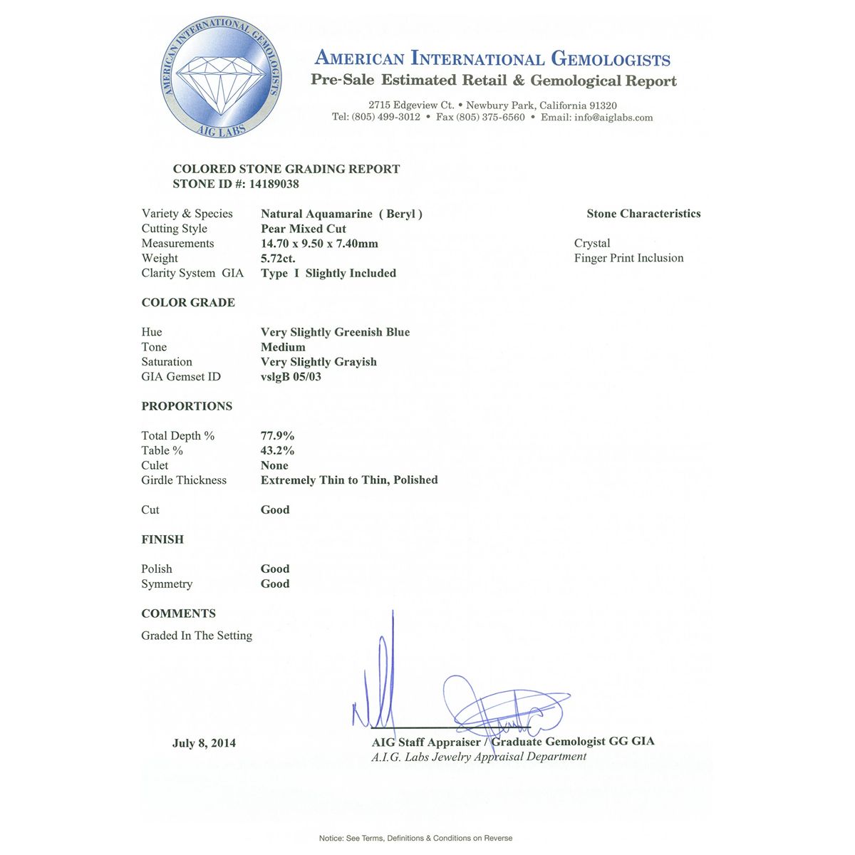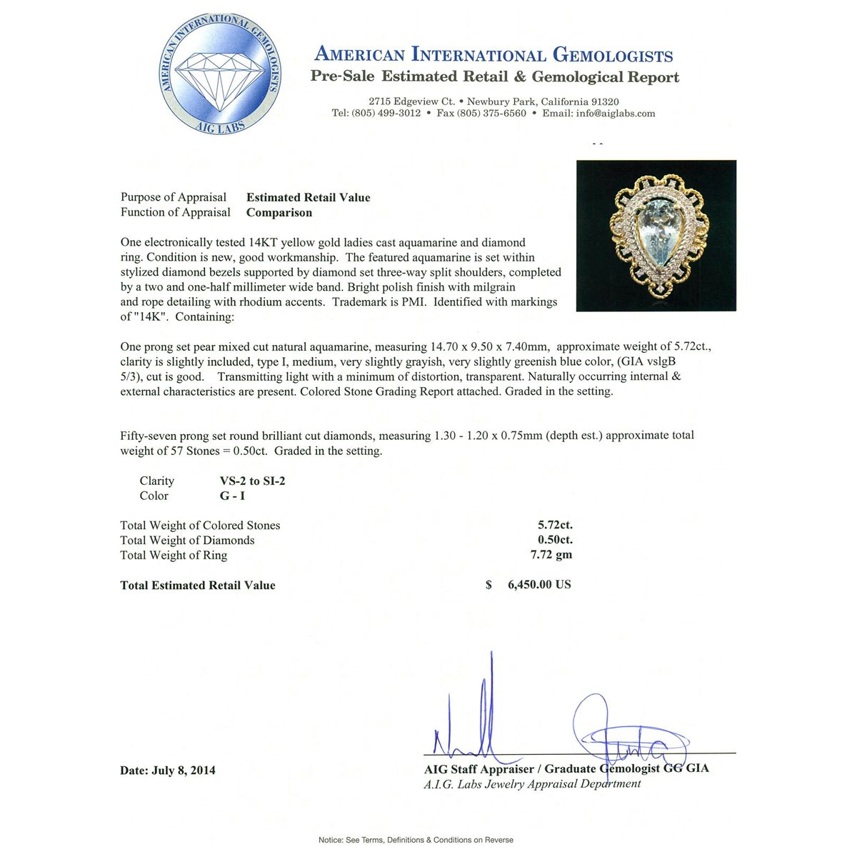 One electronically tested 14KT yellow gold ladies cast aquamarine and diamond ring. The featured aquamarine is set within stylized diamond bezels supported by diamond set three-way split shoulders, completed by a two and one-half millimeter wide band. Bright polish finish with milgrain and rope detailing with rhodium accents. Trademark is PMI. Identified with markings of "14K". Condition is new, good workmanship. Containing: One prong set pear mixed cut natural aquamarine, measuring 14.70 x 9.50 x 7.40mm, approximate weight of 5.72ct., clarity is slightly included, type I, medium, very slightly grayish, very slightly greenish blue color, (GIA vslgB 5/3), cut is good. Transmitting light with a minimum of distortion, transparent. Naturally occurring internal & external characteristics are present. Colored Stone Grading Report attached. Graded in the setting. Fifty-Seven prong set round brilliant cut diamonds, measuring 1.30 - 1.20 x 0.75mm (depth est.) approximate total weight of 57 Stones = 0.50ct. Graded in the setting. Clarity: VS-2 to SI-2 . Color: G - I. Total Weight of Colored Stones 5.72ct. Total Weight of Diamonds 0.50ct. Total Weight of Ring 7.72 grams. AIG Appraised at $6,450.00.