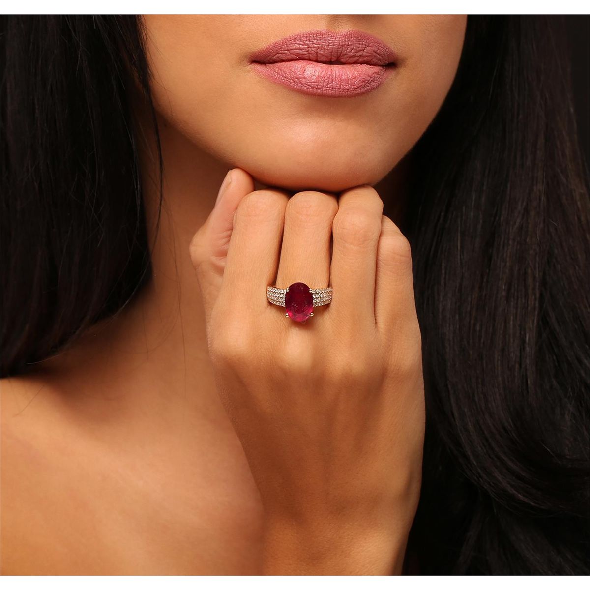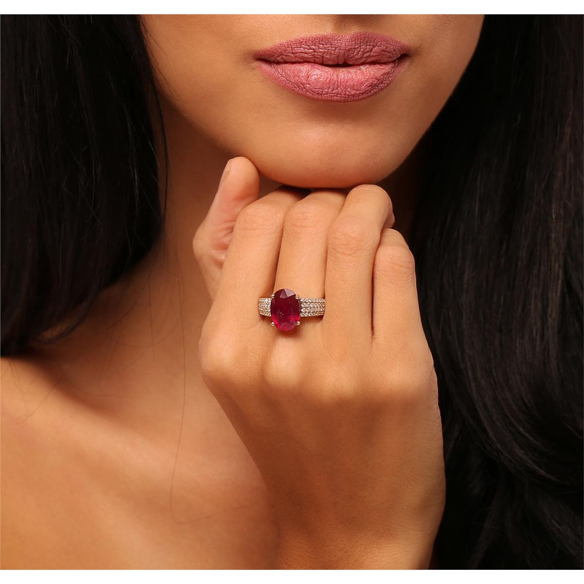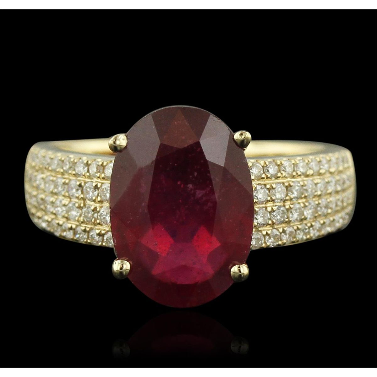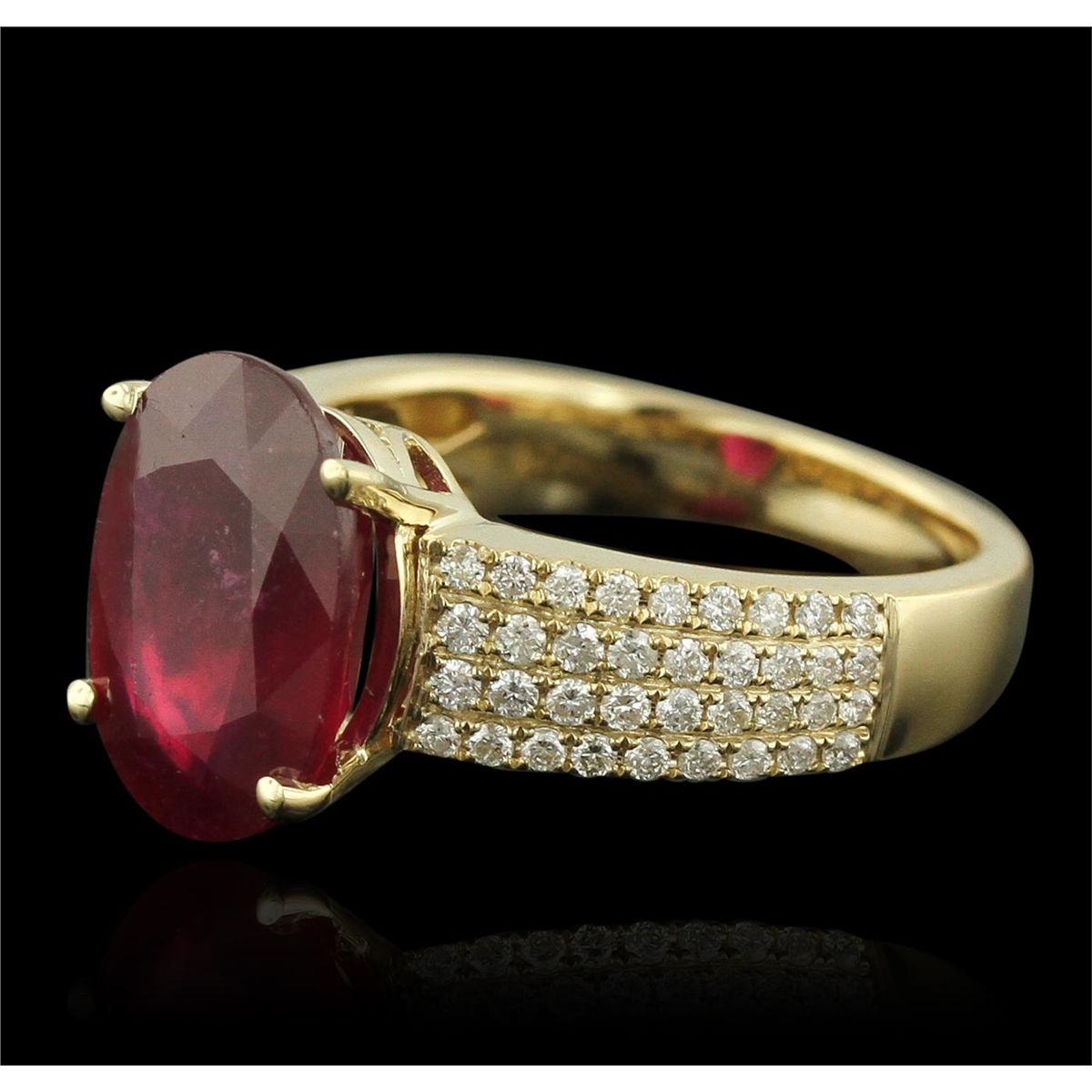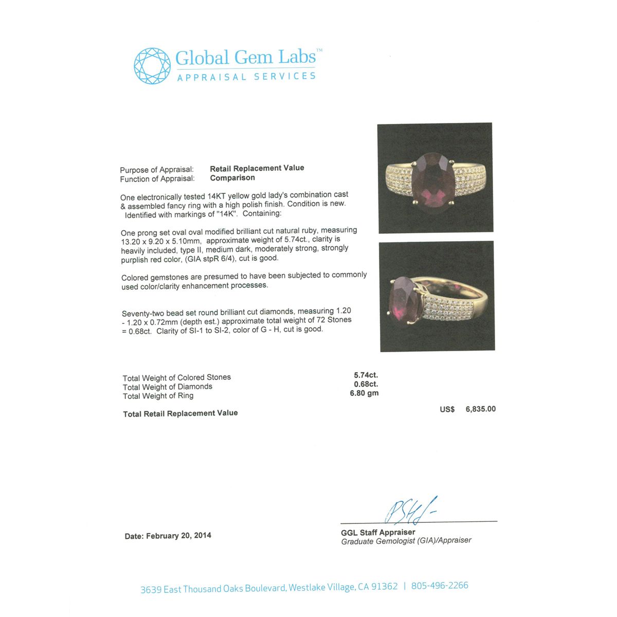 One electronically tested 14KT yellow gold Ladies combination cast & assembled fancy ring with a high polish finish. Condition is new. Identified with markings of "14K". Containing: One prong set oval modified brilliant cut natural ruby, measuring 13.20 x 9.20 x 5.10mm, approximate weight of 5.74ct., clarity is heavily included, type II, medium dark, moderately strong, strongly purplish red color, (GIA stpR 6/4), cut is good. Colored gemstones are presumed to have been subjected to commonly used color/clarity enhancement processes. Seventy-Two bead set round brilliant cut diamonds, measuring 1.20 - 1.20 x 0.72mm (depth est.) approximate. Total Weight of 72 Stones = 0.68ct. Clarity: SI-1 to SI-2. Color: G - H, Cut is Good. Total Weight of Colored Stones 5.74ct. Total Weight of Diamonds 0.68ct. Total Weight of Ring 6.80 grams. GGL Appraised at $6,835.00.