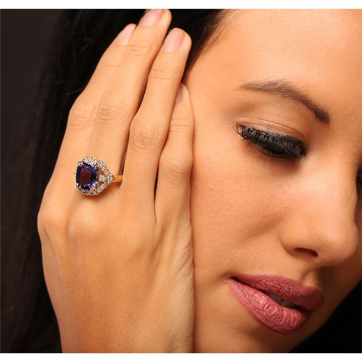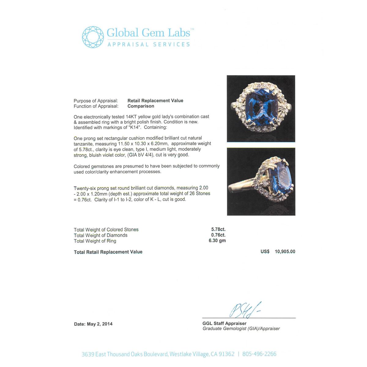 One electronically tested 14KT yellow gold Ladies combination cast & assembled ring with a bright polish finish. Condition is new. Identified with markings of "K14". Containing: One prong set rectangular cushion modified brilliant cut natural tanzanite, measuring 11.50 x 10.30 x 6.20mm, approximate weight of 5.78ct., clarity is eye clean, type I, medium light, moderately strong, bluish violet color, (GIA bV 4/4), cut is very good. Colored gemstones are presumed to have been subjected to commonly used color/clarity enhancement processes. Twenty-Six prong set round brilliant cut diamonds, measuring 2.00 - 2.00 x 1.20mm (depth est.) approximate. Total Weight of 26 Stones = 0.76ct. Clarity: I-1 to I-2. Color: K - L, Cut is Good. Total Weight of Colored Stones 5.78ct. Total Weight of Diamonds 0.76ct. Total Weight of Ring 6.30 grams. GGL Appraised at $10,905.00.