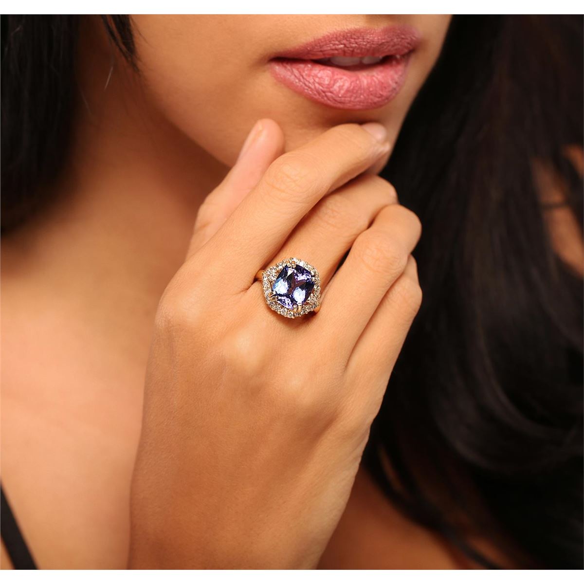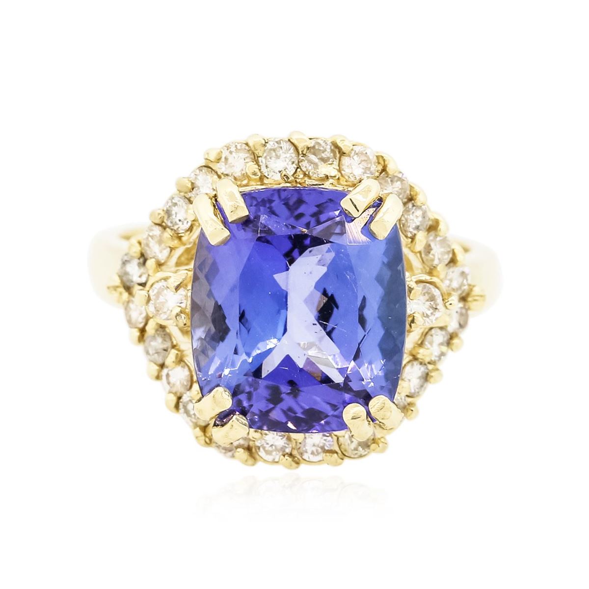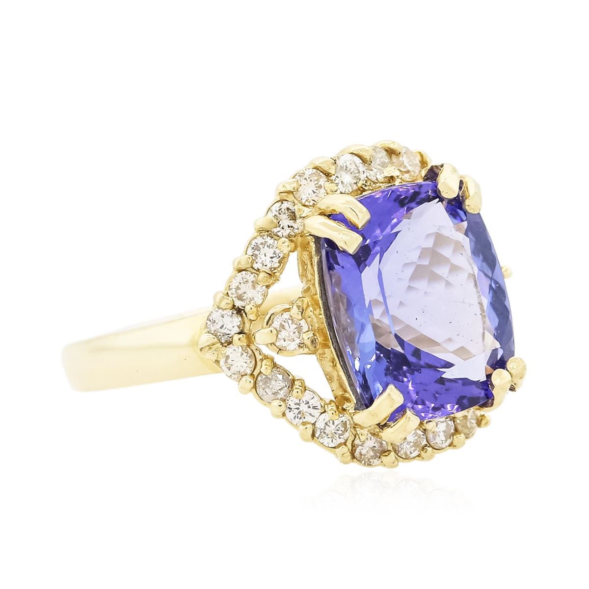 One electronically tested 14KT yellow gold Ladies combination cast & assembled ring with a bright polish finish. Condition is new. Identified with markings of "K14". Containing: One prong set rectangular cushion modified brilliant cut natural tanzanite, measuring 11.50 x 10.30 x 6.20mm, approximate weight of 5.78ct., clarity is eye clean, type I, medium light, moderately strong, bluish violet color, (GIA bV 4/4), cut is very good. Colored gemstones are presumed to have been subjected to commonly used color/clarity enhancement processes. Twenty-Six prong set round brilliant cut diamonds, measuring 2.00 - 2.00 x 1.20mm (depth est.) approximate. Total Weight of 26 Stones = 0.76ct. Clarity: I-1 to I-2. Color: K - L, Cut is Good. Total Weight of Colored Stones 5.78ct. Total Weight of Diamonds 0.76ct. Total Weight of Ring 6.30 grams. GGL Appraised at $10,905.00.
