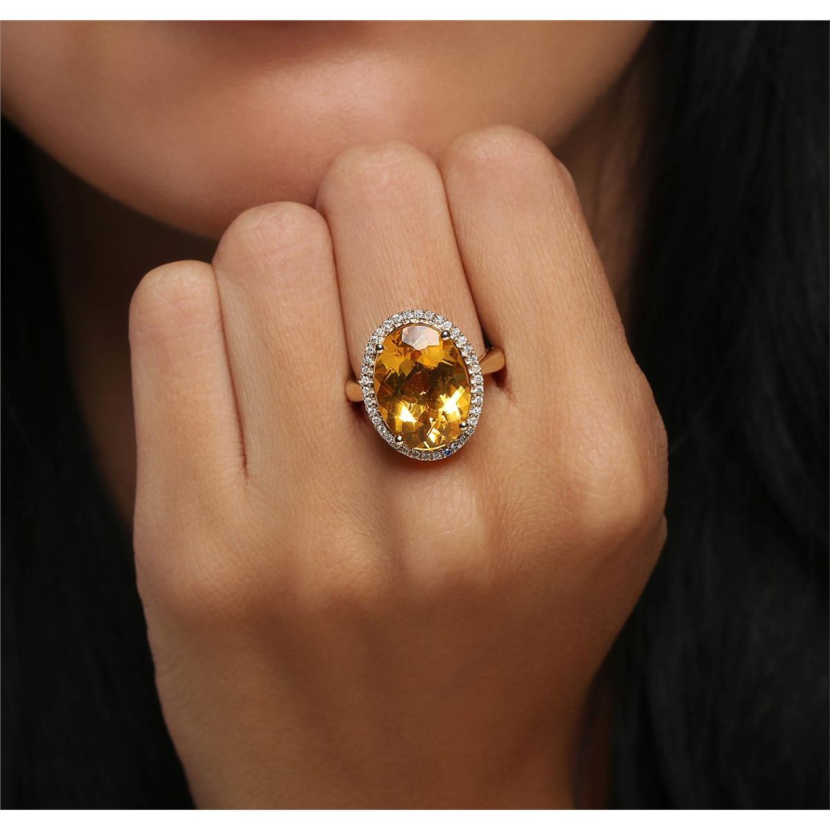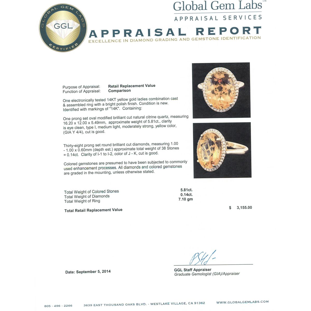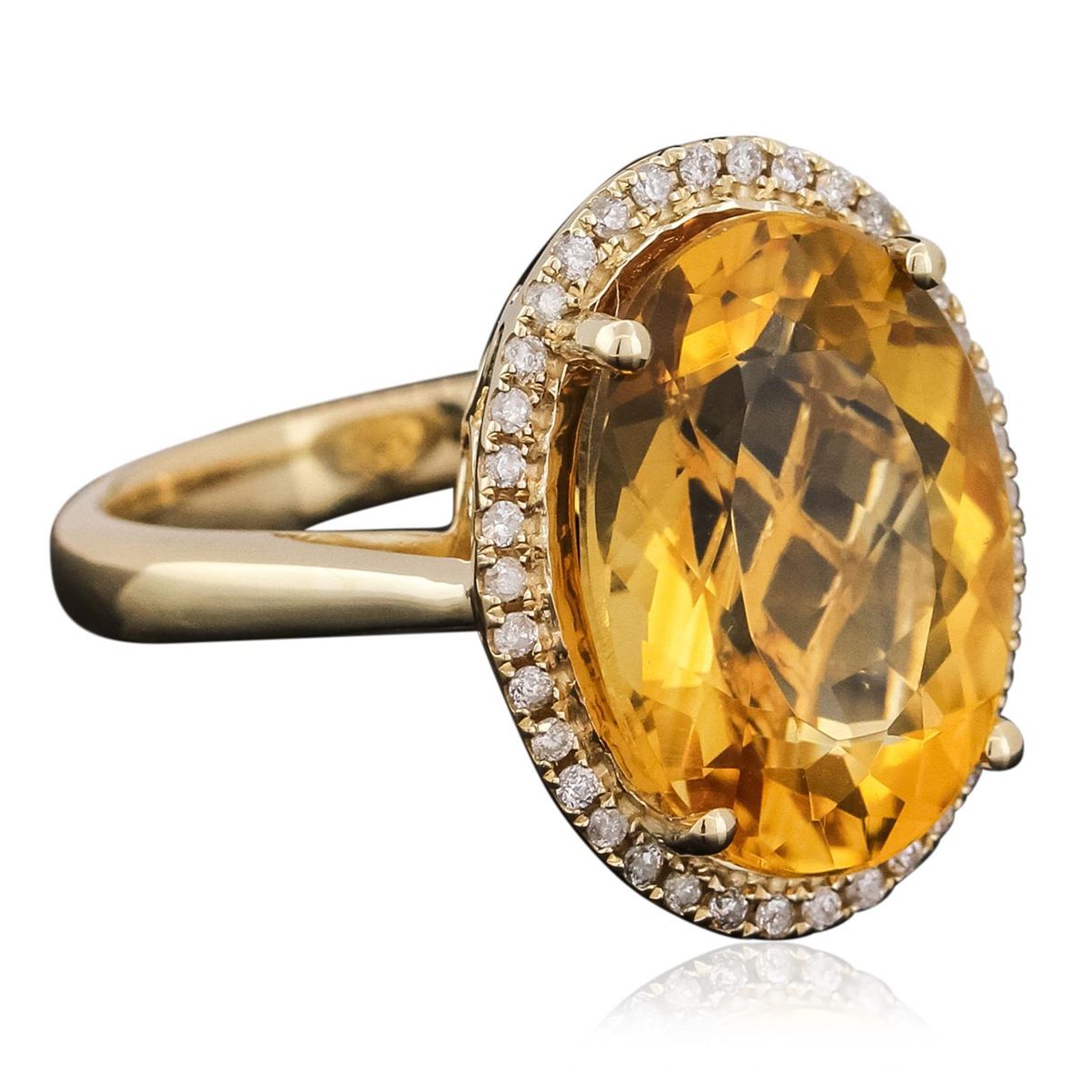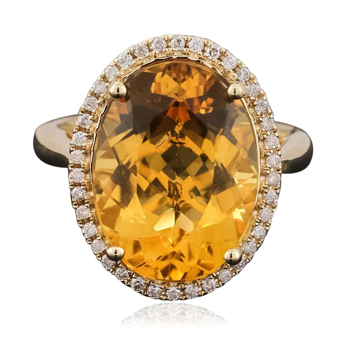 One electronically tested 14KT yellow gold ladies combination cast & assembled ring with a bright polish finish. Identified with markings of "14K". Condition is new. Containing: One prong set oval modified brilliant cut natural citrine quartz, measuring 16.20 x 12.00 x 5.49mm, approximate weight of 5.81ct., clarity is eye clean, type I, medium light, moderately strong, yellow color, (GIA Y 4/4), cut is good. Thirty-Eight prong set round brilliant cut diamonds, measuring 1.00 - 1.00 x 0.60mm (depth est.) approximate total weight of 38 Stones = 0.14ct. Clarity: I-1 to I-2. Color: J - K, Cut is Good. Colored gemstones are presumed to have been subjected to commonly used enhancement processes. All diamonds and colored gemstones are graded in the mounting, unless otherwise stated. Total Weight of Colored Stones 5.81ct. Total Weight of Diamonds 0.14ct. Total Weight of Ring 7.10 grams. GGL Appraised at $3,155.00.