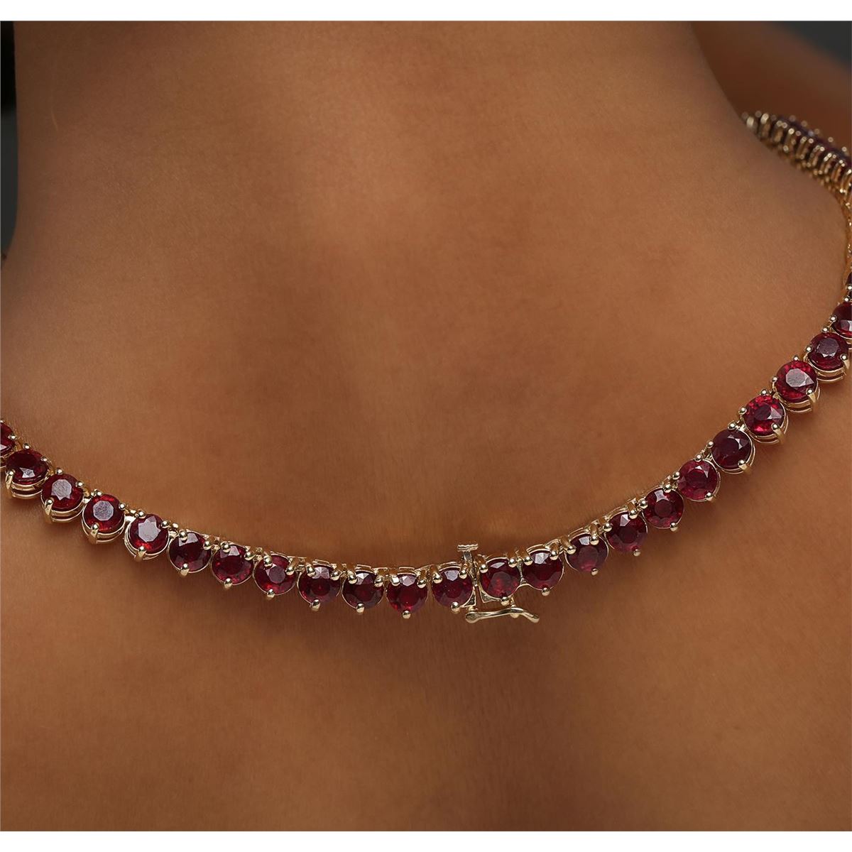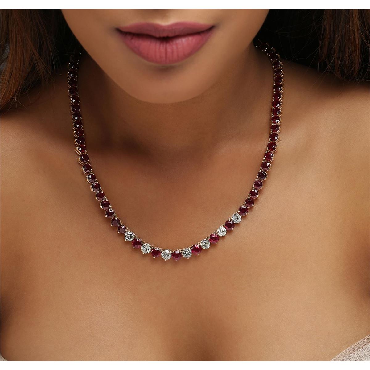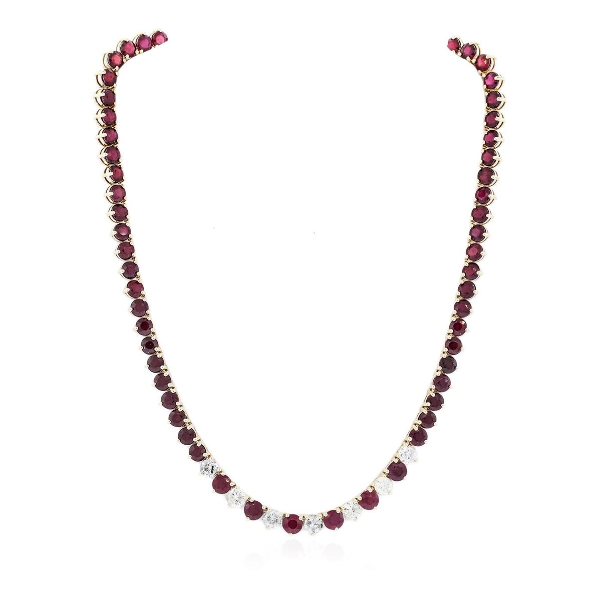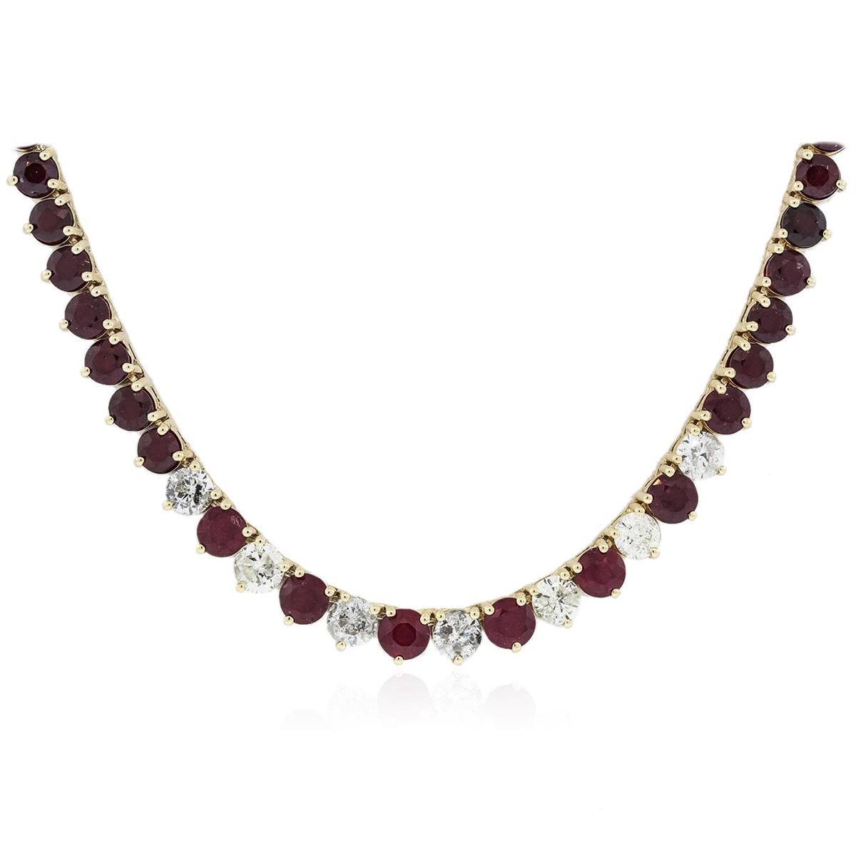 One electronically tested 14KT yellow gold ladies combination cast & assembled ruby and diamond necklace with a hidden box clasp with a bright polish finish. Measurements: 17.25" in length. Identified with markings of "14K". Condition is new. Containing: Seventy prong set round modified brilliant cut natural rubies, measuring 5.20 - 5.20 x 3.79 mm, approximate total weight of 51.80ct., clarity is heavily included, medium dark, moderately strong, strongly purplish red color, (GIA stpR 6/4), cut is good. Seven prong set round brilliant cut diamonds, measuring 5.50 - 5.50 x 3.30mm (depth est.) approximate total weight of 7 Stones = 4.26ct. Clarity: I-2 to I-3. Color: J - K, Cut is Good. Colored gemstones are presumed to have been subjected to commonly used enhancement processes. All diamonds and colored gemstones are graded in the mounting, unless otherwise stated. Total Weight of Colored Stones 51.80ct. Total Weight of Diamonds 4.26ct. Total Weight of Necklace 49.60 grams. GGL Appraised at $22,335.00.