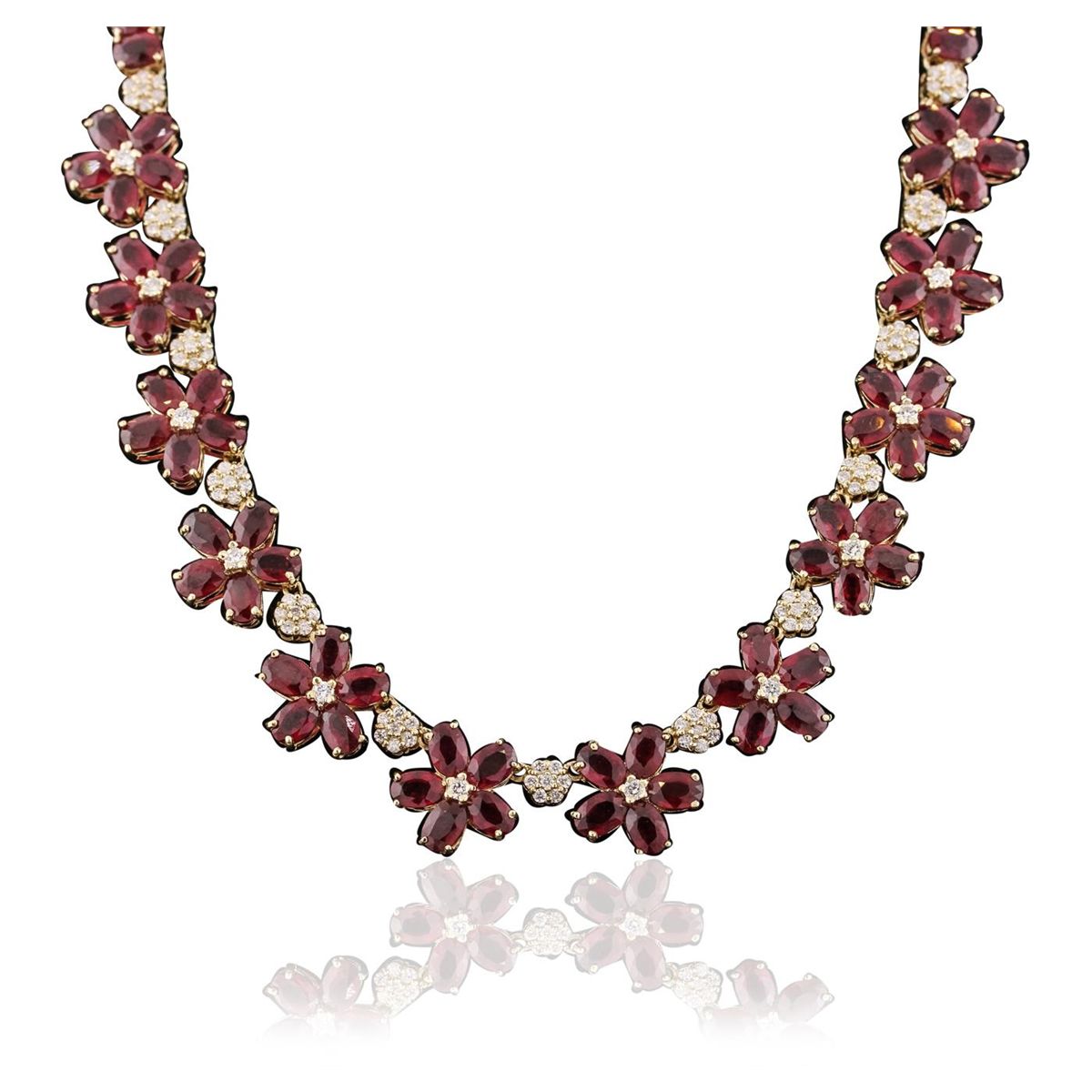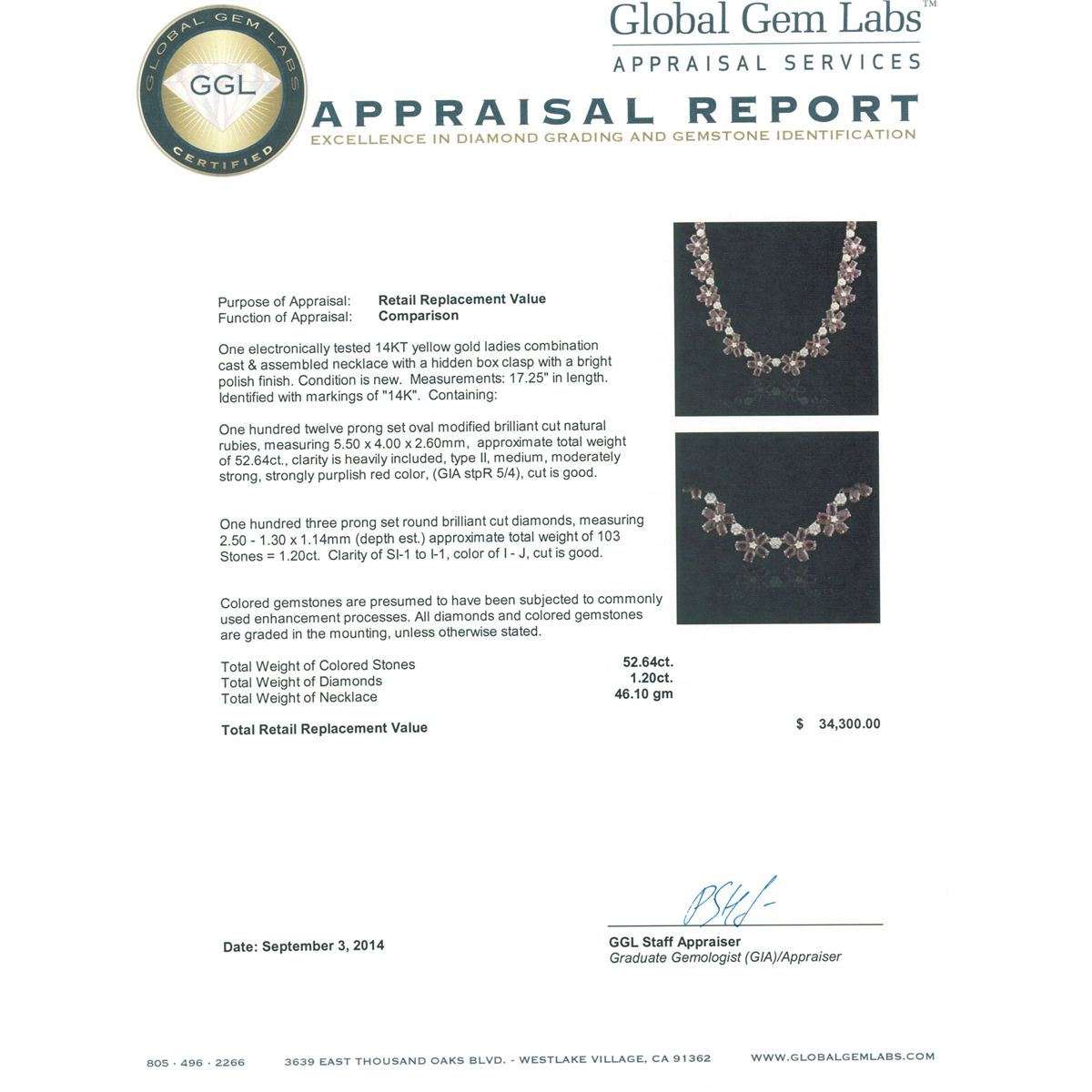 One electronically tested 14KT yellow gold ladies combination cast & assembled necklace with a hidden box clasp with a bright polish finish. Measurements: 17.25" in length. Identified with markings of "14K". Condition is new. Containing: One hundred twelve prong set oval modified brilliant cut natural rubies, measuring 5.50 x 4.00 x 2.60mm, approximate total weight of 52.64ct., clarity is heavily included, type II, medium, moderately strong, strongly purplish red color, (GIA stpR 5/4), cut is good. One Hundred Three prong set round brilliant cut diamonds, measuring 2.50 - 1.30 x 1.14mm (depth est.) approximate total weight of 103 Stones = 1.20ct. Clarity: SI-1 to I-1. Color: I - J, Cut is Good. Colored gemstones are presumed to have been subjected to commonly used enhancement processes. All diamonds and colored gemstones are graded in the mounting, unless otherwise stated. Total Weight of Colored Stones 52.64ct. Total Weight of Diamonds 1.20ct. Total Weight of Necklace 46.10 grams. GGL Appraised at $34,300.00.
