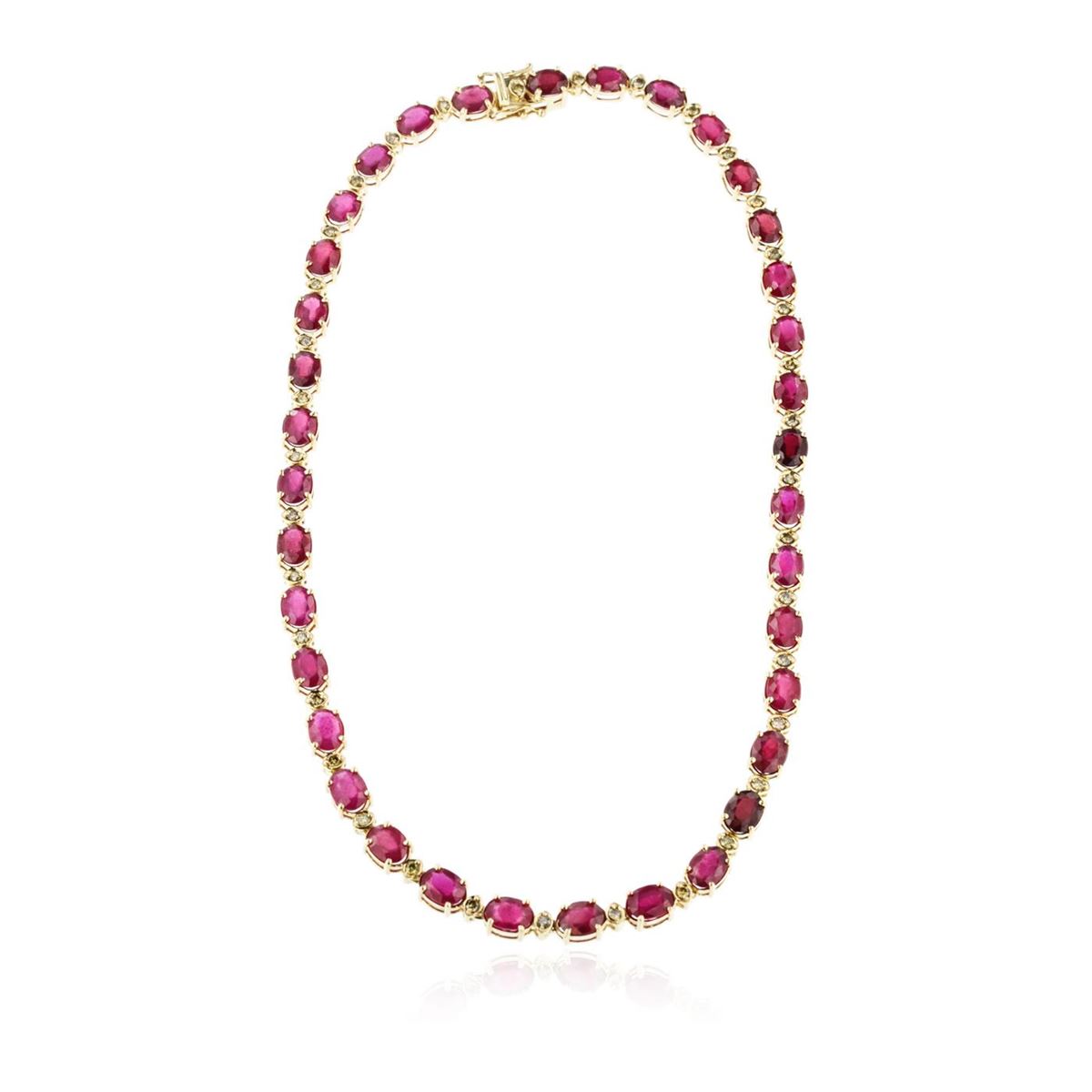 One electronically tested 14KT yellow gold ladies cast & assembled ruby and diamond necklace with a bright polish finish. Condition is new, good workmanship. Eighteen inch length necklace features a flexible ruby and diamond ribbon, terminating in a concealed clasp with twin safeties. Containing: Thirty-six prong set oval mixed cut natural rubies, measuring 7.50 x 6.00 x 4.00mm, approximate. Total Weight of 52.66ct., clarity is heavily included, type II, medium dark, very slightly brownish, slightly purplish red color, (GIA slpR 6/3), cut is good. Transmitting light somewhat diffusely, transparent to translucent. Naturally occurring internal & external characteristics are present. Indications of laboratory high temperature heat treatment, with glass & flux additives. Measurements & the color grade are an average for the group. Graded in the setting. Ruby has a low tolerance to rhodium plating, repolishing the surface, & ultrasonic cleaning. Thirty-Six prong set round brilliant cut diamonds, measuring 2.50 - 2.40 x 1.47mm (depth est.) approximate. Total Weight of 36 Stones = 2.03ct. Faint secondary color throughout. Graded in the setting. Clarity: SI-1 to I-1. Total Weight of Colored Stones 52.66ct. Total Weight of Diamonds 2.03ct. Total Weight of Necklace 40.98 grams. AIG Appraised at $20,760.00.