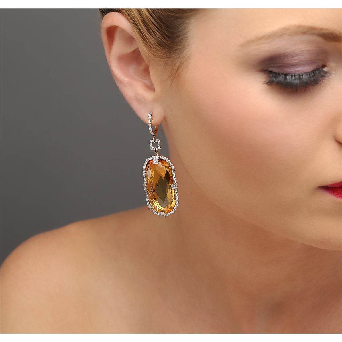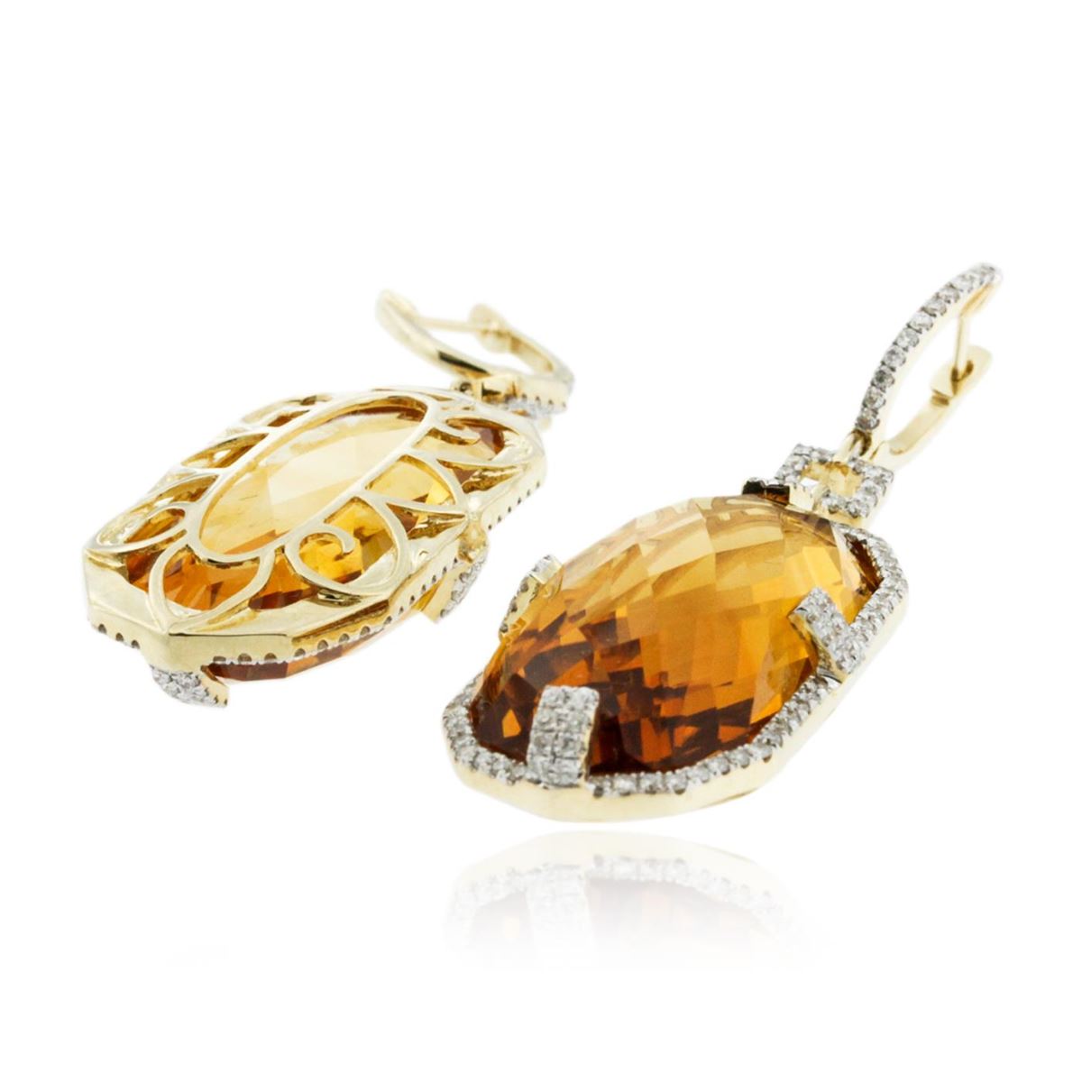 One pair of earrings featuring: 14KT yellow gold weighing 10.55 grams containing two citrines with a total weight of 55.54ct and 214 round diamonds with a total weight of 1.40ct.
