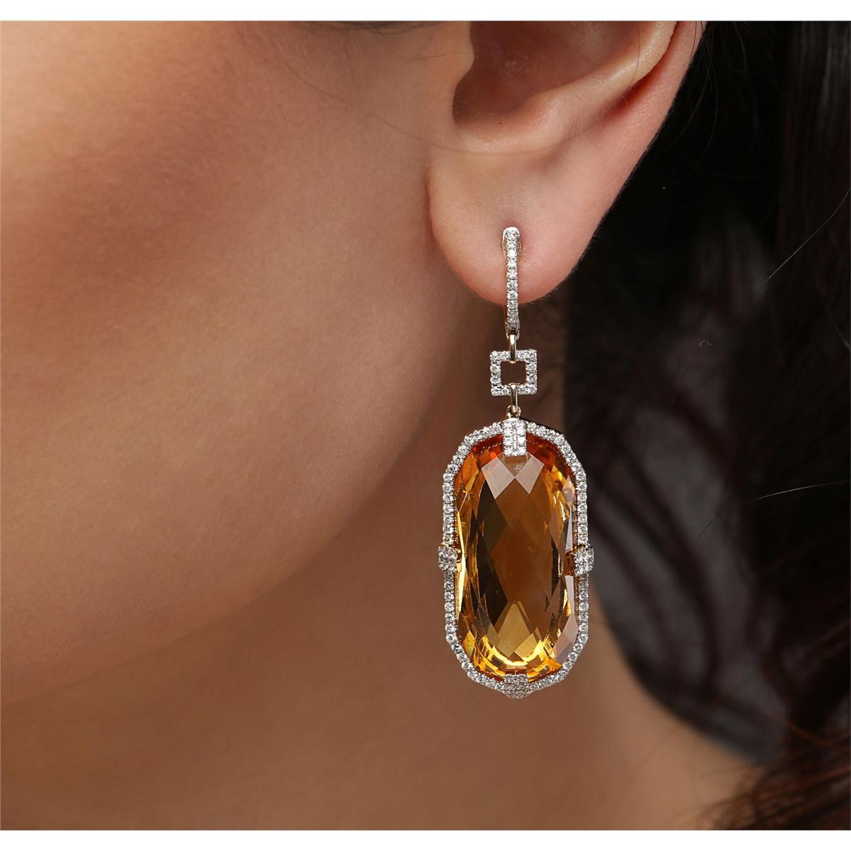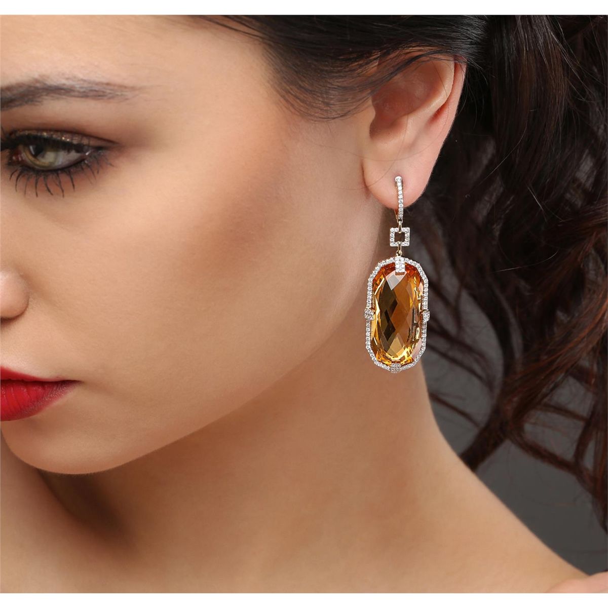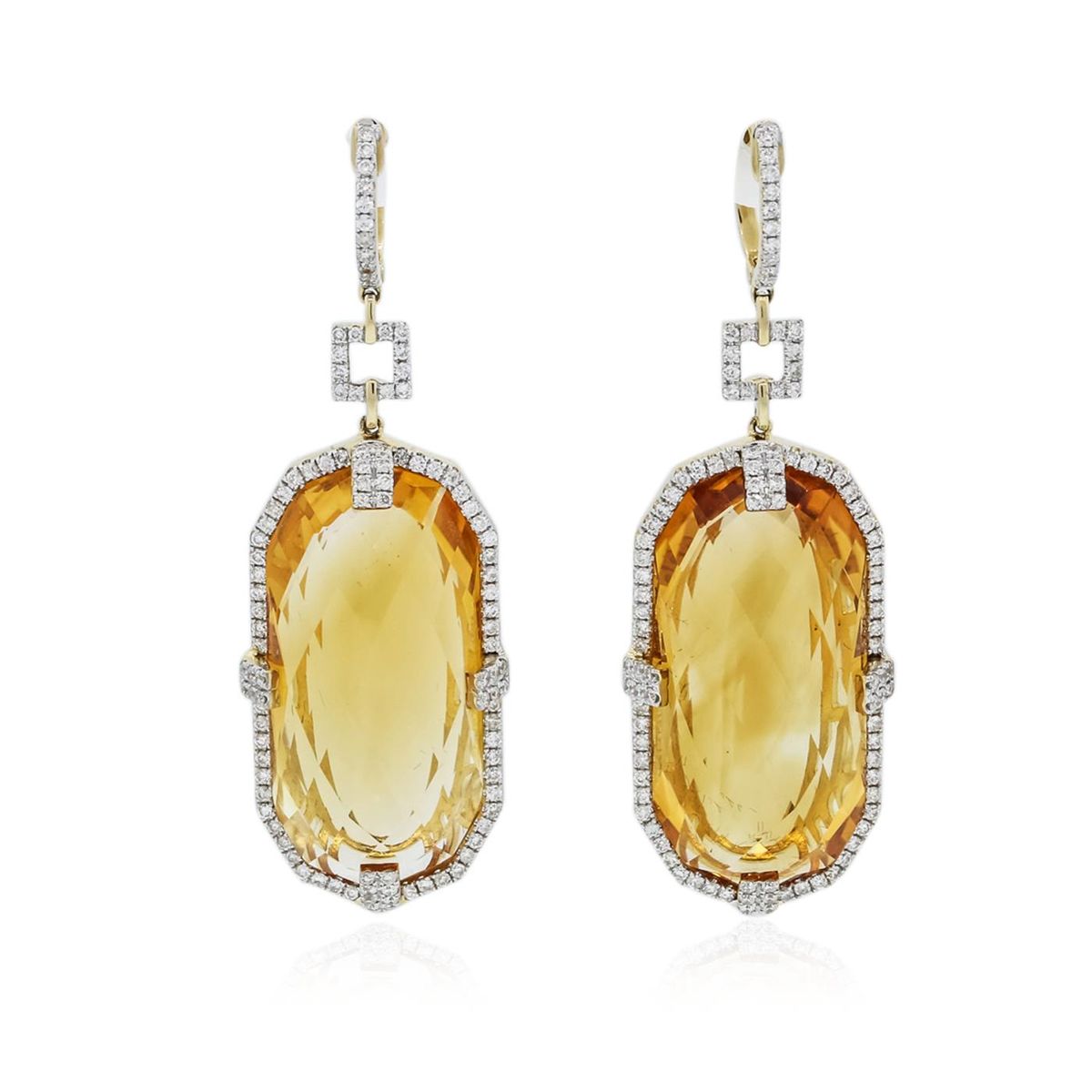 One pair of earrings featuring: 14KT yellow gold weighing 10.55 grams containing two citrines with a total weight of 55.54ct and 214 round diamonds with a total weight of 1.40ct.