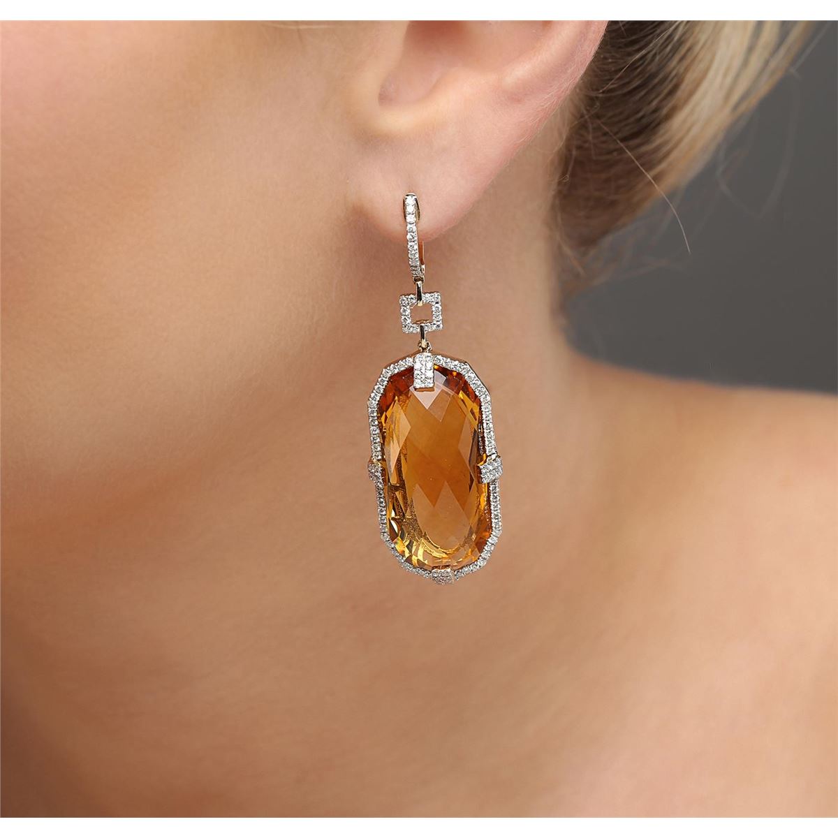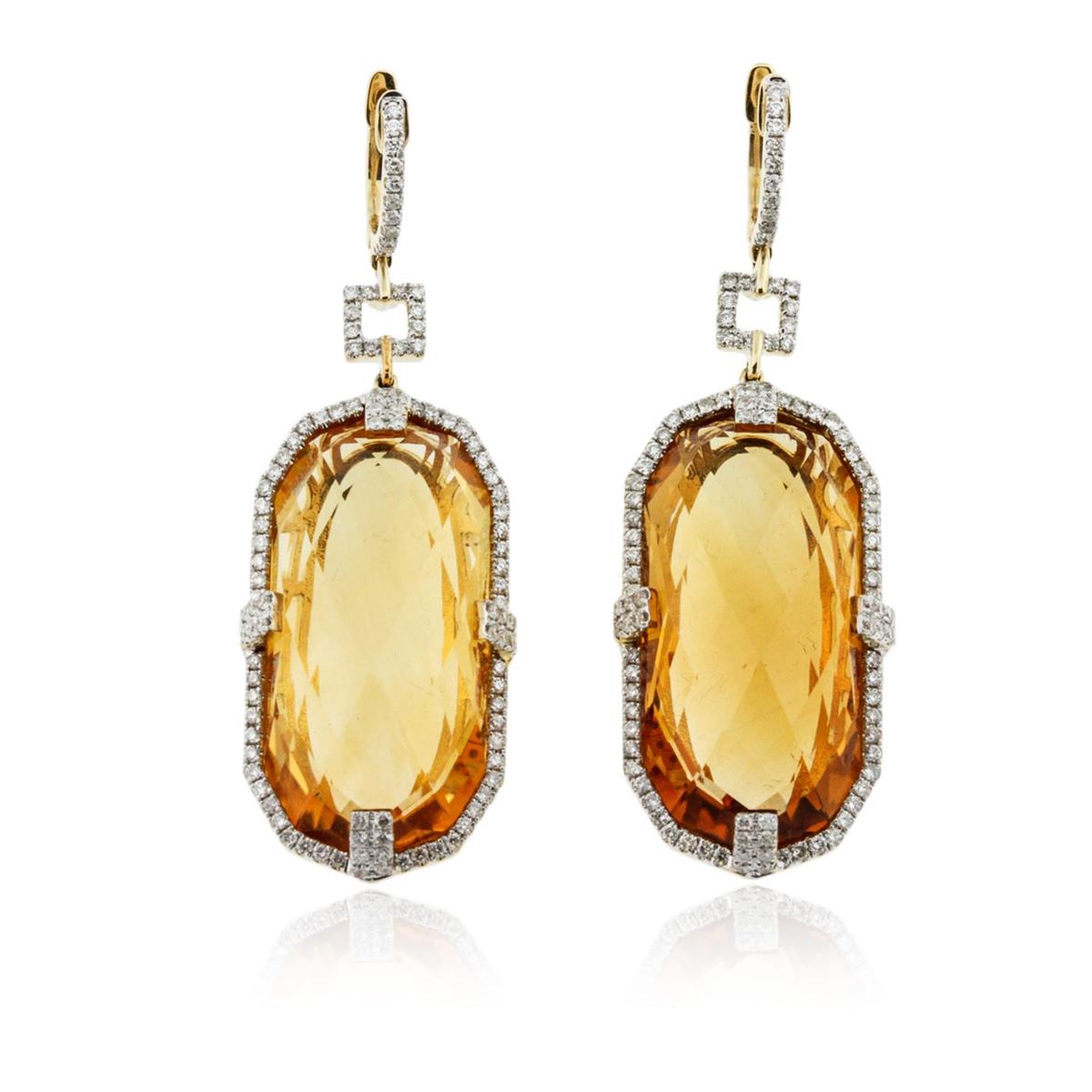 One pair of earrings featuring: 14KT yellow gold weighing 10.55 grams containing two citrines with a total weight of 55.54ct and 214 round diamonds with a total weight of 1.40ct.