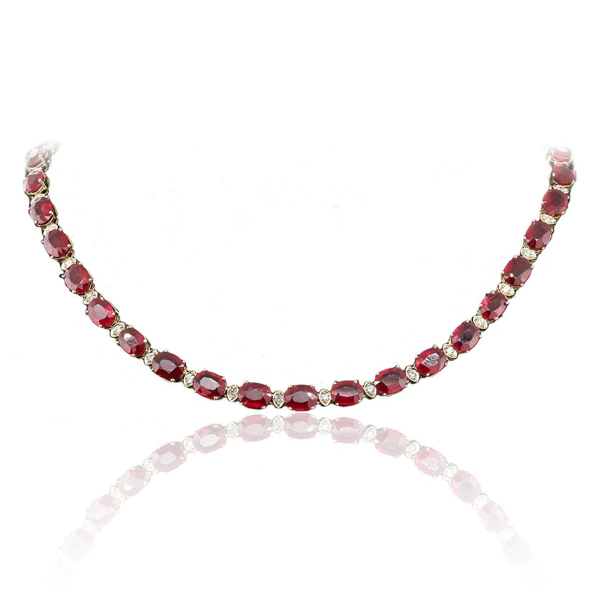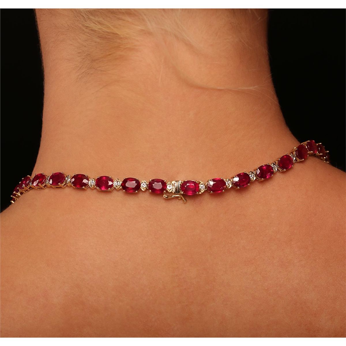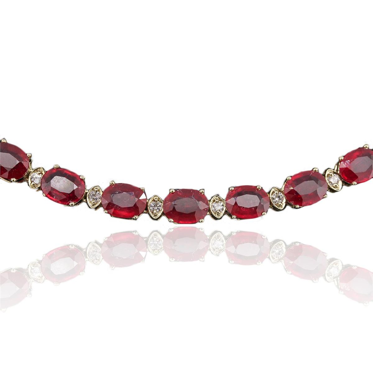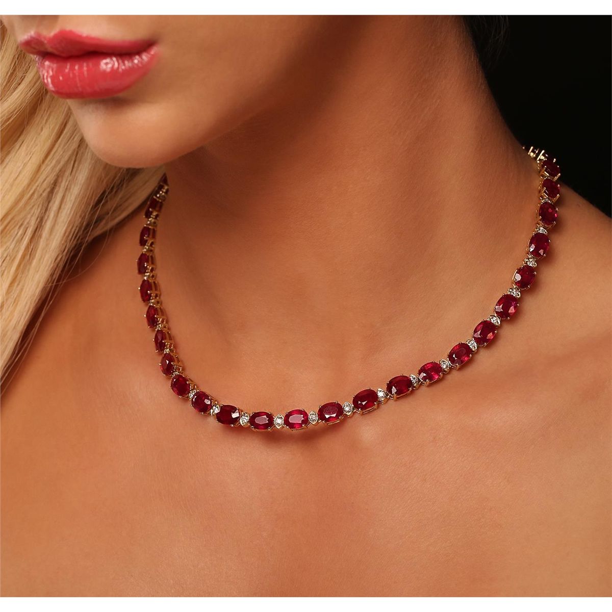 One electronically tested 14KT yellow gold Ladies combination cast & assembled necklace with a hidden box clasp with a bright polish finish. Condition is new. Measurements" 16.50" in length. Identified with markings of "14K". Containing: Thirty-nine prong set oval modified brilliant cut natural rubies, measuring 7.80 x 6.00 x 3.90mm, approximate. Total Weight of 58.11ct., clarity is heavily included, type II, medium, moderately strong, strongly purplish red color, (GIA stpR 5/4), cut is good. Thirty-Nine prong set round brilliant cut diamonds, measuring 2.00 - 2.00 x 1.20mm (depth est.) approximate. Total Weight of 39 Stones = 1.14ct. Clarity: SI-2 to I-1. Color: I - J, Cut is Very Good. Total Weight of Colored Stones 58.11ct. Total Weight of Diamonds 1.14ct. Total Weight of Necklace 34.90 grams. GGL Appraised at $31,690.00.