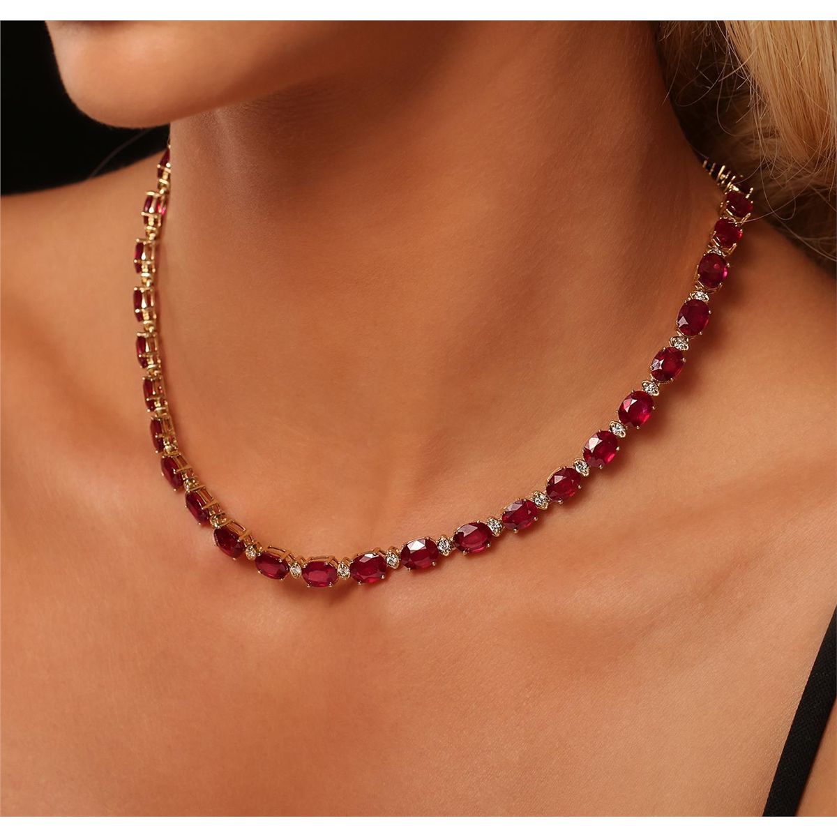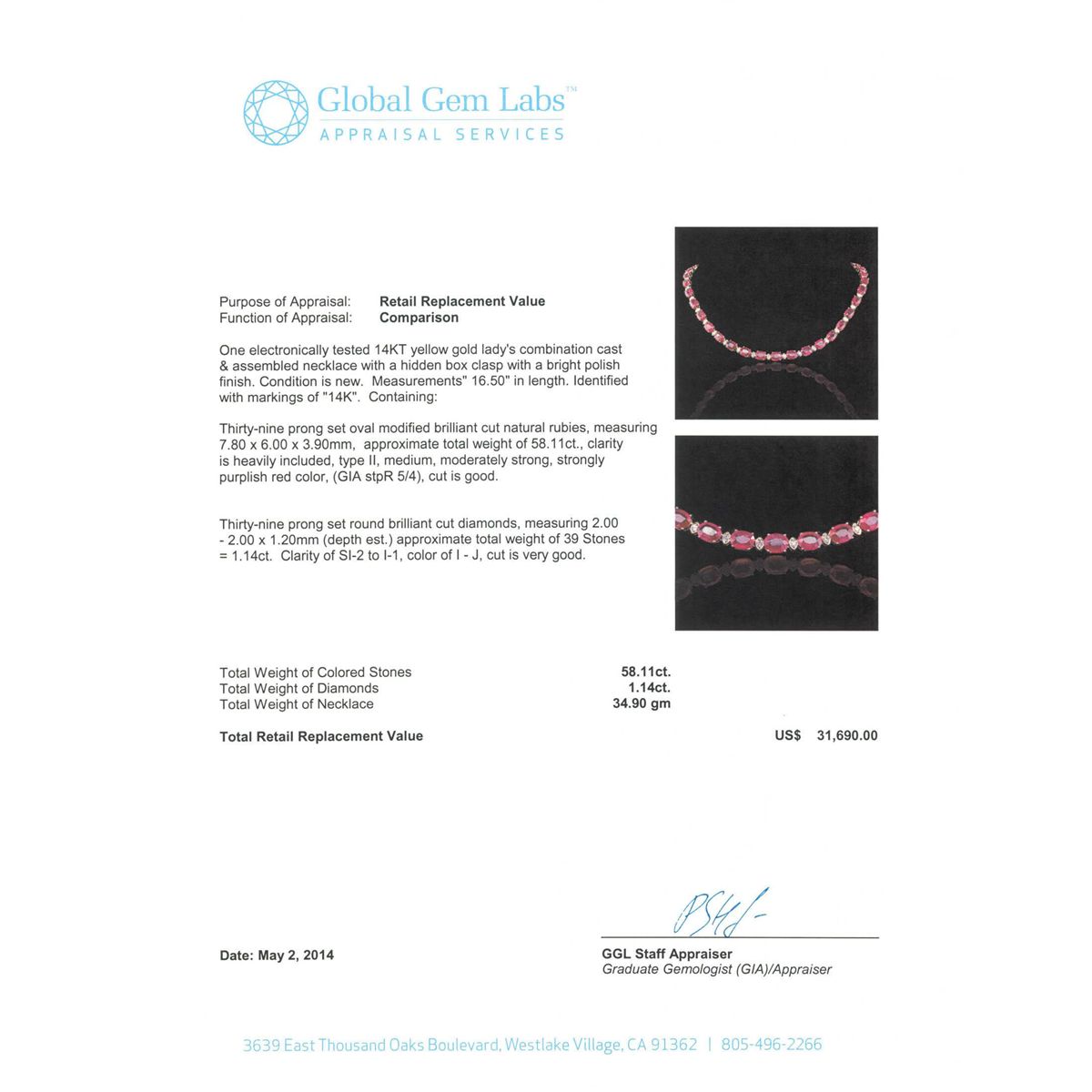 One electronically tested 14KT yellow gold Ladies combination cast & assembled necklace with a hidden box clasp with a bright polish finish. Condition is new. Measurements" 16.50" in length. Identified with markings of "14K". Containing: Thirty-nine prong set oval modified brilliant cut natural rubies, measuring 7.80 x 6.00 x 3.90mm, approximate. Total Weight of 58.11ct., clarity is heavily included, type II, medium, moderately strong, strongly purplish red color, (GIA stpR 5/4), cut is good. Thirty-Nine prong set round brilliant cut diamonds, measuring 2.00 - 2.00 x 1.20mm (depth est.) approximate. Total Weight of 39 Stones = 1.14ct. Clarity: SI-2 to I-1. Color: I - J, Cut is Very Good. Total Weight of Colored Stones 58.11ct. Total Weight of Diamonds 1.14ct. Total Weight of Necklace 34.90 grams. GGL Appraised at $31,690.00.