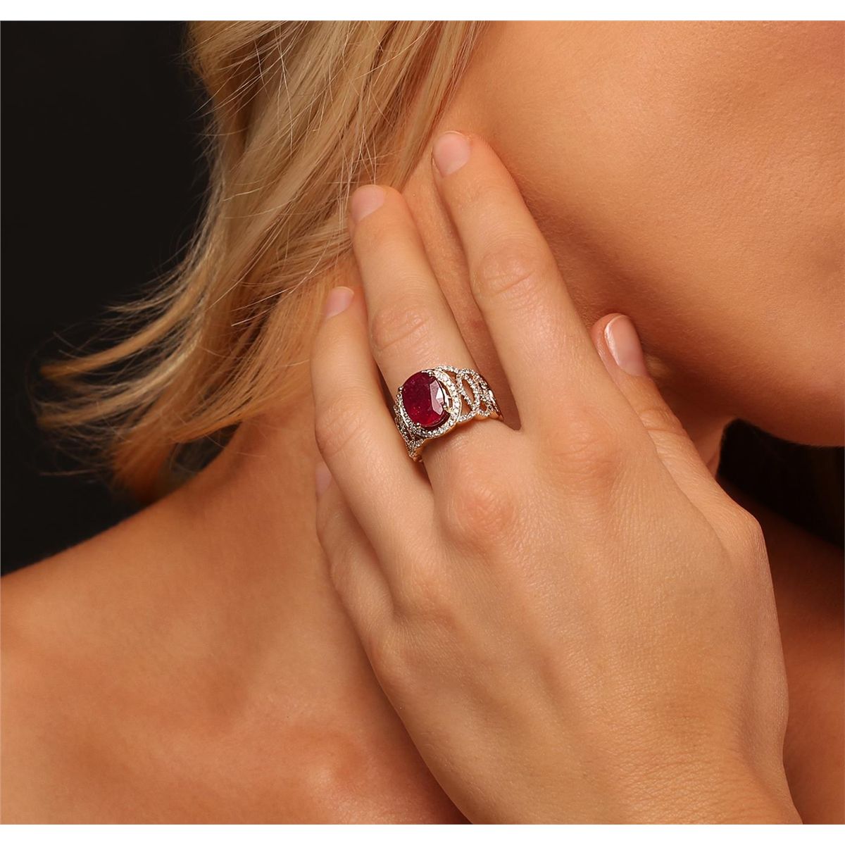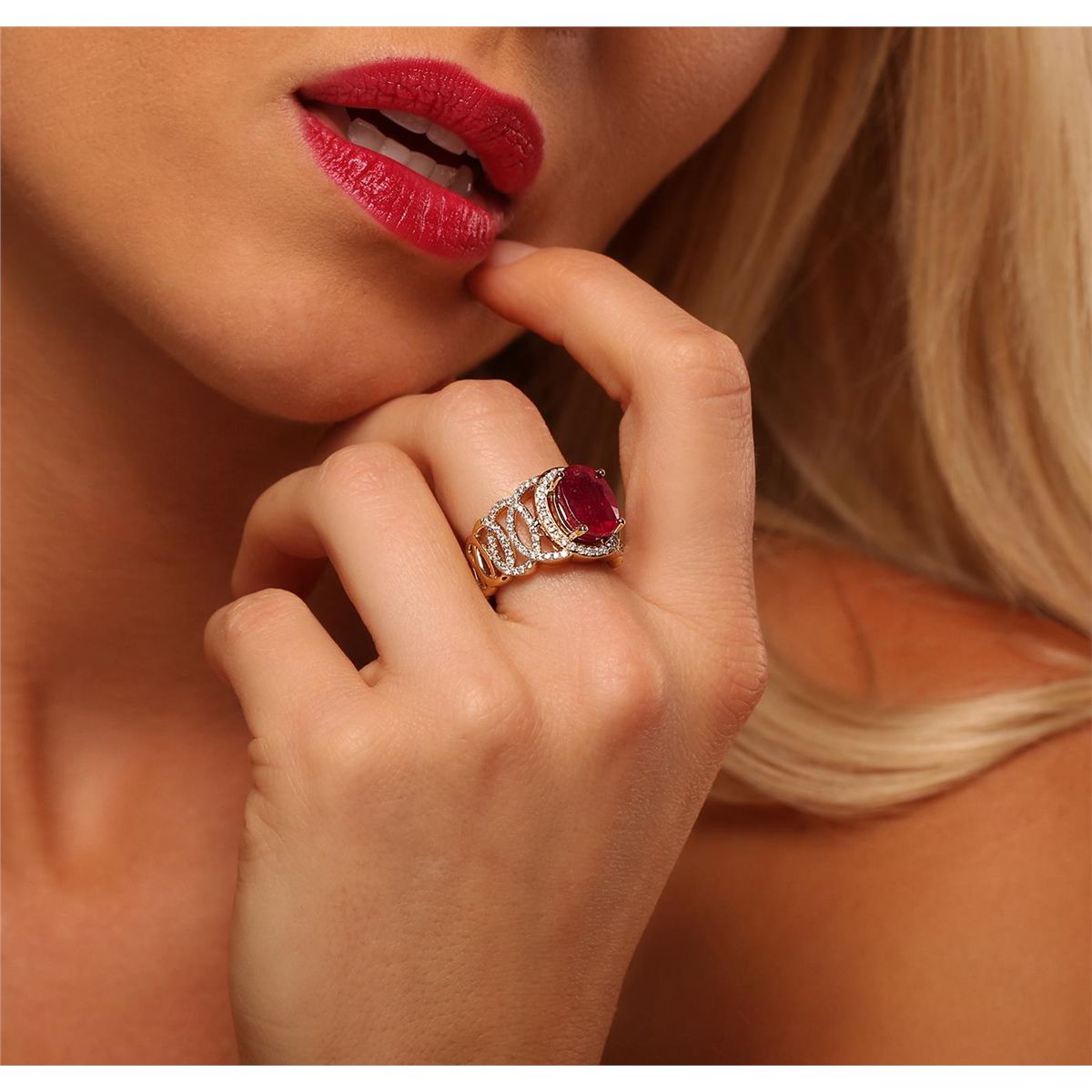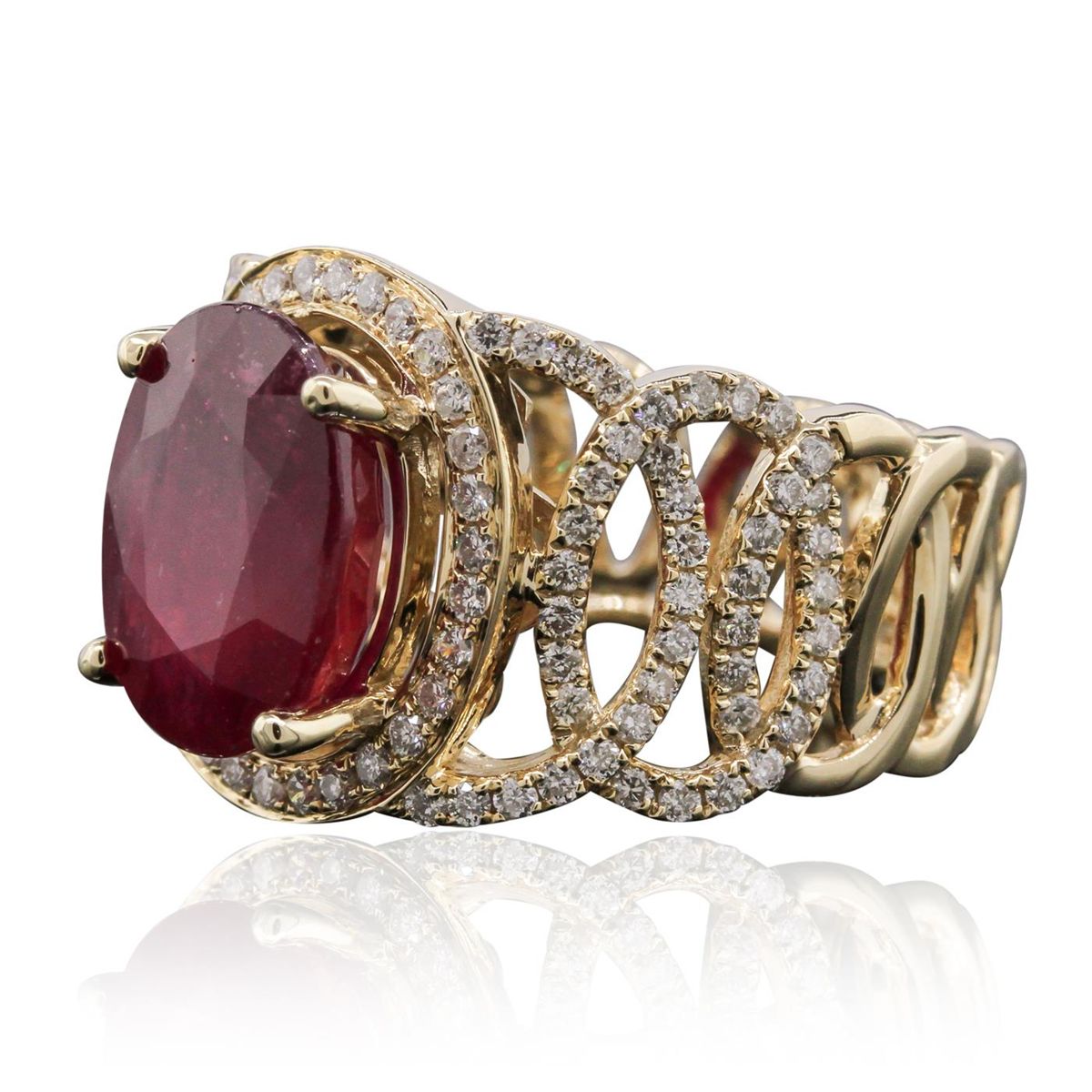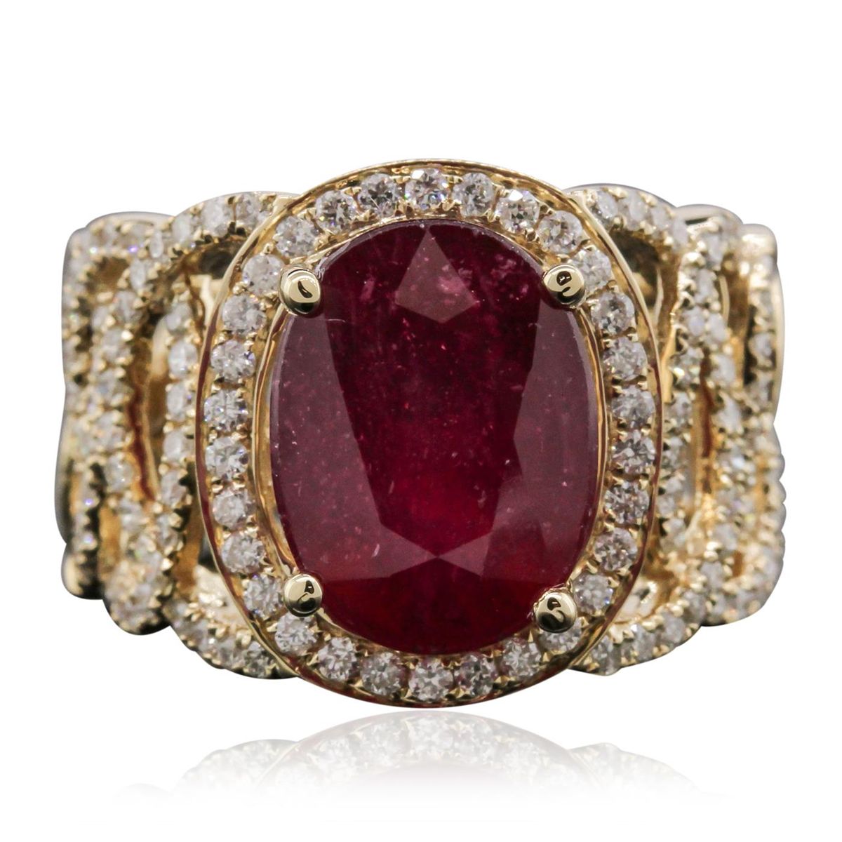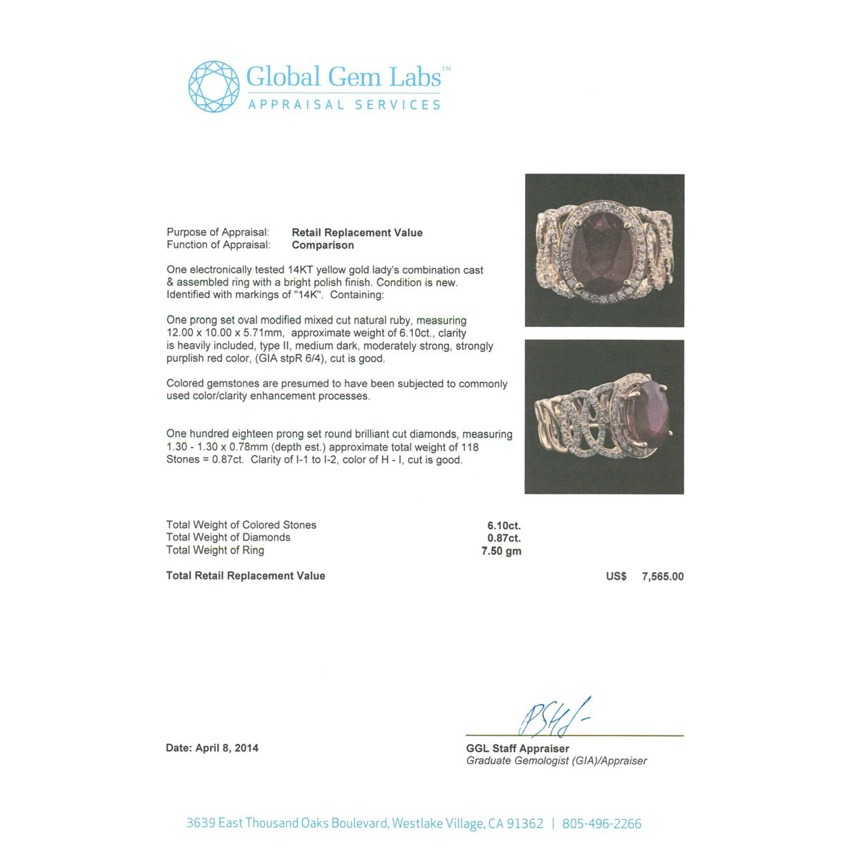 One electronically tested 14KT yellow gold Ladies combination cast & assembled ring with a bright polish finish. Condition is new. Identified with markings of "14K". Containing: One prong set oval modified mixed cut natural ruby, measuring 12.00 x 10.00 x 5.71mm, approximate weight of 6.10ct., clarity is heavily included, type II, medium dark, moderately strong, strongly purplish red color, (GIA stpR 6/4), cut is good. Colored gemstones are presumed to have been subjected to commonly used color/clarity enhancement processes. One Hundred Eighteen prong set round brilliant cut diamonds, measuring 1.30 - 1.30 x 0.78mm (depth est.) approximate. Total Weight of 118 Stones = 0.87ct. Clarity: I-1 to I-2. Color: H - I, Cut is Good. Total Weight of Colored Stones 6.10ct. Total Weight of Diamonds 0.87ct. Total Weight of Ring 7.50 grams. GGL Appraised at $7,565.00.