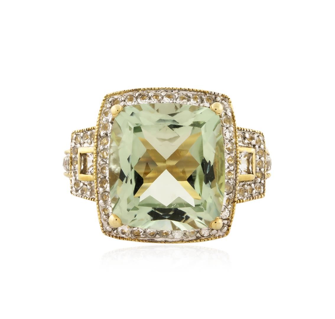 One ring featuring: 14KT yellow gold weighing 6.82 grams containing one garnet center stone with a total weight of 6.15ct and 80 white topaz side stones with a total weight of 0.87ct.