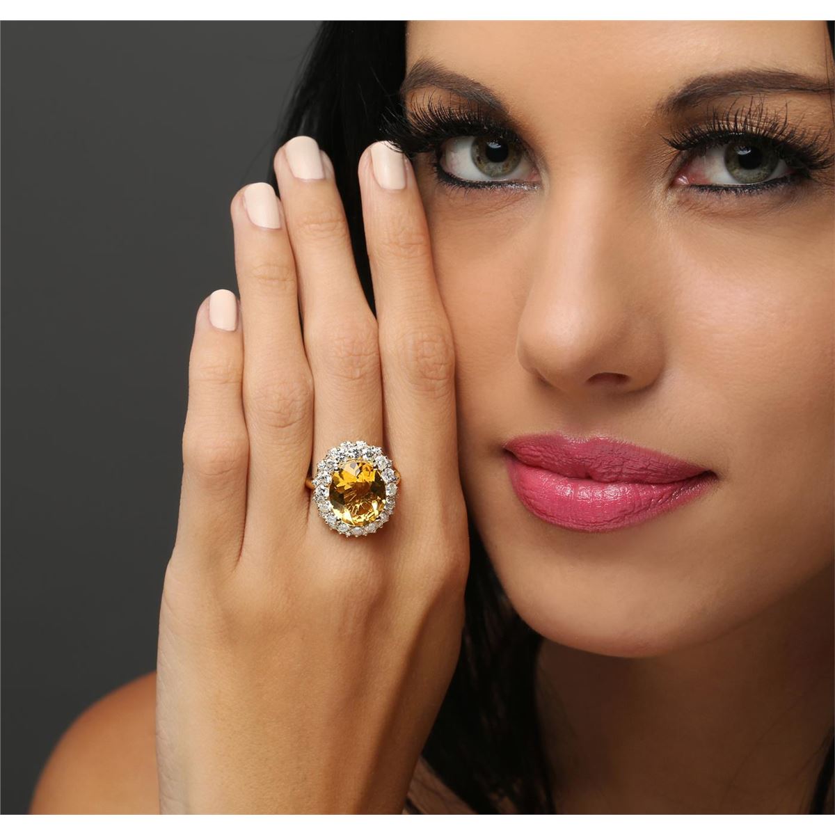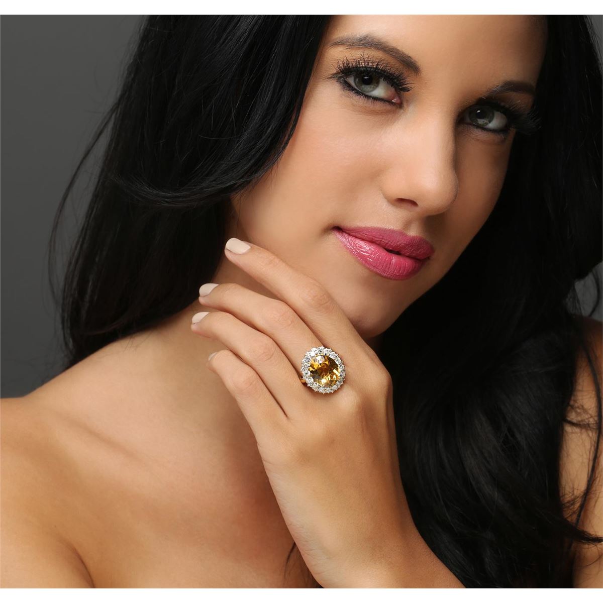 One electronically tested 14KT yellow gold ladies combination cast & assembled citrine and diamond ring with a flat shank with a bright polish finish. Identified with markings of "K14". Condition is new. Containing: One prong set oval modified brilliant cut natural citrine quartz, measuring 14.31 x 12.26 x 6.57mm, approximate weight of 6.17ct., clarity is eye clean, type I, medium light, brownish, yellow color, (GIA Y 4/3), cut is good. Sixteen prong set round brilliant cut diamonds, measuring 3.00 - 3.00 x 1.80mm (depth est.) approximate total weight of 16 Stones = 1.58ct. Clarity: SI-2 to I-1. Color: J, Cut is Good. Sixteen prong set round brilliant cut diamonds, measuring 1.50 - 1.50 x 0.90mm (depth est.) approximate total weight of 16 Stones = 0.20ct. Clarity: SI-2 to I-1. Color: J, Cut is Good. Colored gemstones are presumed to have been subjected to commonly used enhancement processes. All diamonds and colored gemstones are graded in the mounting, unless otherwise stated. Total Weight of Colored Stones 6.17ct. Total Weight of Diamonds 1.78ct. Total Weight of Ring 8.40 grams. GGL Appraised at $6,490.00.