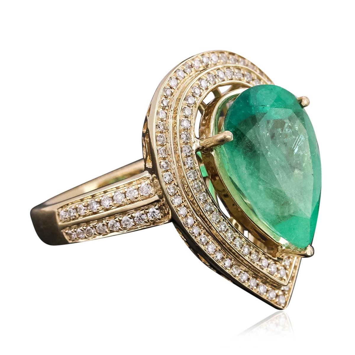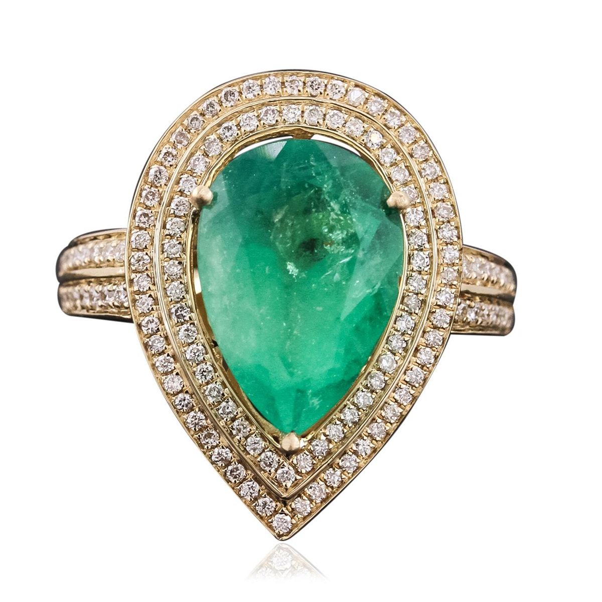 One electronically tested 14KT yellow gold ladies combination cast & assembled emerald and diamond ring with a split shoulder shank with a bright polish finish. Identified with markings of "14K". Condition is new. Containing: One prong set pear modified brilliant cut natural emerald, measuring 15.00 x 10.00 x 7.57mm, approximate weight of 6.18ct., clarity is heavily included, type III, medium, moderately strong, very slightly bluish green color, (GIA vslbG 5/4), cut is good. One Hundred Thirteen prong set round brilliant cut diamonds, measuring 1.00 - 1.00 x 0.60mm (depth est.) approximate total weight of 113 Stones = 0.41ct. Clarity: I-1 to I-2. Color: I - J, Cut is Good. Colored gemstones are presumed to have been subjected to commonly used enhancement processes. All diamonds and colored gemstones are graded in the mounting, unless otherwise stated. Total Weight of Colored Stones 6.18ct. Total Weight of Diamonds 0.41ct. Total Weight of Ring 9.10 grams. GGL Appraised at $12,080.00.