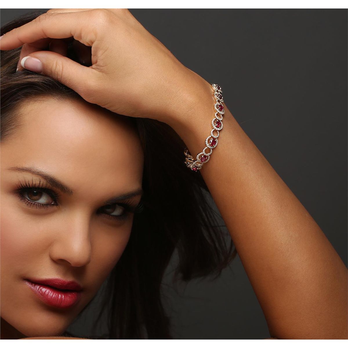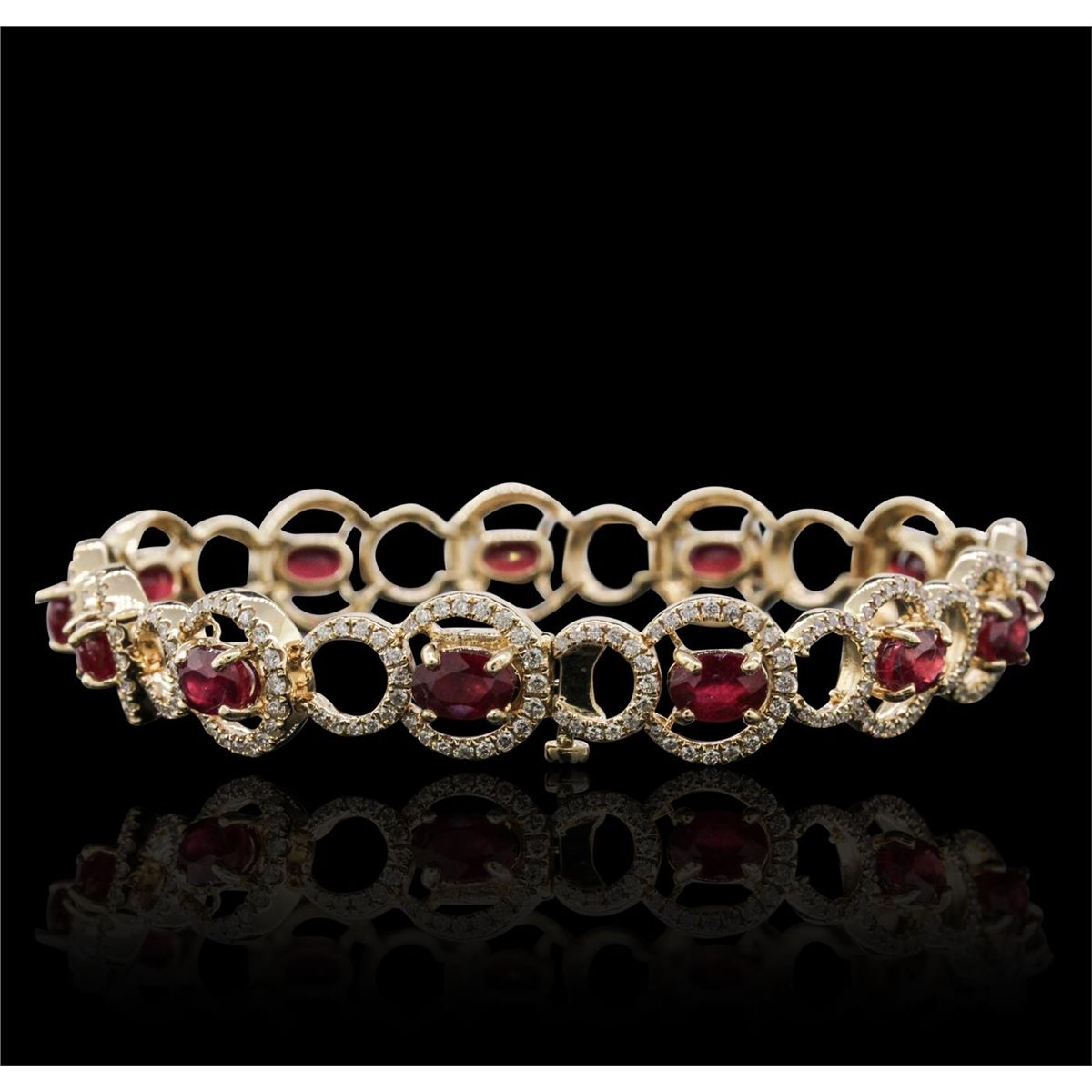 One electronically tested 14KT yellow gold ladies combination cast & assembled ruby and diamond bracelet with a hidden box clasp with a bright polish finish. Measurements: 7.25" in length. Identified with markings of "14K". Condition is new. Containing: Thirteen prong set oval modified brilliant cut natural rubies, measuring 5.60 x 4.18 x 3.00mm, approximate total weight of 6.24ct., clarity is heavily included, type II, medium, moderately strong, strongly purplish red color, (GIA stpR 5/4), cut is very good. Five Hundred Twenty prong set round brilliant cut diamonds, measuring 1.00 - 1.00 x 0.60mm (depth est.) approximate total weight of 520 Stones = 1.87ct. Clarity: I-1 to I-2. Color: I - J, Cut is Good. Colored gemstones are presumed to have been subjected to commonly used enhancement processes. All diamonds and colored gemstones are graded in the mounting, unless otherwise stated. Total Weight of Colored Stones 6.24ct. Total Weight of Diamonds 1.87ct. Total Weight of Bracelet 17.50 grams. GGL Appraised at $10,235.00. AIG Appraised at $4,235.00.