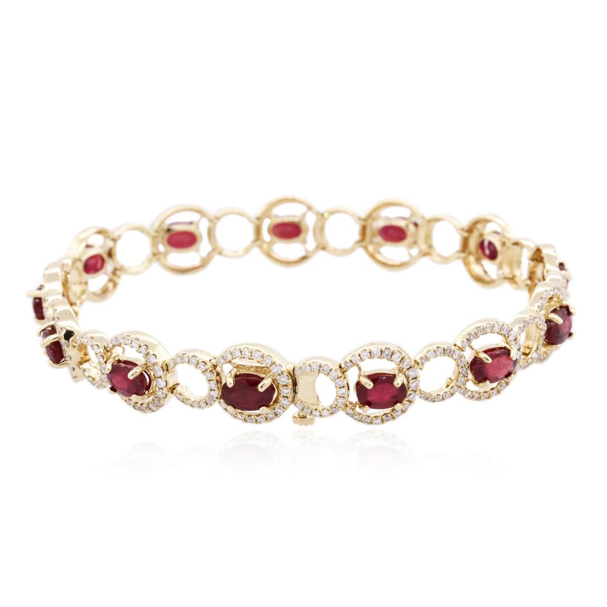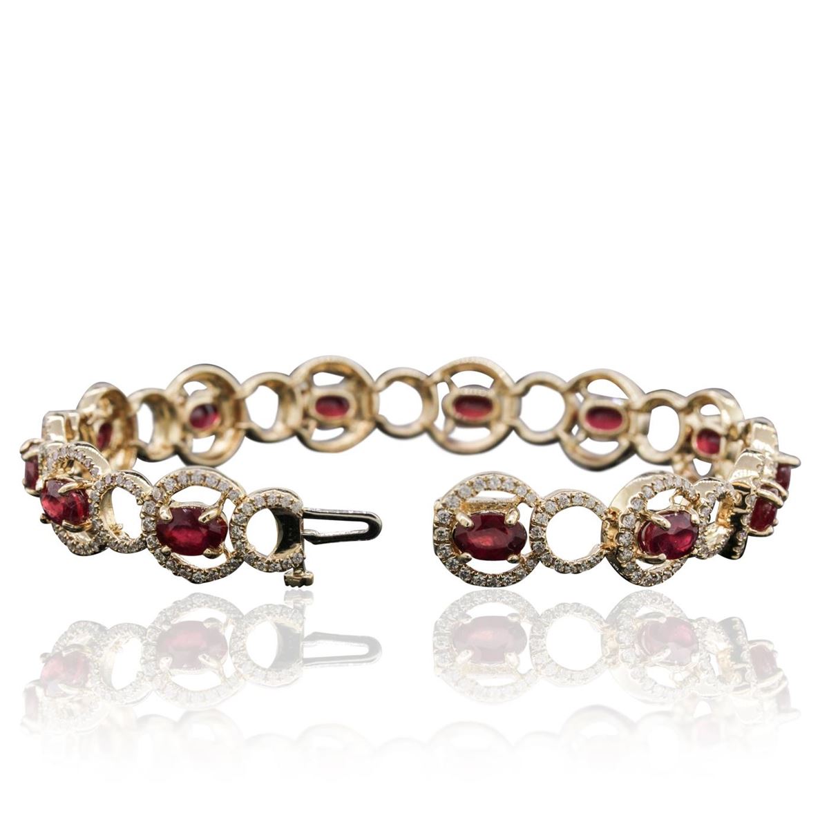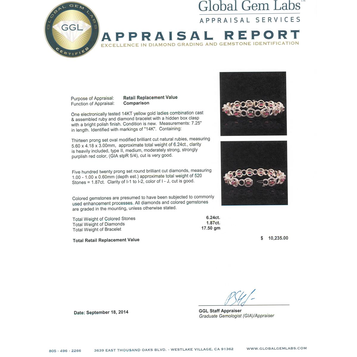 One electronically tested 14KT yellow gold ladies combination cast & assembled ruby and diamond bracelet with a hidden box clasp with a bright polish finish. Measurements: 7.25" in length. Identified with markings of "14K". Condition is new. Containing: Thirteen prong set oval modified brilliant cut natural rubies, measuring 5.60 x 4.18 x 3.00mm, approximate total weight of 6.24ct., clarity is heavily included, type II, medium, moderately strong, strongly purplish red color, (GIA stpR 5/4), cut is very good. Five Hundred Twenty prong set round brilliant cut diamonds, measuring 1.00 - 1.00 x 0.60mm (depth est.) approximate total weight of 520 Stones = 1.87ct. Clarity: I-1 to I-2. Color: I - J, Cut is Good. Colored gemstones are presumed to have been subjected to commonly used enhancement processes. All diamonds and colored gemstones are graded in the mounting, unless otherwise stated. Total Weight of Colored Stones 6.24ct. Total Weight of Diamonds 1.87ct. Total Weight of Bracelet 17.50 grams. GGL Appraised at $10,235.00.