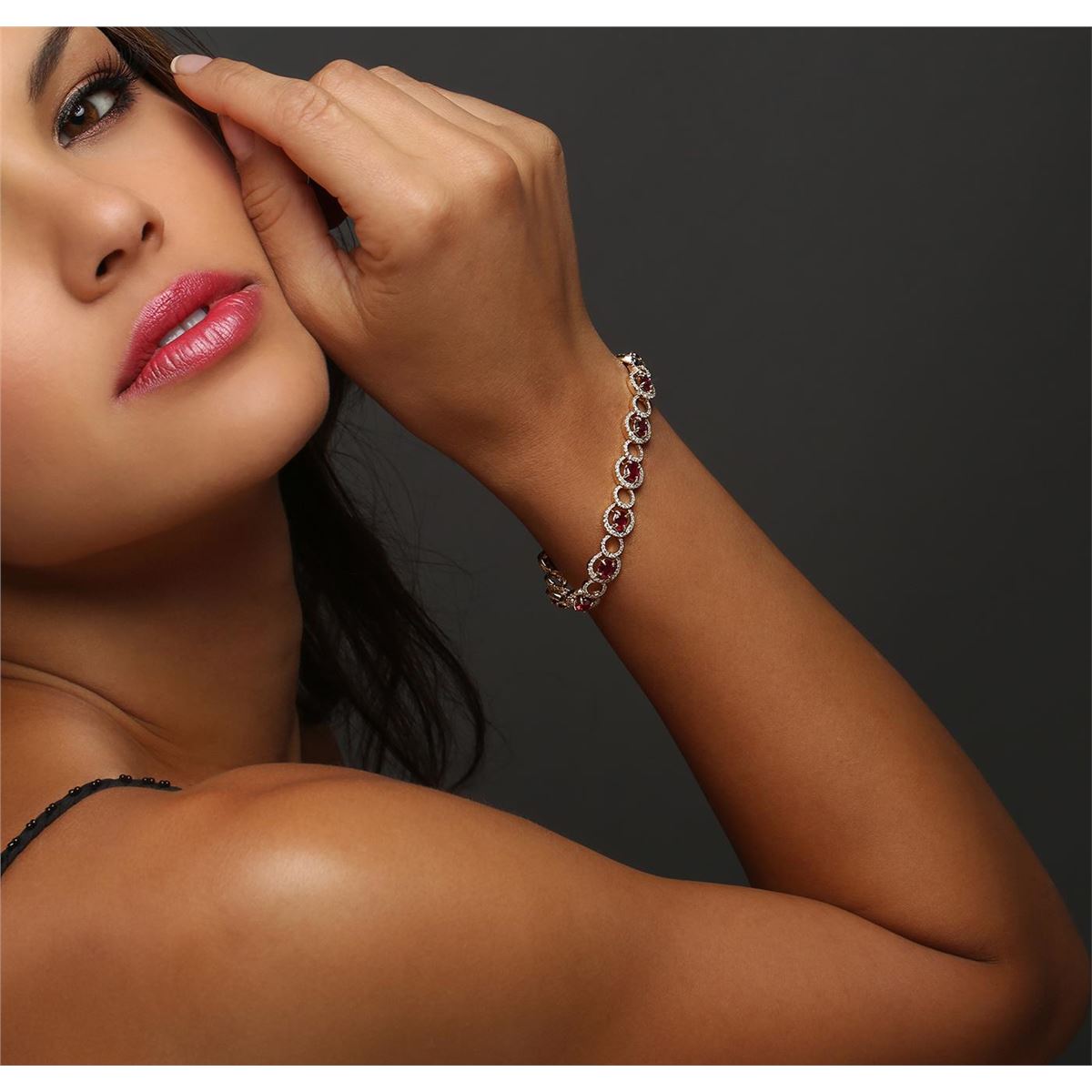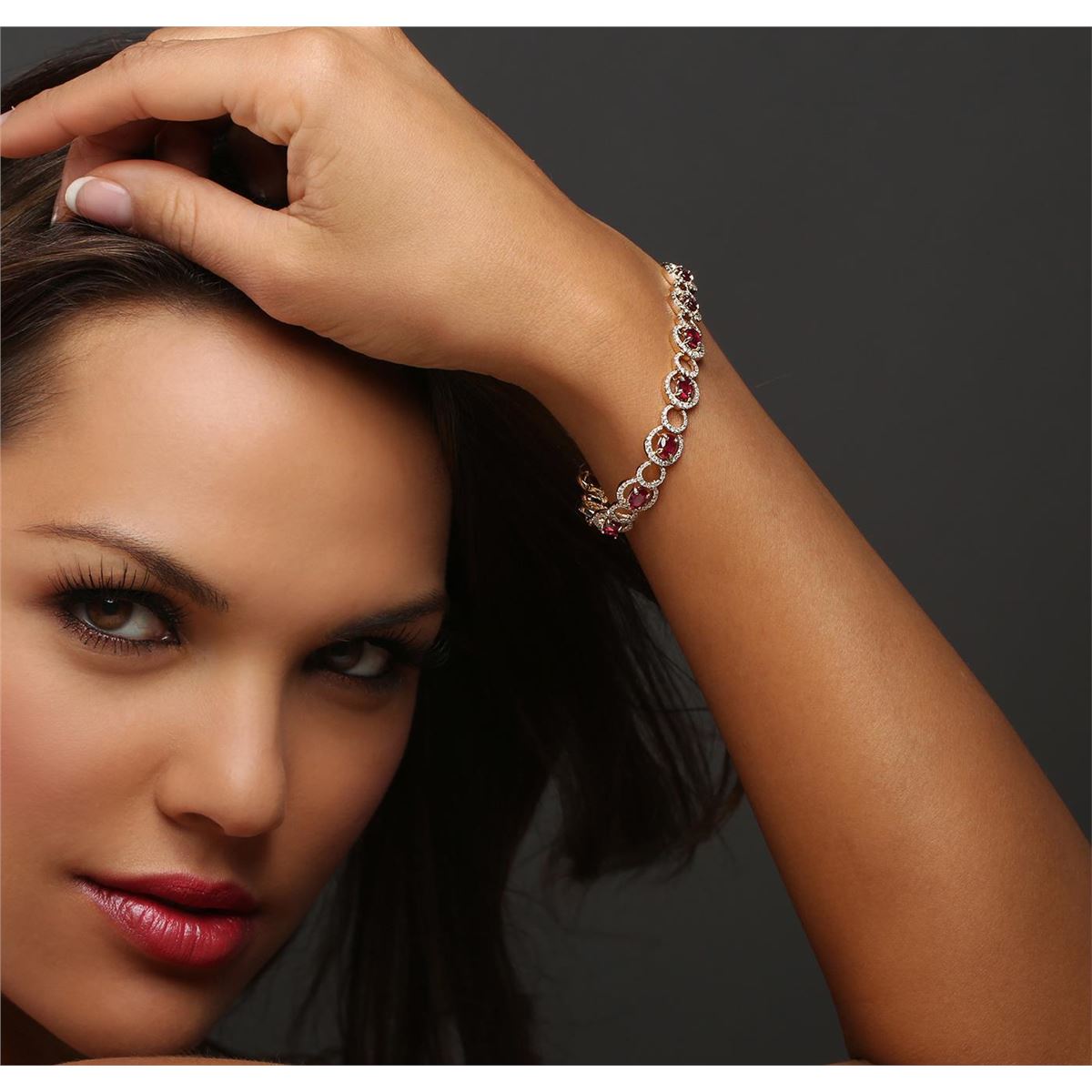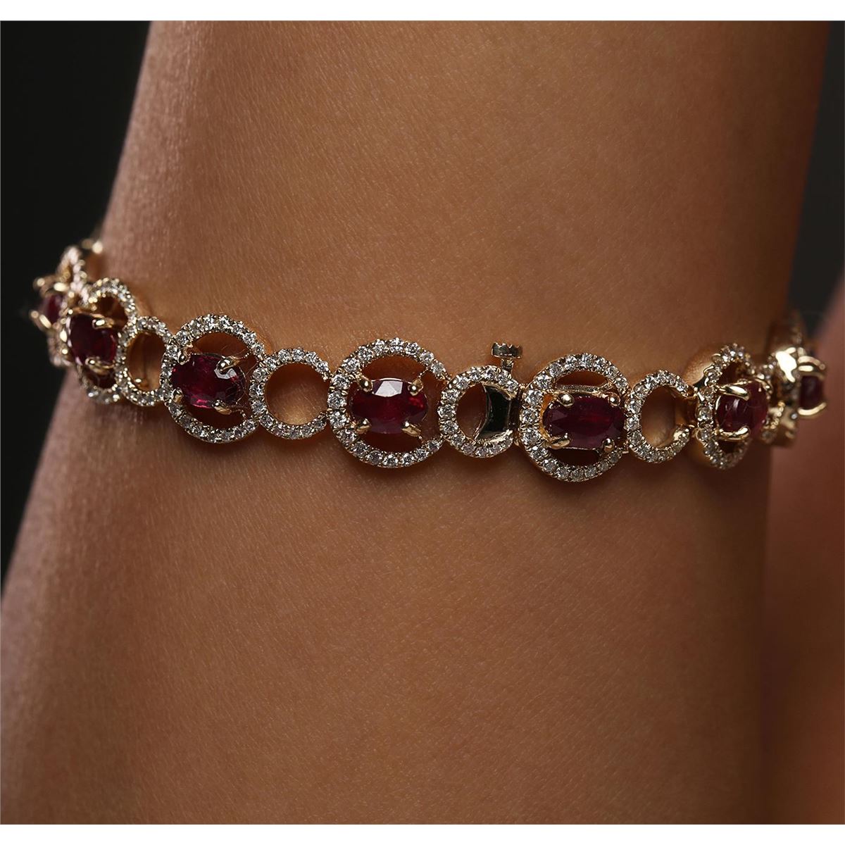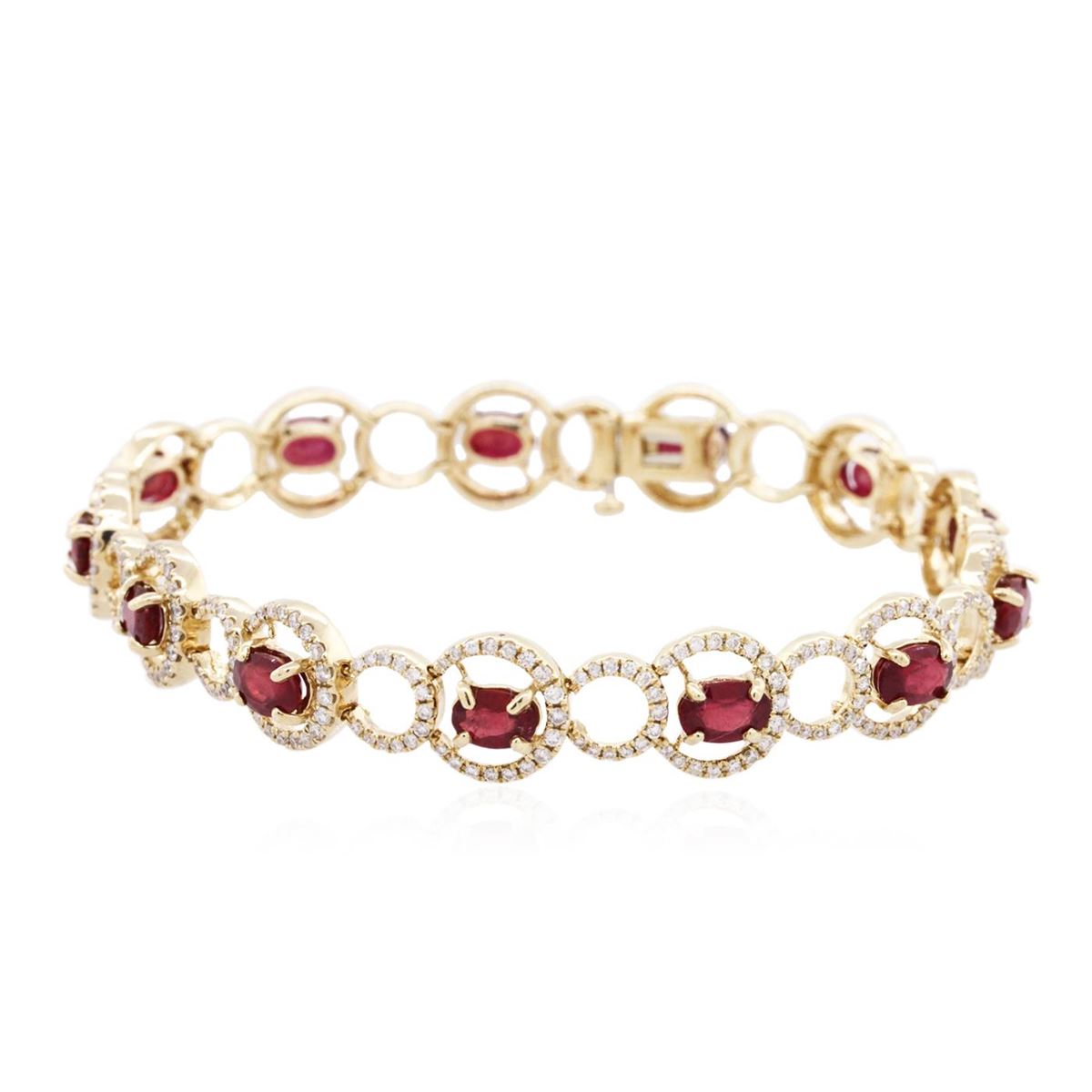 One electronically tested 14KT yellow gold ladies combination cast & assembled ruby and diamond bracelet with a hidden box clasp with a bright polish finish. Measurements: 7.25" in length. Identified with markings of "14K". Condition is new. Containing: Thirteen prong set oval modified brilliant cut natural rubies, measuring 5.60 x 4.18 x 3.00mm, approximate total weight of 6.24ct., clarity is heavily included, type II, medium, moderately strong, strongly purplish red color, (GIA stpR 5/4), cut is very good. Five Hundred Twenty prong set round brilliant cut diamonds, measuring 1.00 - 1.00 x 0.60mm (depth est.) approximate total weight of 520 Stones = 1.87ct. Clarity: I-1 to I-2. Color: I - J, Cut is Good. Colored gemstones are presumed to have been subjected to commonly used enhancement processes. All diamonds and colored gemstones are graded in the mounting, unless otherwise stated. Total Weight of Colored Stones 6.24ct. Total Weight of Diamonds 1.87ct. Total Weight of Bracelet 17.50 grams. GGL Appraised at $10,235.00.
