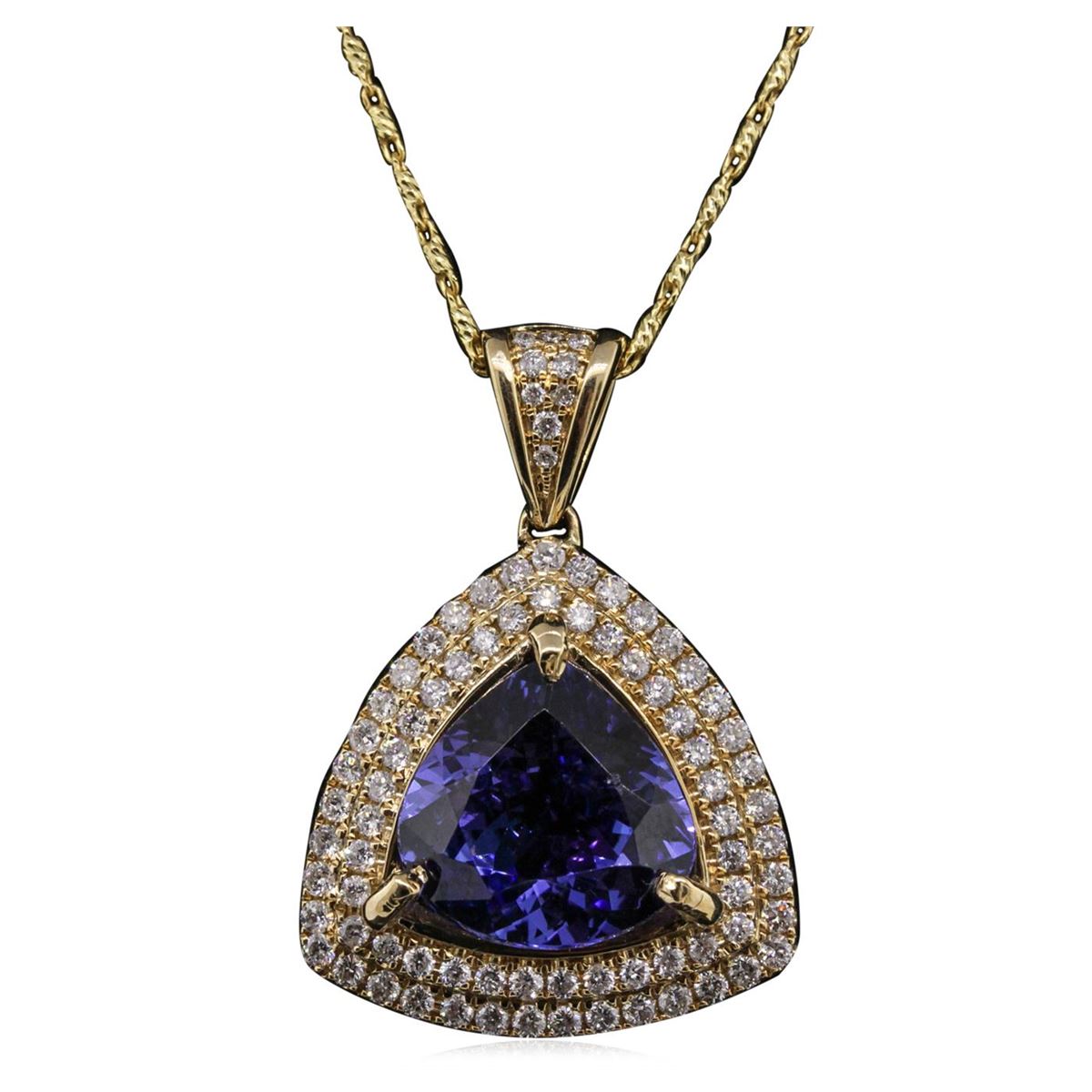 One electronically tested 14KT yellow gold ladies cast & assembled tanzanite and diamond pendant with chain. The pendant features a tanzanite set within two tiered diamond bezels, completed by a diamond set bail. The pendant is supported by an eighteen inch length 14KT yellow gold designer style chain, terminating in a lobster claw clasp. Bright polish finish. Identified with markings of "14K". Condition is new, good workmanship. Containing: One prong set pear brilliant cut natural tanzanite, measuring 11.60 x 11.90 x 6.60mm, 6% bulge factor, approximate weight of 6.47ct., clarity is eye clean, type I, medium dark, slightly grayish, violetish blue color, (GIA vB 6/2), cut is good. Transmitting light with no distortion, transparent. Colored Stone Grading Report attached. Graded in the setting. Tanzanite is a very rare gemstone that is only found in the country of Tanzania. Originally discovered in 1967. Tiffany & Company, named the stone Tanzanite. It is found in the Usumburu Mountains that border the Umba Valley of northern Tanzania. Tanzanite occurs in gray, brown, violet, blue, reddish-purple, & green. The gem is interesting because of its exceptional pleochroism. Rotated in different directions a tanzanite will exhibit multiple changes of color. Tanzanite has a low tolerance to ultrasonic cleaning, and should not be cleaned using this method. Eighty-One prong set round brilliant cut diamonds, measuring 1.50 - 1.30 x 0.84mm (depth est.) approximate total weight of 81 Stones = 0.91ct. Graded in the setting. Clarity: SI-1 to I-1. Color: G - I. Total Weight of Colored Stones 6.47ct. Total Weight of Diamonds 0.91ct. Total Weight of Pendant With Chain 8.94 grams. AIG Appraised at $17,795.00.