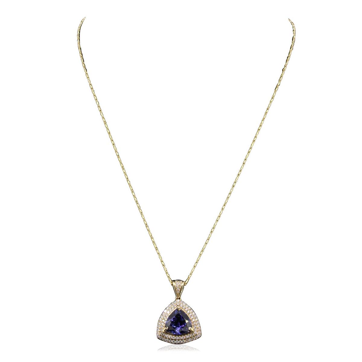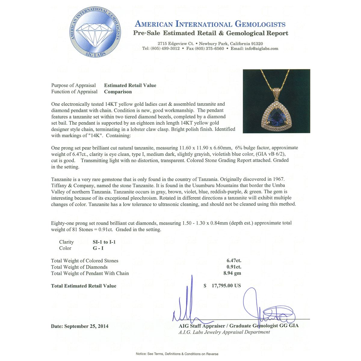 One electronically tested 14KT yellow gold ladies cast & assembled tanzanite and diamond pendant with chain. The pendant features a tanzanite set within two tiered diamond bezels, completed by a diamond set bail. The pendant is supported by an eighteen inch length 14KT yellow gold designer style chain, terminating in a lobster claw clasp. Bright polish finish. Identified with markings of "14K". Condition is new, good workmanship. Containing: One prong set pear brilliant cut natural tanzanite, measuring 11.60 x 11.90 x 6.60mm, 6% bulge factor, approximate weight of 6.47ct., clarity is eye clean, type I, medium dark, slightly grayish, violetish blue color, (GIA vB 6/2), cut is good. Transmitting light with no distortion, transparent. Colored Stone Grading Report attached. Graded in the setting. Tanzanite is a very rare gemstone that is only found in the country of Tanzania. Originally discovered in 1967. Tiffany & Company, named the stone Tanzanite. It is found in the Usumburu Mountains that border the Umba Valley of northern Tanzania. Tanzanite occurs in gray, brown, violet, blue, reddish-purple, & green. The gem is interesting because of its exceptional pleochroism. Rotated in different directions a tanzanite will exhibit multiple changes of color. Tanzanite has a low tolerance to ultrasonic cleaning, and should not be cleaned using this method. Eighty-One prong set round brilliant cut diamonds, measuring 1.50 - 1.30 x 0.84mm (depth est.) approximate total weight of 81 Stones = 0.91ct. Graded in the setting. Clarity: SI-1 to I-1. Color: G - I. Total Weight of Colored Stones 6.47ct. Total Weight of Diamonds 0.91ct. Total Weight of Pendant With Chain 8.94 grams. AIG Appraised at $17,795.00.