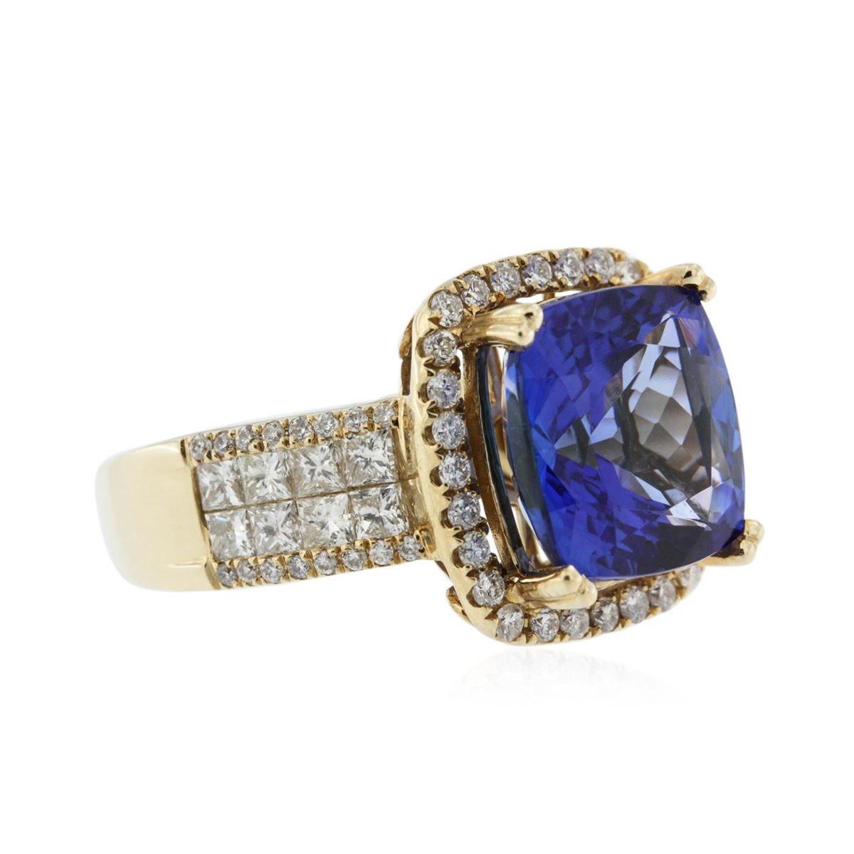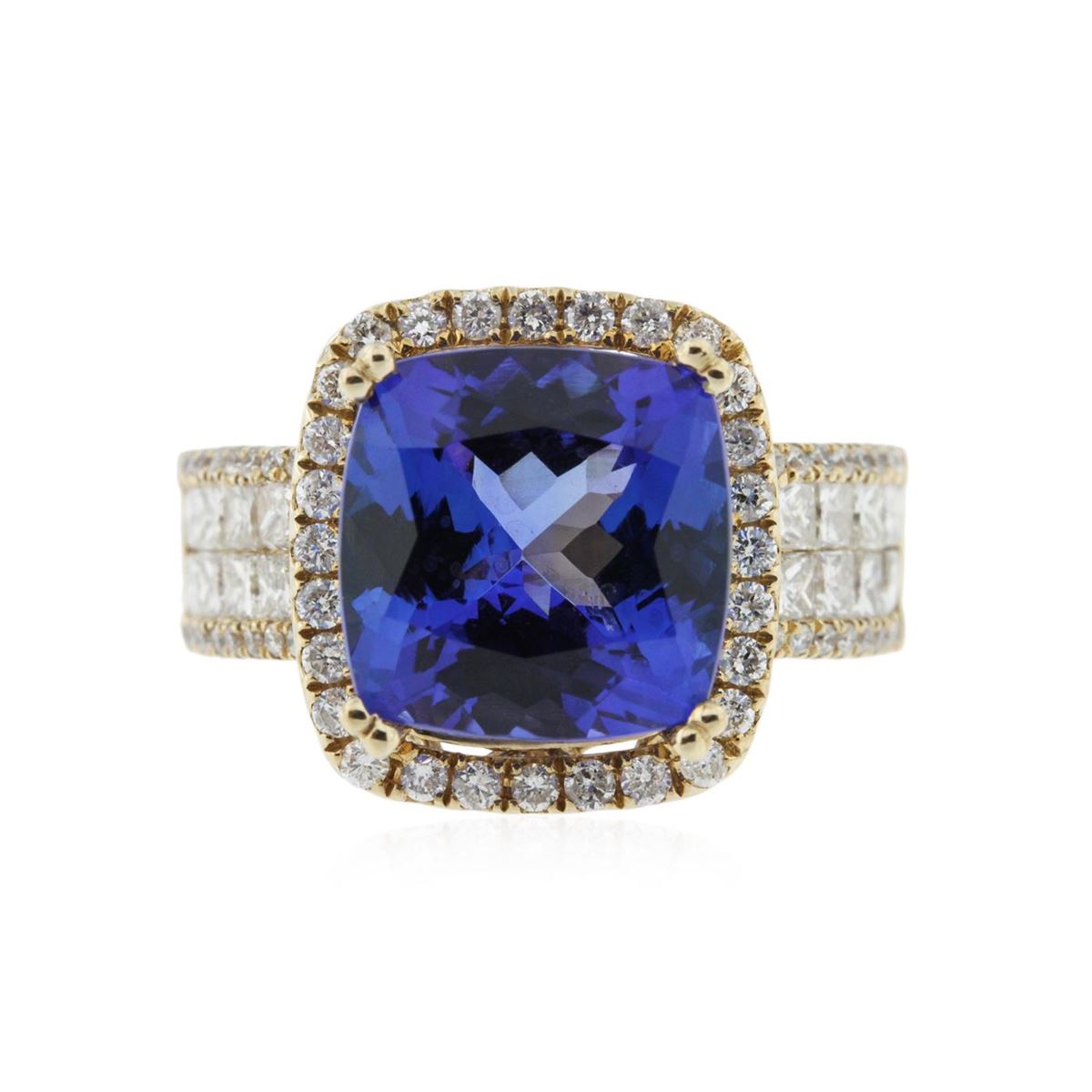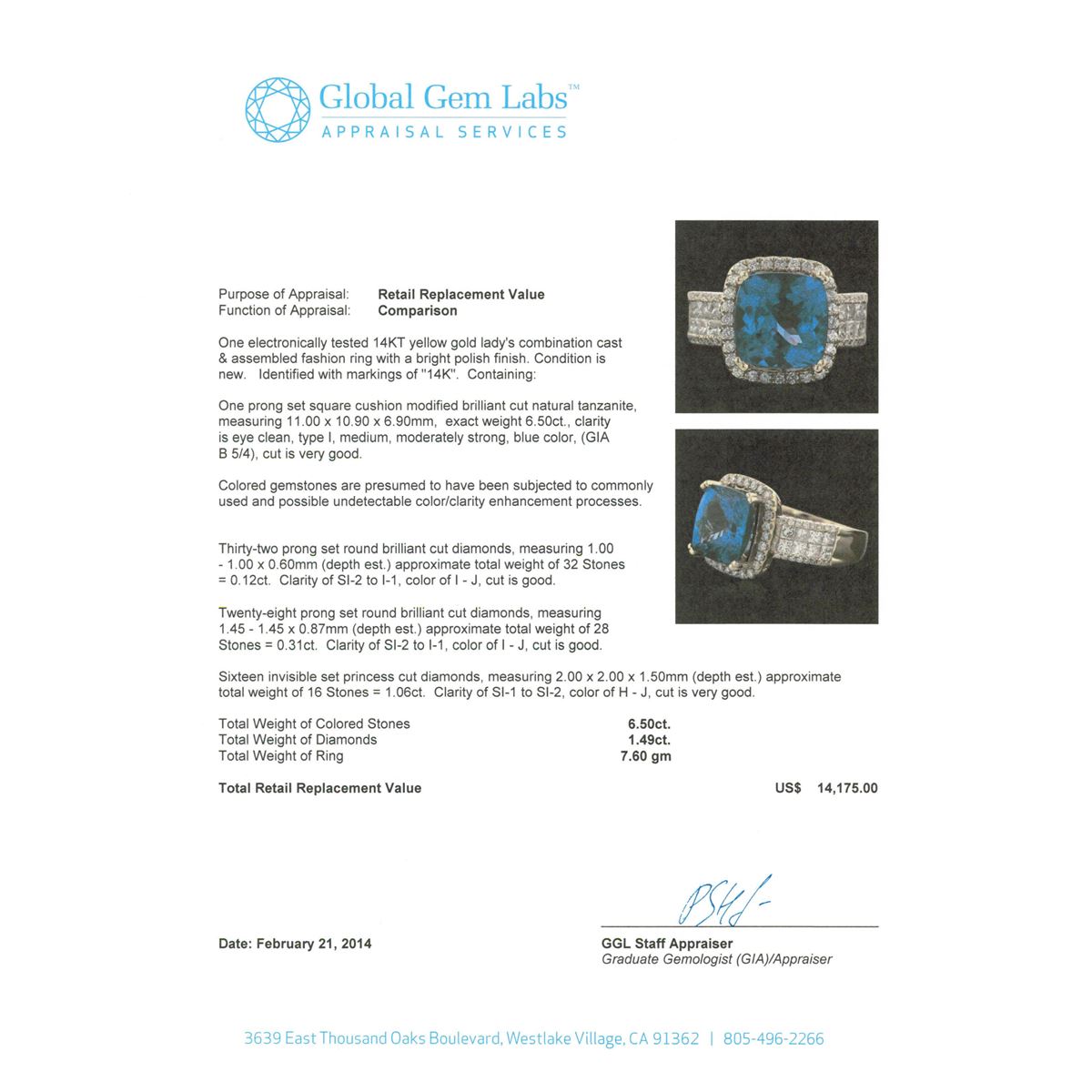 One electronically tested 14KT yellow gold Ladies combination cast & assembled fashion ring with a bright polish finish. Condition is new. Identified with markings of "14K". Containing: One prong set square cushion modified brilliant cut natural tanzanite, measuring 11.00 x 10.90 x 6.90mm, exact weight 6.50ct., clarity is eye clean, type I, medium, moderately strong, blue color, (GIA B 5/4), cut is very good. Colored gemstones are presumed to have been subjected to commonly used and possible undetectable color/clarity enhancement processes. Thirty-Two prong set round brilliant cut diamonds, measuring 1.00 - 1.00 x 0.60mm (depth est.) approximate. Total Weight of 32 Stones = 0.12ct. Clarity: SI-2 to I-1. Color: I - J, Cut is Good. Twenty-Eight prong set round brilliant cut diamonds, measuring 1.45 - 1.45 x 0.87mm (depth est.) approximate. Total Weight of 28 Stones = 0.31ct. Clarity: SI-2 to I-1. Color: I - J, Cut is Good. Sixteen invisible set princess cut diamonds, measuring 2.00 x 2.00 x 1.50mm (depth est.) approximate. Total Weight of 16 Stones = 1.06ct. Clarity: SI-1 to SI-2. Color: H - J, Cut is Very Good. Total Weight of Colored Stones 6.50ct. Total Weight of Diamonds 1.49ct. Total Weight of Ring 7.60 grams. GGL Appraised at $14,175.00.