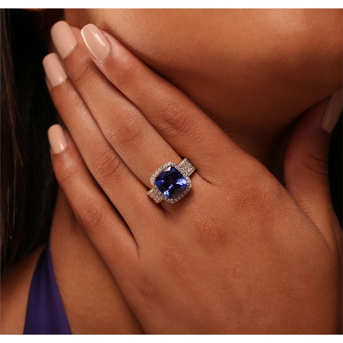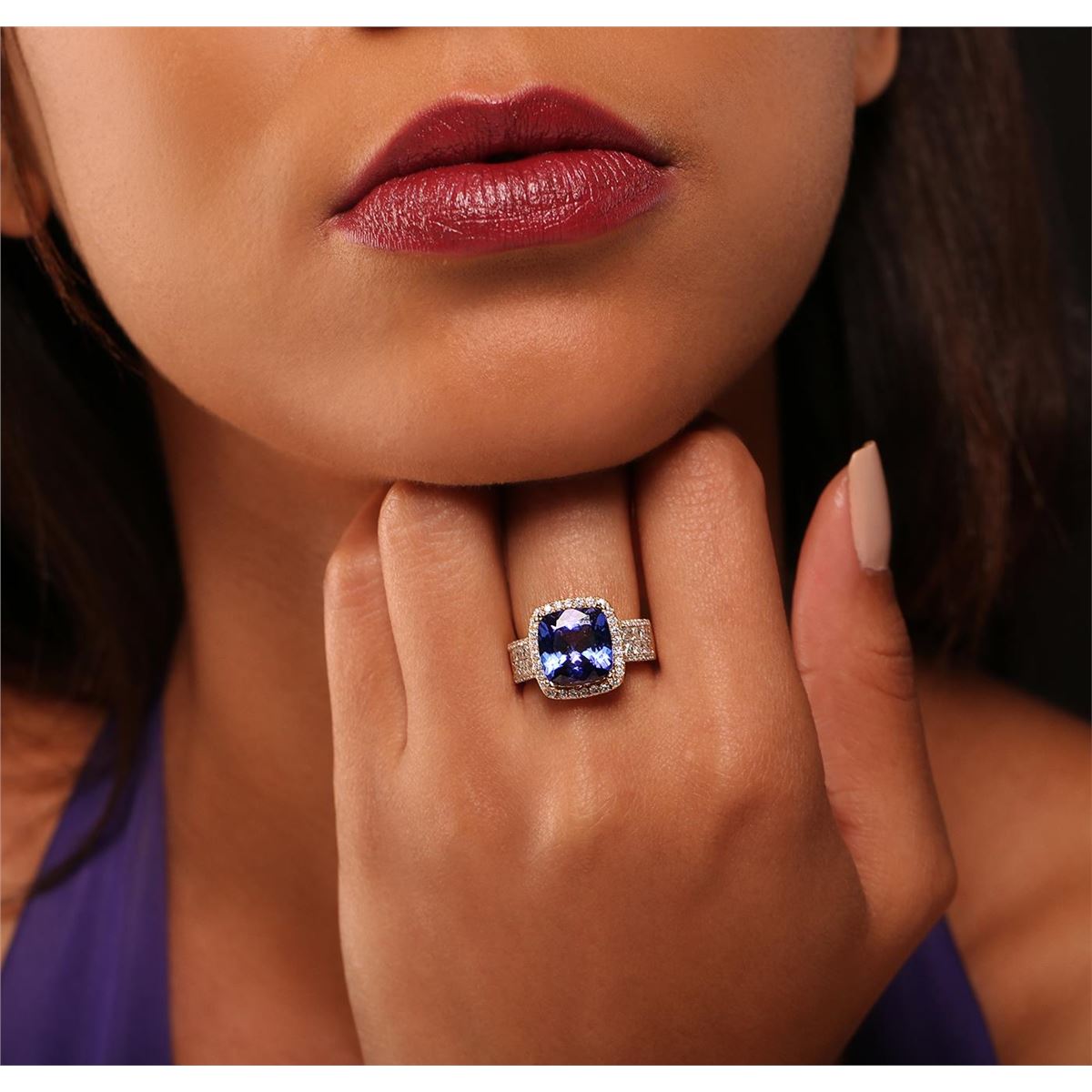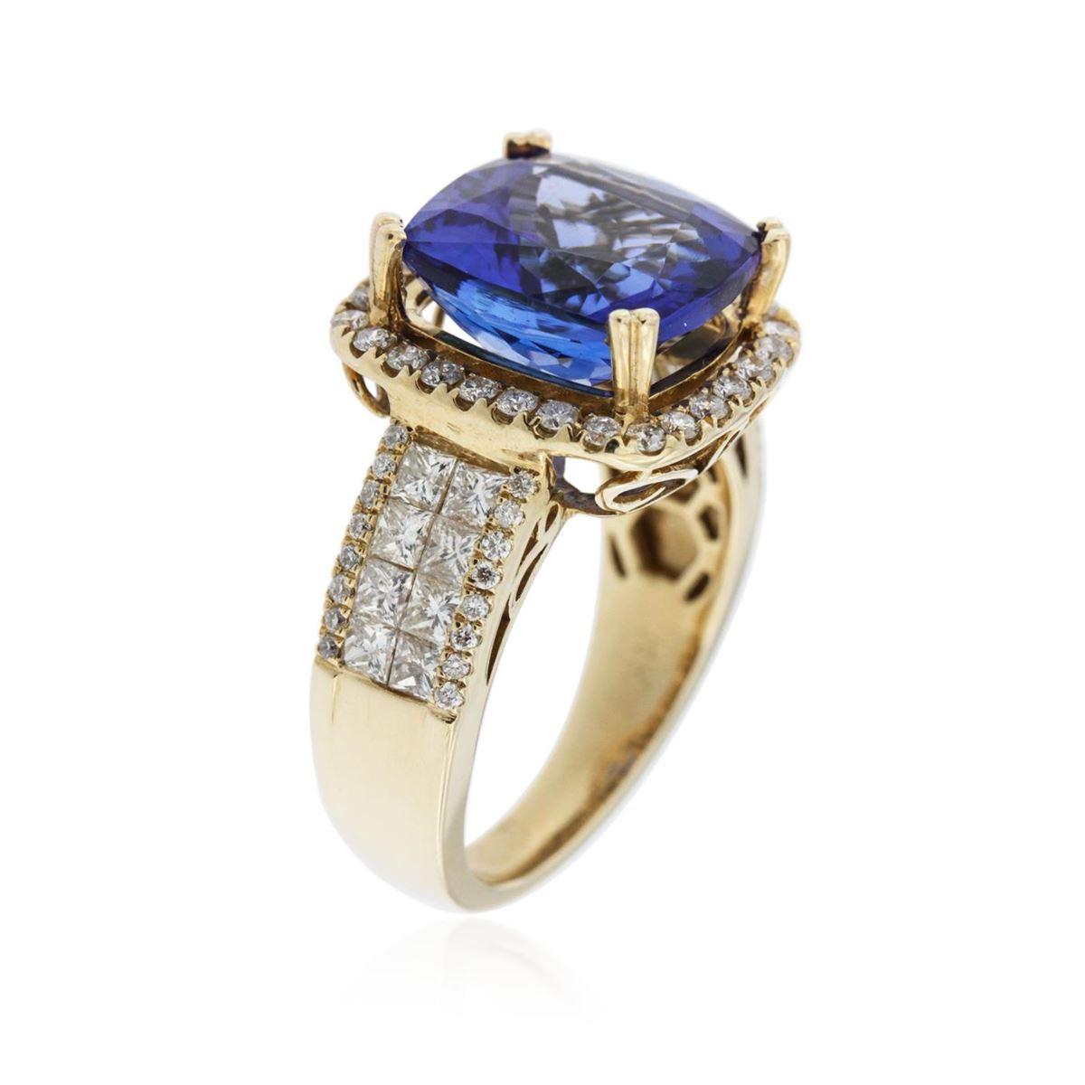 One electronically tested 14KT yellow gold Ladies combination cast & assembled fashion ring with a bright polish finish. Condition is new. Identified with markings of "14K". Containing: One prong set square cushion modified brilliant cut natural tanzanite, measuring 11.00 x 10.90 x 6.90mm, exact weight 6.50ct., clarity is eye clean, type I, medium, moderately strong, blue color, (GIA B 5/4), cut is very good. Colored gemstones are presumed to have been subjected to commonly used and possible undetectable color/clarity enhancement processes. Thirty-Two prong set round brilliant cut diamonds, measuring 1.00 - 1.00 x 0.60mm (depth est.) approximate. Total Weight of 32 Stones = 0.12ct. Clarity: SI-2 to I-1. Color: I - J, Cut is Good. Twenty-Eight prong set round brilliant cut diamonds, measuring 1.45 - 1.45 x 0.87mm (depth est.) approximate. Total Weight of 28 Stones = 0.31ct. Clarity: SI-2 to I-1. Color: I - J, Cut is Good. Sixteen invisible set princess cut diamonds, measuring 2.00 x 2.00 x 1.50mm (depth est.) approximate. Total Weight of 16 Stones = 1.06ct. Clarity: SI-1 to SI-2. Color: H - J, Cut is Very Good. Total Weight of Colored Stones 6.50ct. Total Weight of Diamonds 1.49ct. Total Weight of Ring 7.60 grams. GGL Appraised at $14,175.00.