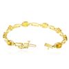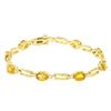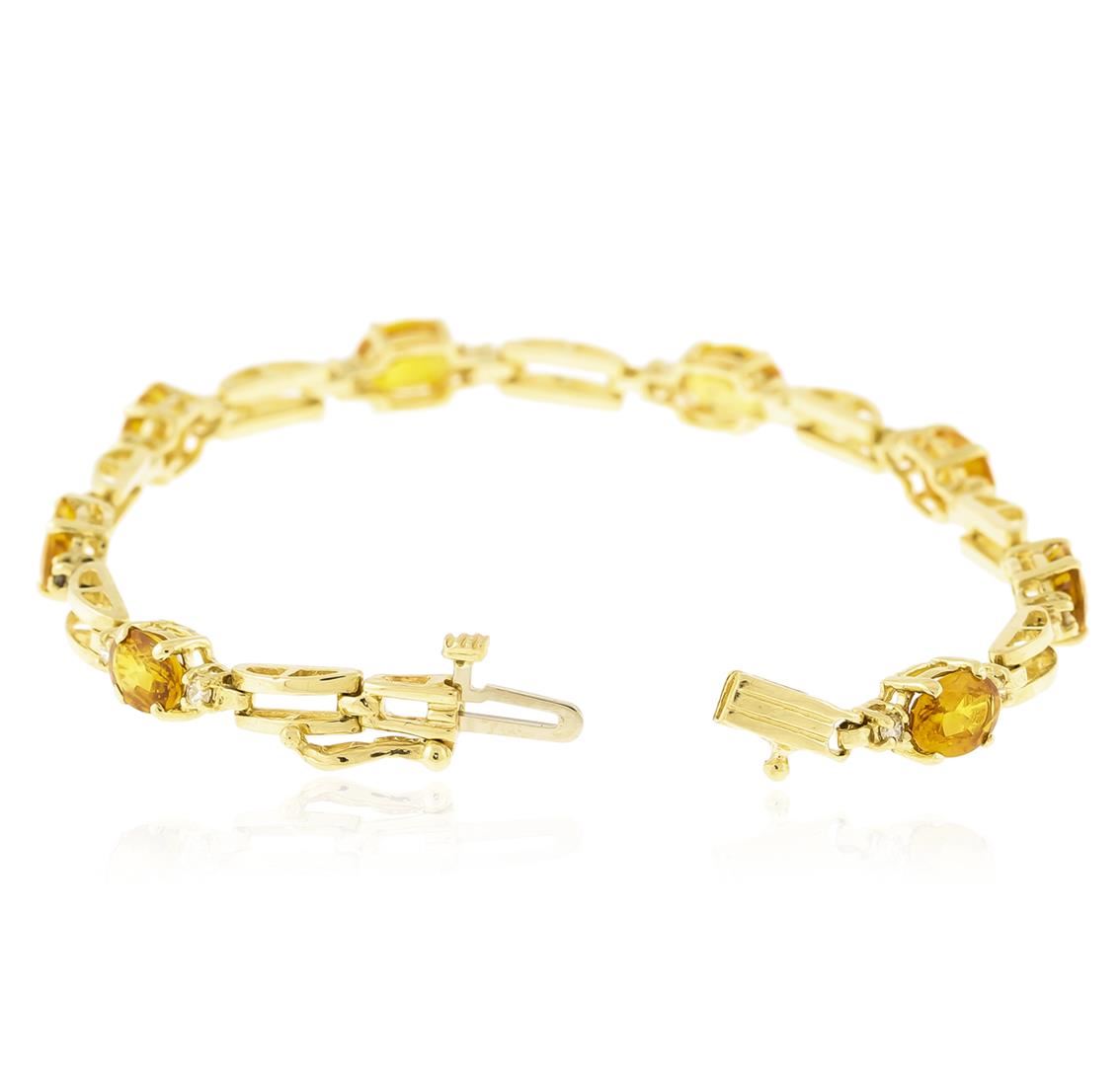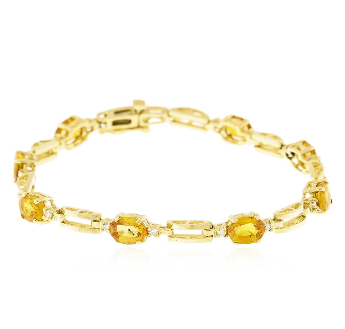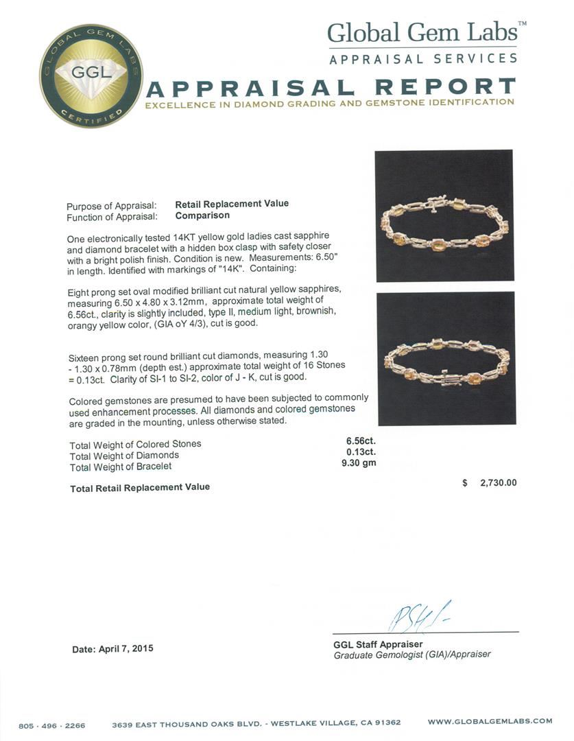 One electronically tested 14KT yellow gold ladies cast sapphire and diamond bracelet with a hidden box clasp with safety closer with a bright polish finish. Measurements: 6.50" in length. Identified with markings of "14K". Condition is new. Containing: Eight prong set oval modified brilliant cut natural yellow sapphires, measuring 6.50 x 4.80 x 3.12mm, approximate total weight of 6.56ct., clarity is slightly included, type II, medium light, brownish, orangy yellow color, (GIA oY 4/3), cut is good. Sixteen prong set round brilliant cut diamonds, measuring 1.30 - 1.30 x 0.78mm (depth est.) approximate total weight of 16 Stones = 0.13ct. Clarity: SI-1 to SI-2. Color: J - K, Cut is Good. Colored gemstones are presumed to have been subjected to commonly used enhancement processes. All diamonds and colored gemstones are graded in the mounting, unless otherwise stated. Total Weight of Colored Stones 6.56ct. Total Weight of Diamonds 0.13ct. Total Weight of Bracelet 9.30 grams. GGL Appraised at $2,730.00.