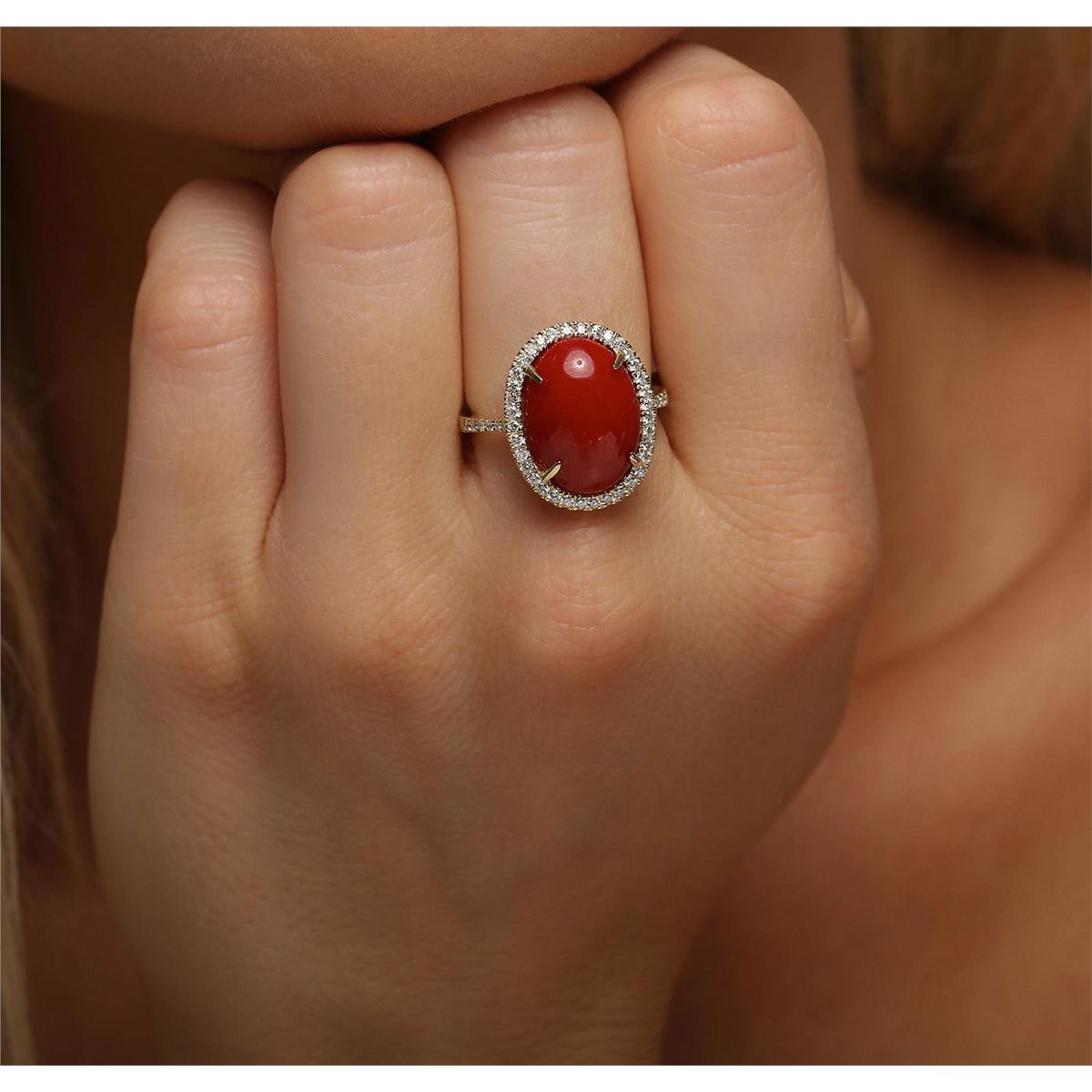 One electronically tested 14KT yellow gold ladies combination cast & assembled coral and diamond ring with a flat shank with a bright polish finish. Identified with markings of "14K". Condition is new. Containing: One prong set oval cabochon cut natural red coral, measuring 15.07 x 11.01 x 5.46mm, approximate weight of 6.65ct., clarity is heavily included, type III, cut is good. Thirty-Six prong set round brilliant cut diamonds, measuring 1.20 - 1.10 x 0.69mm (depth est.) stated total weight of 36 Stones = 0.20ct. Clarity: I-1 to I-2. Color: I - J, Cut is Good. Colored gemstones are presumed to have been subjected to commonly used enhancement processes. All diamonds and colored gemstones are graded in the mounting, unless otherwise stated total weight of Colored Stones 6.65ct. Total Weight of Diamonds 0.20ct. Total Weight of Ring 6.00 grams. GGL Appraised at $5,360.00.