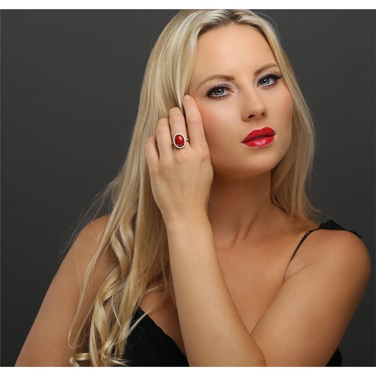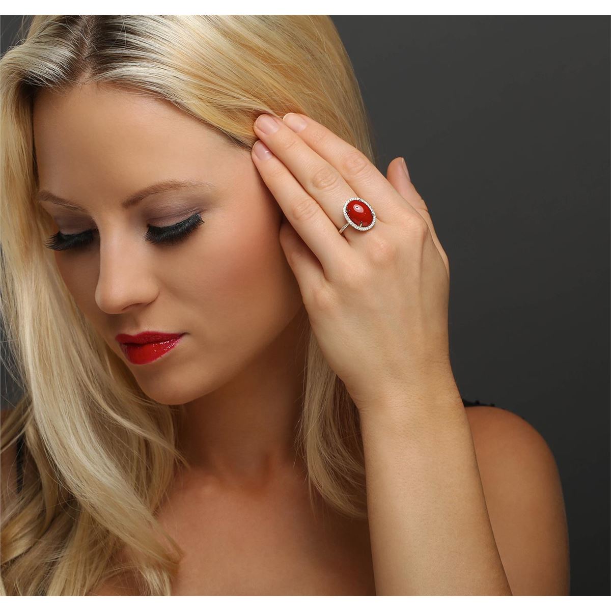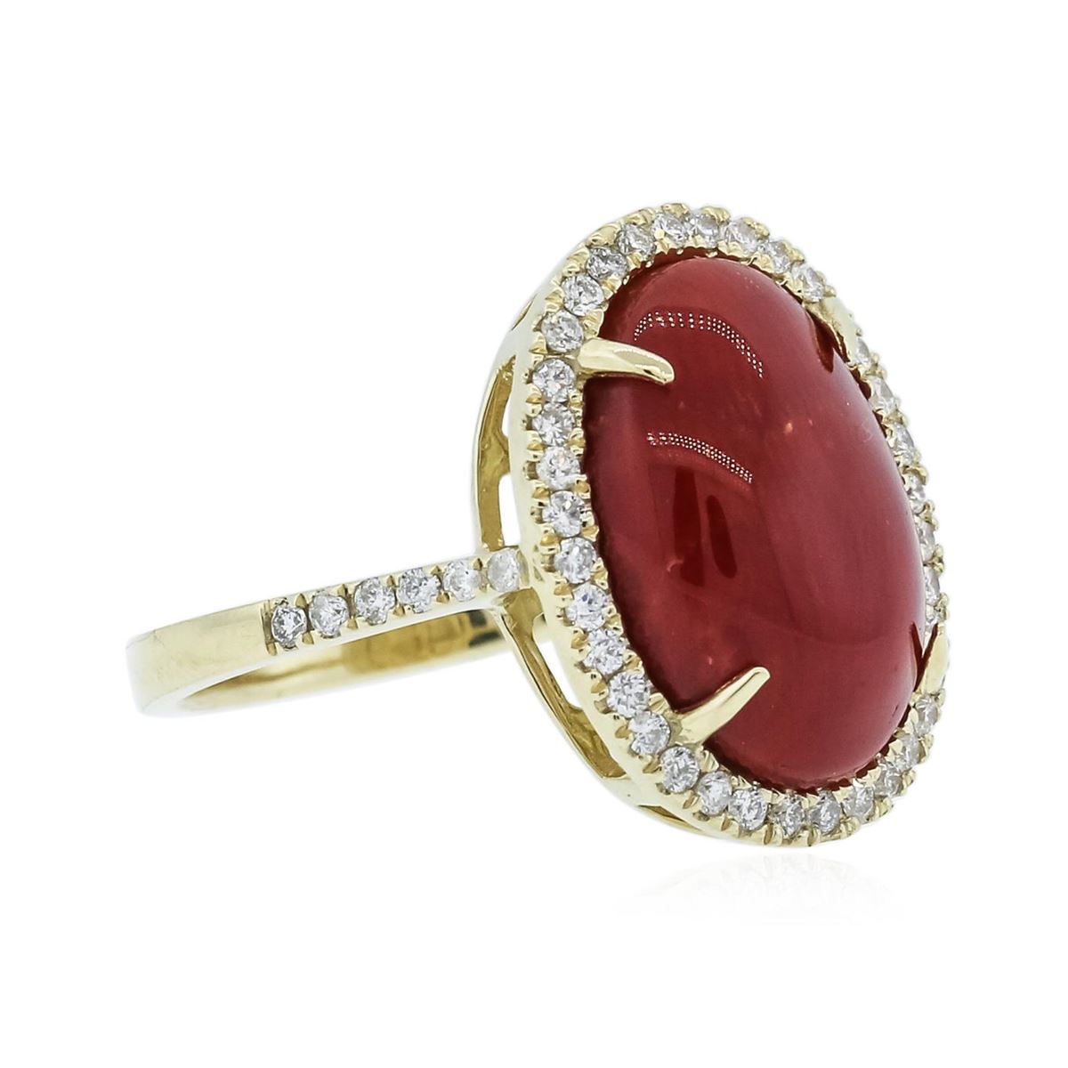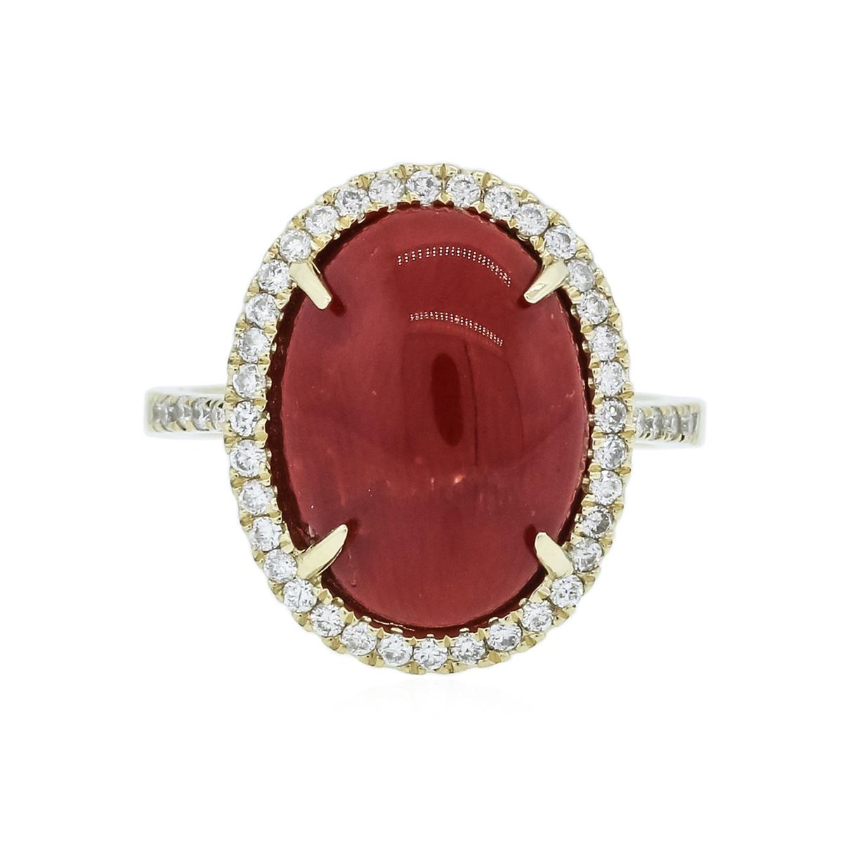 One electronically tested 14KT yellow gold ladies combination cast & assembled coral and diamond ring with a flat shank with a bright polish finish. Identified with markings of "14K". Condition is new. Containing: One prong set oval cabochon cut natural red coral, measuring 15.07 x 11.01 x 5.46mm, approximate weight of 6.65ct., clarity is heavily included, type III, cut is good. Thirty-Six prong set round brilliant cut diamonds, measuring 1.20 - 1.10 x 0.69mm (depth est.) stated total weight of 36 Stones = 0.20ct. Clarity: I-1 to I-2. Color: I - J, Cut is Good. Colored gemstones are presumed to have been subjected to commonly used enhancement processes. All diamonds and colored gemstones are graded in the mounting, unless otherwise stated total weight of Colored Stones 6.65ct. Total Weight of Diamonds 0.20ct. Total Weight of Ring 6.00 grams. GGL Appraised at $5,360.00.