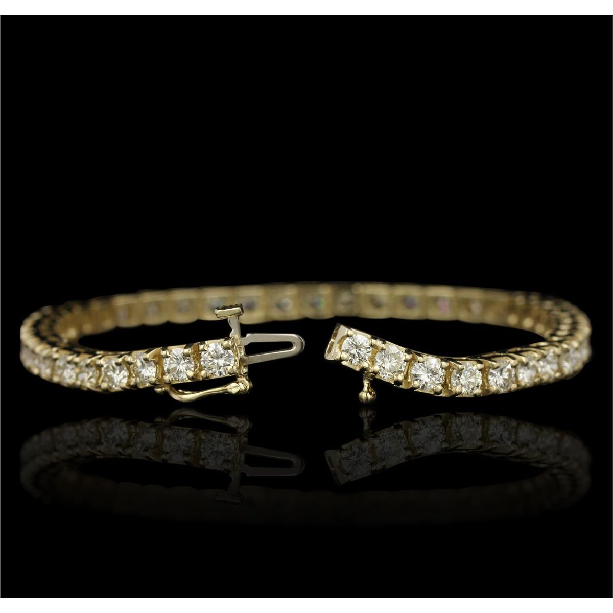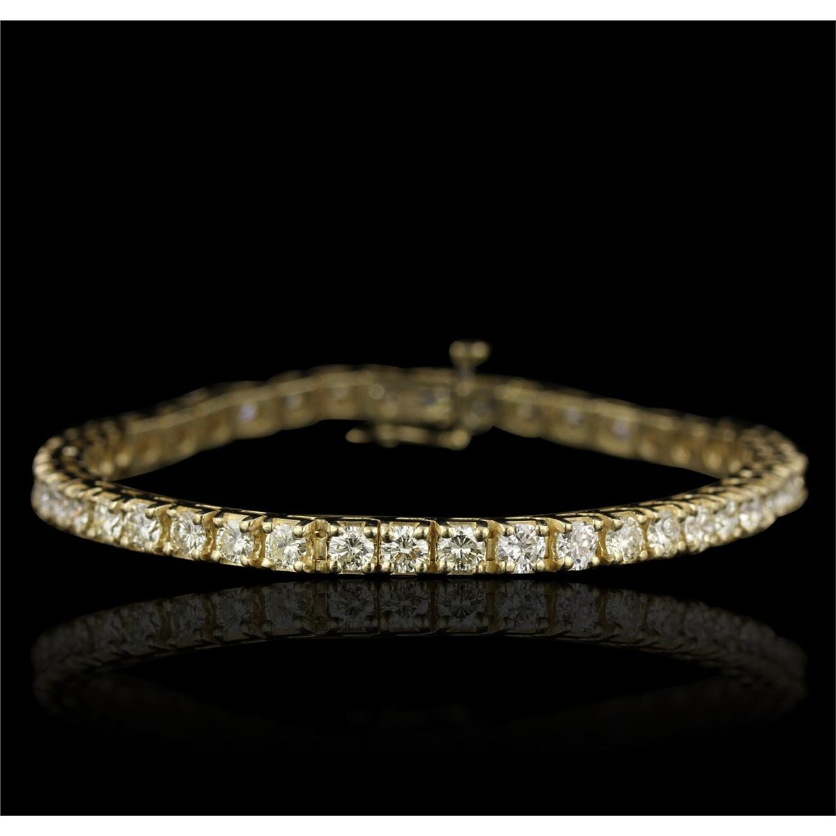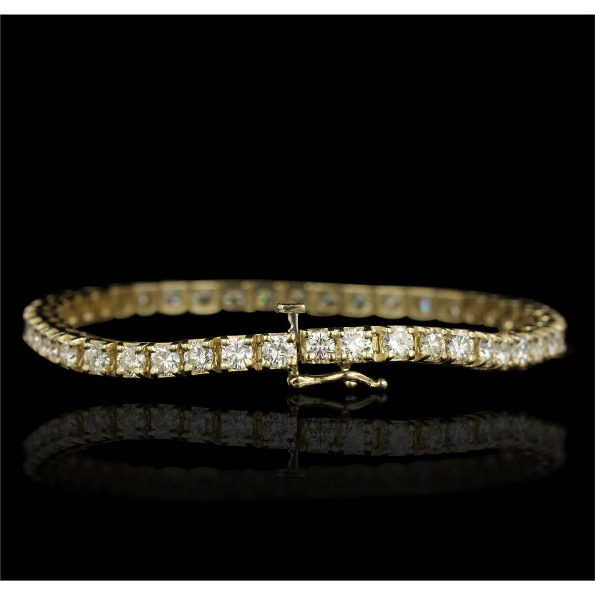 One electronically tested 14KT yellow gold Ladies die struck & assembled tennis bracelet with a hidden box clasp with a bright polish finish. Identified with markings of "14K". Condition is excellent. Containing: Forty-Four prong set round brilliant cut diamonds, measuring 3.50 - 3.50 x 2.10mm (depth est.) approximate total weight of 44 Stones = 6.75ct. Clarity of SI-1 to SI-2, Color of L - M. Total Weight of Diamonds 6.75ct. Total Weight of Bracelet 15.50gm. GGL Appraised at $13,990.00.