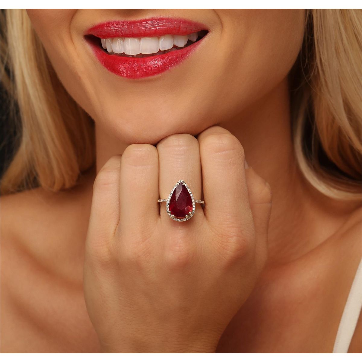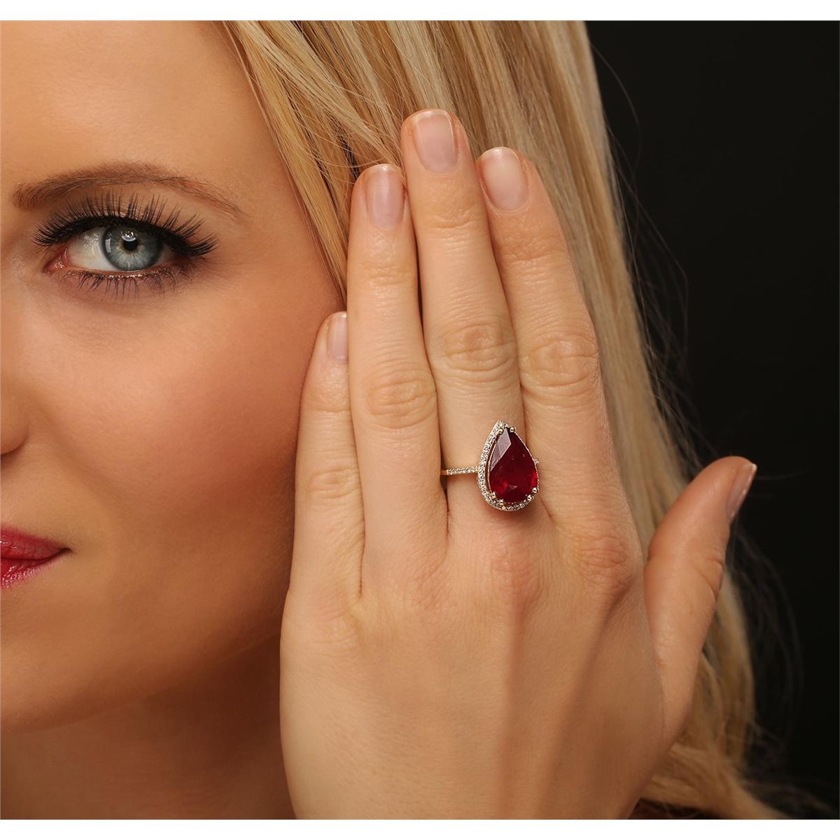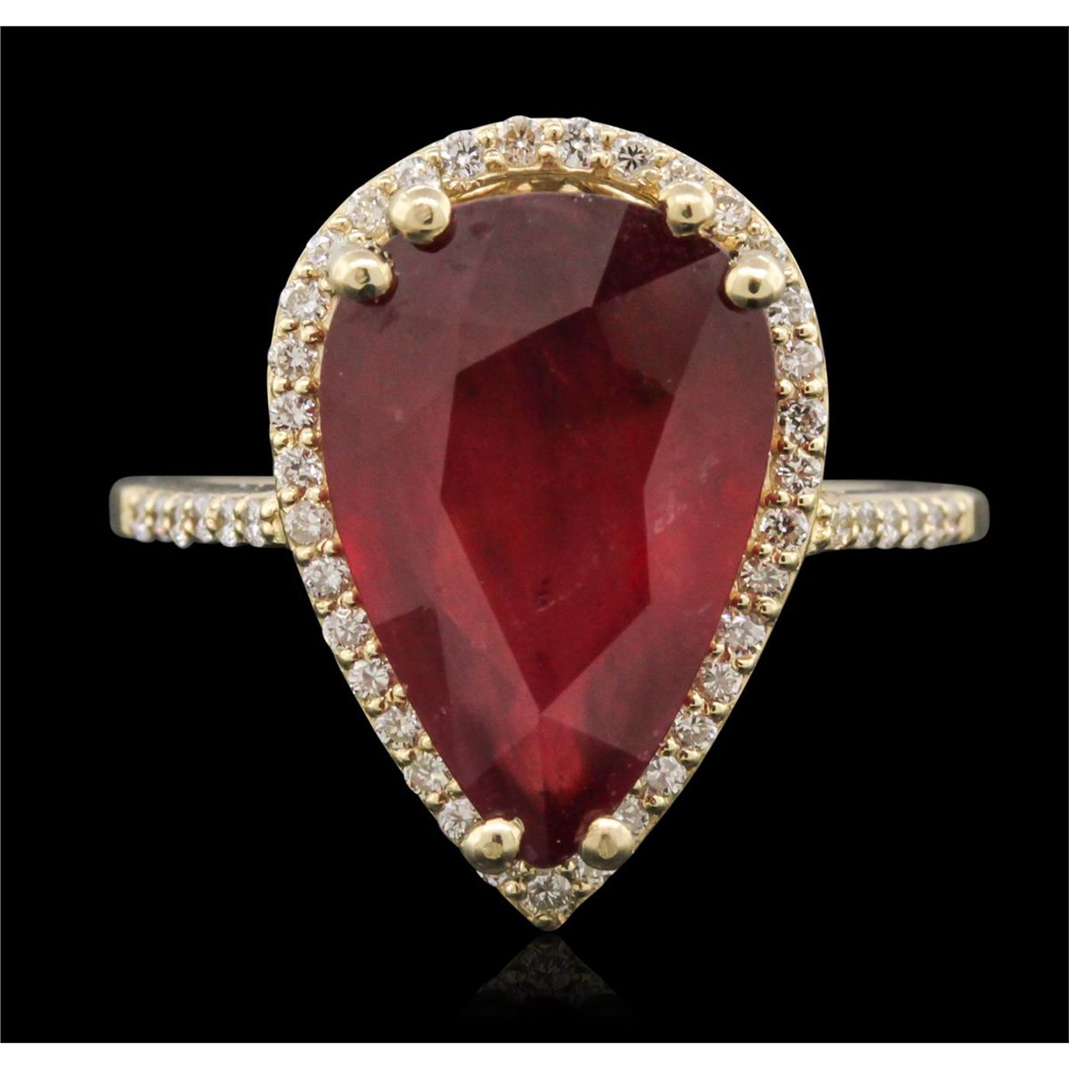 One electronically tested 14KT yellow gold ladies cast ruby and diamond ring with a bright polish finish. The featured ruby is set within a diamond bezel supported by diamond set shoulders, completed by a one millimeter wide band. Identified with markings of "14K". Condition is new, good workmanship. Containing: One prong set pear mixed cut natural ruby, measuring 15.30 x 10.25 x 5.10mm, 6%. bulge factor, approximate weight of 6.78ct., clarity is heavily included, type II, medium dark, very slightly brownish, slightly purplish red color, (GIA slpR 6/3), cut is good. Transmitting light somewhat diffusely, transparent to translucent. Naturally occurring internal & external characteristics are present. Indications of laboratory high temperature heat treatment, with glass & flux additives. Graded in the setting. Ruby has a low tolerance to rhodium plating, repolishing the surface, & ultrasonic cleaning. Forty-Seven prong set round brilliant cut diamonds, measuring 1.20 - 1.20 x 0.72mm (depth est.) approximate total weight of 47 Stones = 0.39ct. Graded in the setting. Clarity: VS-1 to SI-1 . Color: G - I. Total Weight of Colored Stones 6.78ct. Total Weight of Diamonds 0.39ct. Total Weight of Ring 4.98 grams. AIG Appraised at $3,725.00.