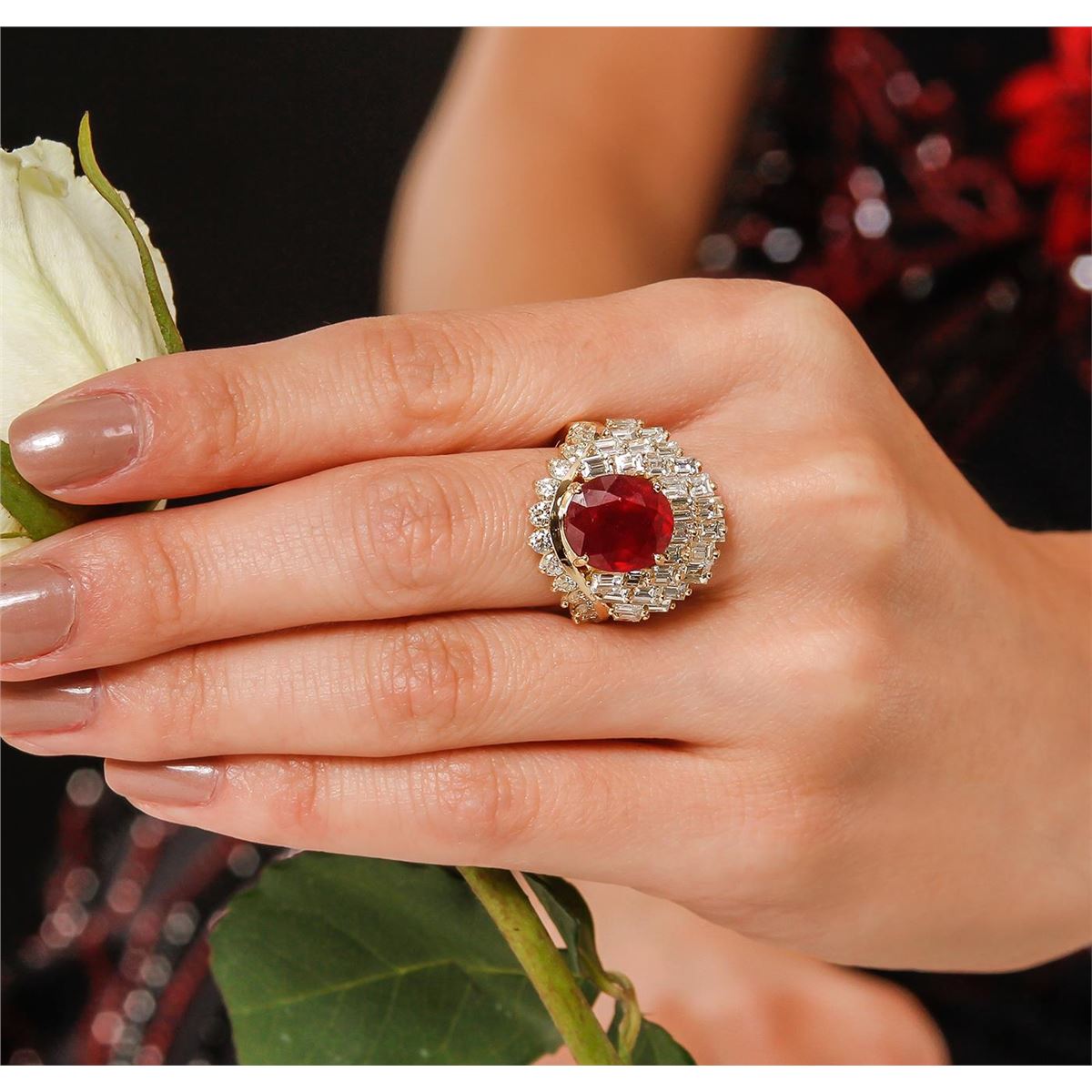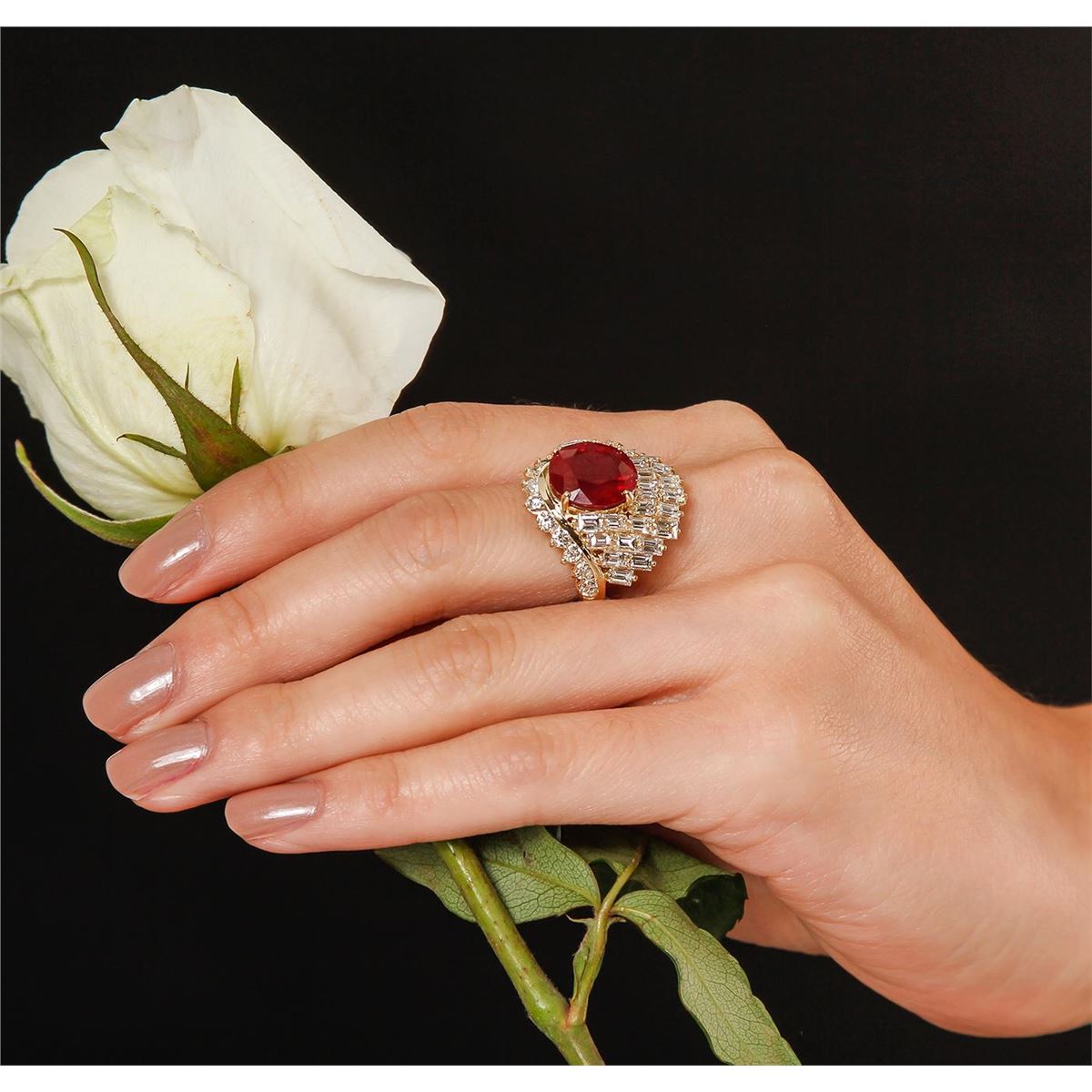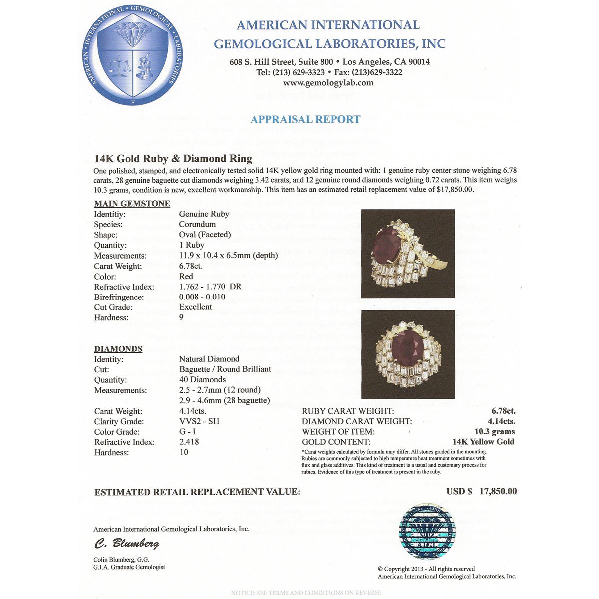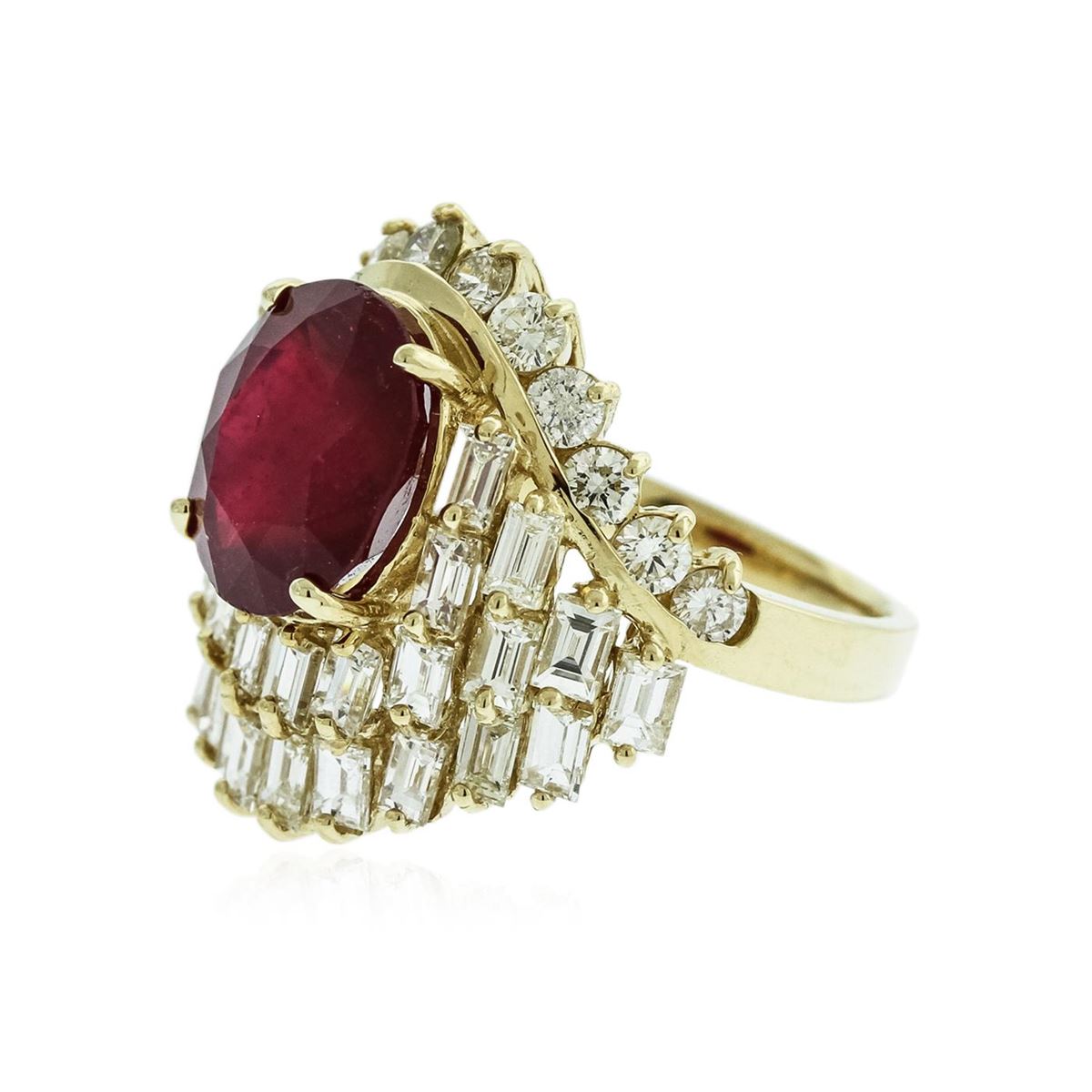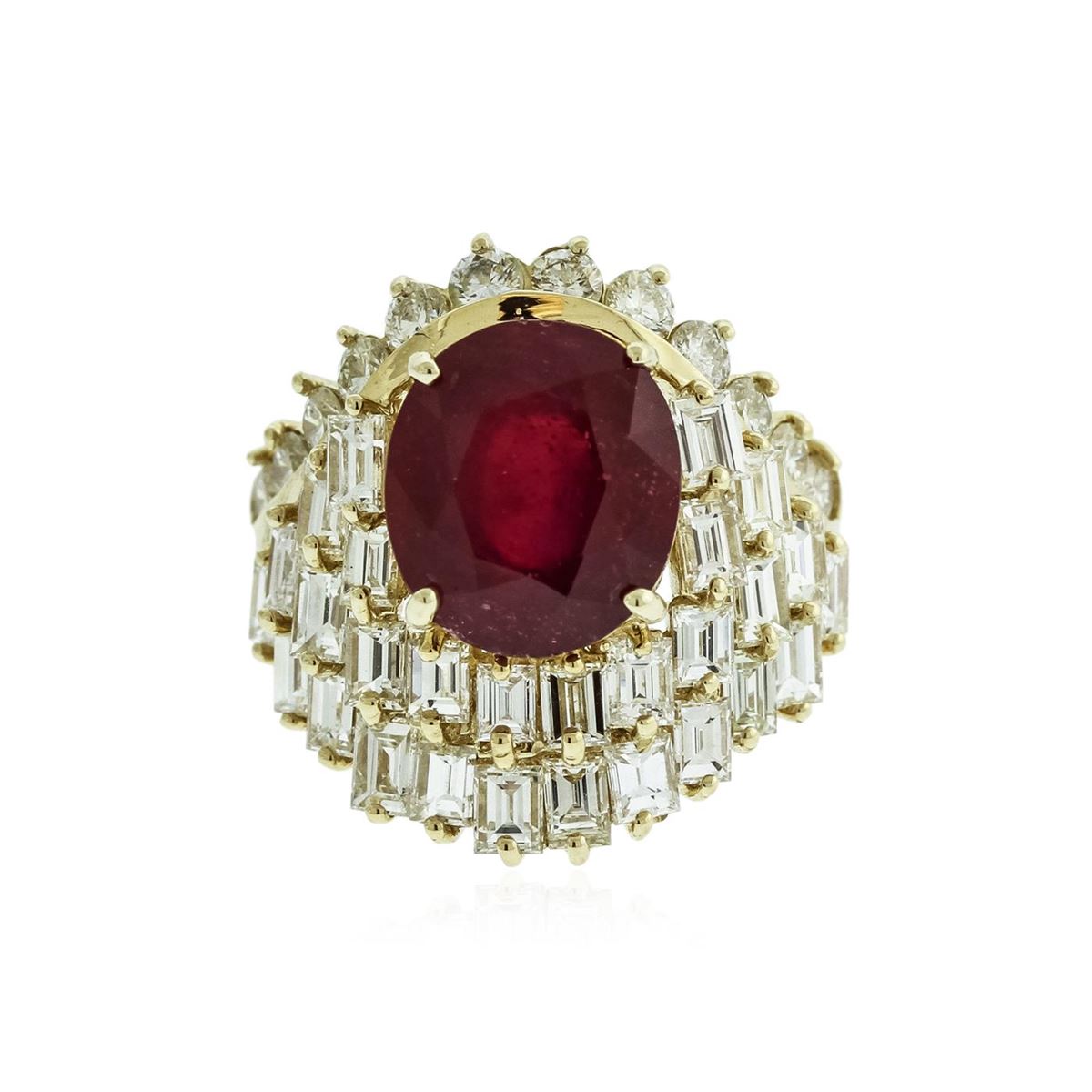 One polished, stamped, and electronically tested solid 14K yellow gold ring mounted with: 1 genuine ruby center stone weighing 6.78 carats, 28 genuine baguette cut diamonds weighing 3.42 carats, and 12 genuine round diamonds weighing 0.72 carats. This item weighs 10.3 grams, condition is new, excellent workmanship. AIGL Appraised at $17,850.00.