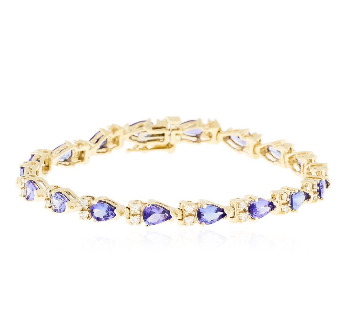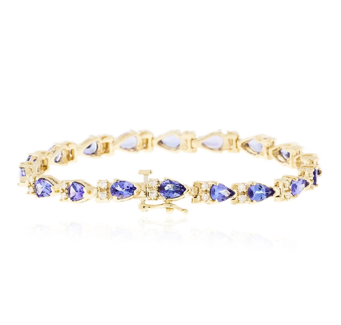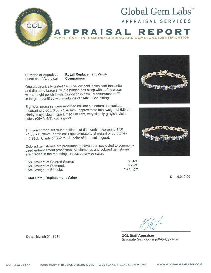 One electronically tested 14KT yellow gold ladies cast tanzanite and diamond bracelet with a hidden box clasp with safety closer with a bright polish finish. Measurements: 7" in length. Identified with markings of "14K". Condition is new. Containing: Eighteen prong set pear modified brilliant cut natural tanzanites, measuring 6.00. x 3.80 x 2.47mm, approximate total weight of 6.84ct., clarity is eye clean, type I, medium light, very slightly grayish, violet color, (GIA V 4/3), cut is good. Thirty-Six prong set round brilliant cut diamonds, measuring 1.30 - 1.30 x 0.78mm (depth est.) approximate total weight of 36 Stones = 0.29ct. Clarity: SI-2 to I-1. Color: I - J, Cut is Good. Colored gemstones are presumed to have been subjected to commonly used enhancement processes. All diamonds and colored gemstones are graded in the mounting, unless otherwise stated. Total Weight of Colored Stones 6.84ct. Total Weight of Diamonds 0.29ct. Total Weight of Bracelet 13.10 grams. GGL Appraised at $4,010.00.