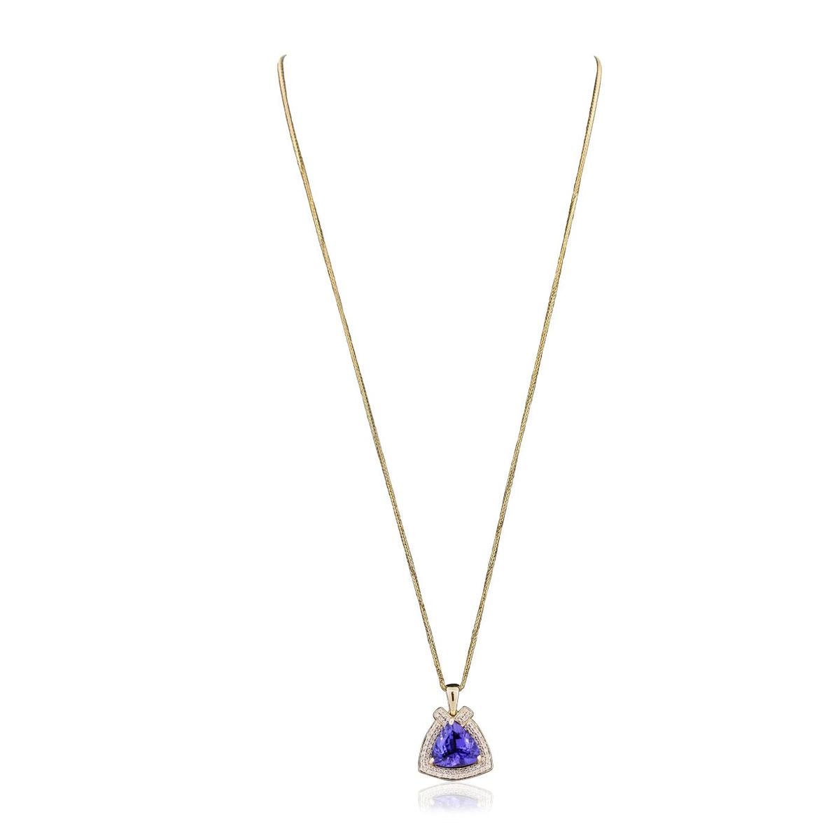 One electronically tested 14KT yellow gold ladies combination cast & die struck pendant & chain 18.0" long, medium herringbone link with a lobster claw clasp with a bright polish finish. Identified with markings of "14K". Condition is new. Containing: One prong set triangle modified brilliant cut natural tanzanite, measuring 13.00 x 13.00 x 6.71mm, approximate weight of 6.84ct., clarity is eye clean, type I, medium, moderately strong, violet color, (GIA V 5/4), cut is good. Seventy prong set round brilliant cut diamonds, measuring 1.10 - 1.10 x 0.66mm (depth est.) approximate total weight of 70 Stones = 0.34ct. Clarity: I-1 to I-2. Color: J - K, Cut is Good. Colored gemstones are presumed to have been subjected to commonly used enhancement processes. All diamonds and colored gemstones are graded in the mounting, unless otherwise stated. Total Weight of Colored Stones 6.84ct. Total Weight of Diamonds 0.34ct. Total Weight of Pendant & Chain 7.90 grams. GGL Appraised at $12,490.00.
