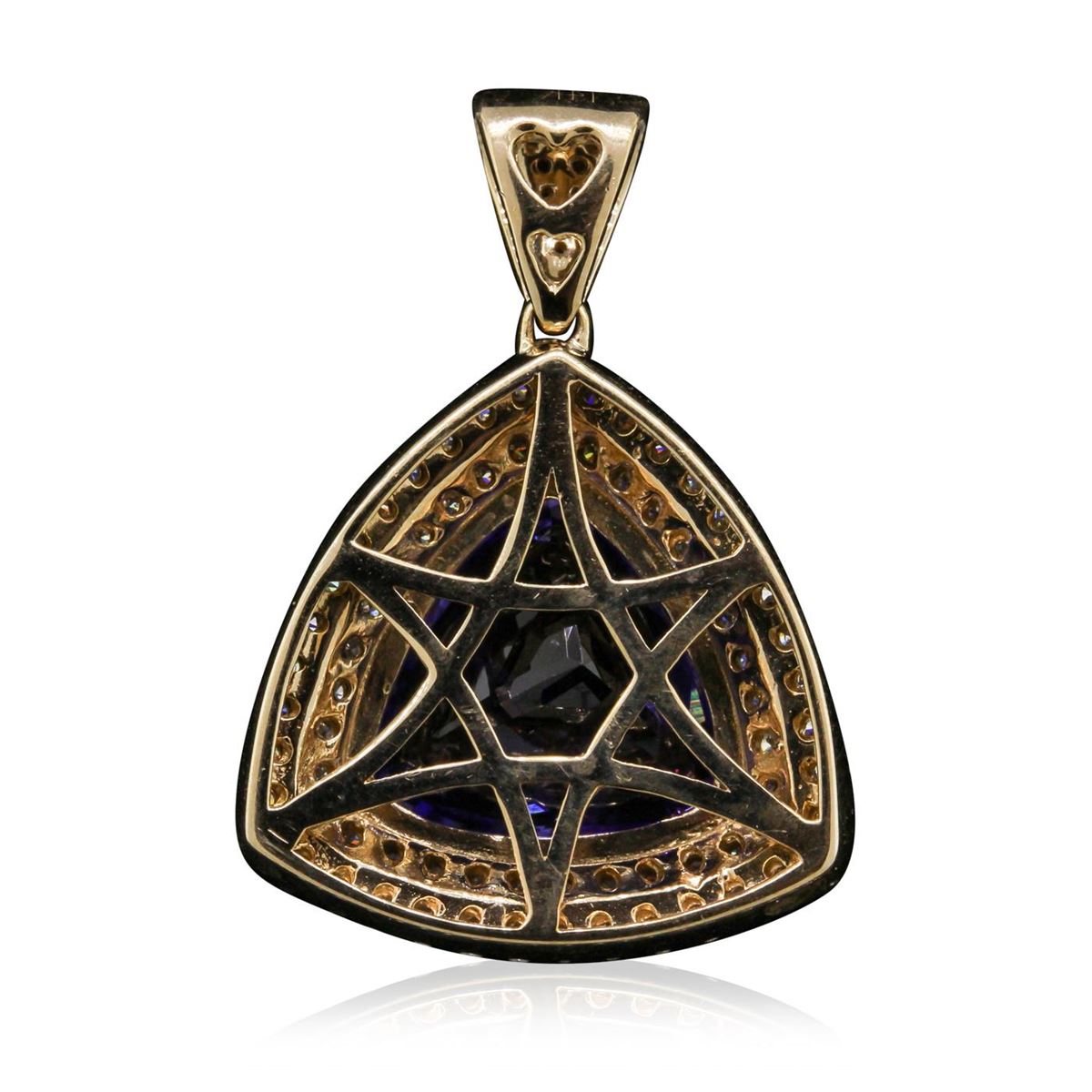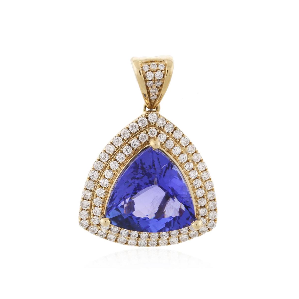 One electronically tested 14KT yellow gold Ladies combination cast & assembled fashion pendant with a bright polish finish. Condition is new. Identified with markings of "14K". Containing: One prong set triangle modified mixed cut natural tanzanite, measuring 12.50 x 12.50 x 7.10mm, approximate weight of 6.85ct., clarity is eye clean, type I, medium, moderately strong, blue color, (GIA B 5/4), cut is very good. Colored gemstones are presumed to have been subjected to commonly used and possible undetectable color/clarity enhancement processes. Nine prong set round brilliant cut diamonds, measuring 1.00 - 1.00 x 0.60mm (depth est.) approximate. Total Weight of 9 Stones = 0.09ct. Clarity: SI-1 to SI-2. Color: G - H, Cut is Good. Seventy prong set round brilliant cut diamonds, measuring 1.30 - 1.30 x 0.78mm (depth est.) approximate. Total Weight of 70 Stones = 0.79ct. Clarity: SI-1 to I-1. Color: H - I, Cut is Good. Total Weight of Colored Stones 6.85ct. Total Weight of Diamonds 0.88ct. Total Weight of Pendant 6.70 grams. GGL Appraised at $13,985.00.