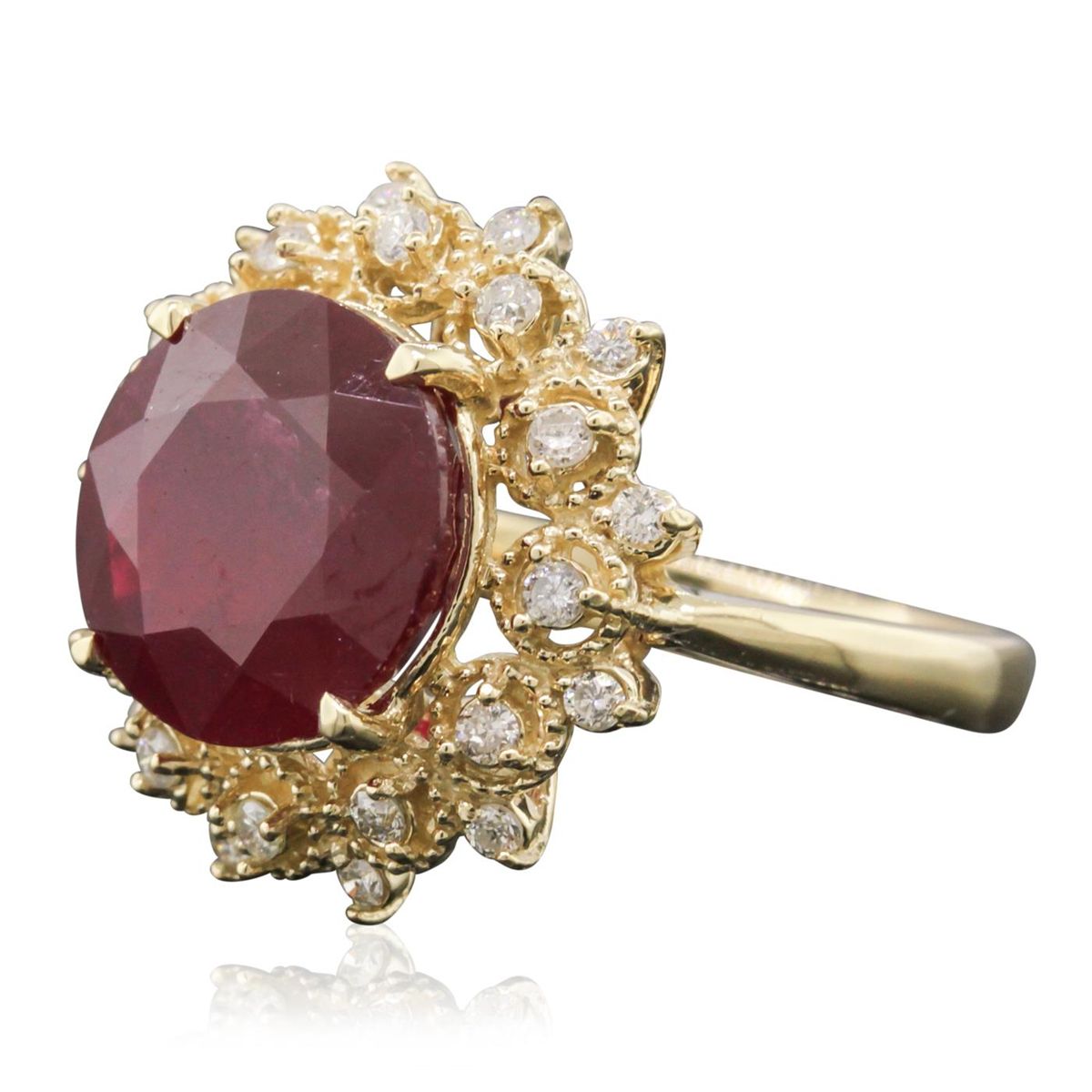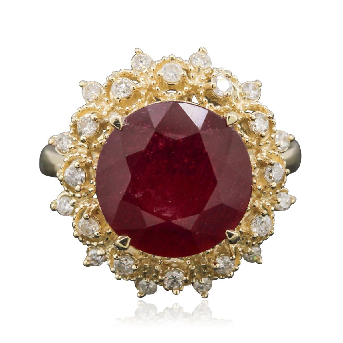 One electronically tested 14KT yellow gold ladies cast ruby and diamond ring. The featured ruby is set within a stylized floret bezel, completed by a two and one-half millimeter wide band. Bright polish finish with milgrain detailing. Identified with markings of "K14". Condition is new, good workmanship. Containing: One prong set round brilliant cut natural ruby, measuring 11.40 - 11.40 x 6.60 mm, approximate weight of 6.86ct., clarity is heavily included, type II, medium dark, very slightly brownish, slightly purplish red color, (GIA slpR 6/3), cut is good. Transmitting light somewhat diffusely, transparent to translucent. Naturally occurring internal & external characteristics are present. Indications of laboratory high temperature heat treatment, with glass & flux additives. Graded in the setting. Ruby has a low tolerance to rhodium plating, repolishing the surface, & ultrasonic cleaning. Twenty-Four prong set round brilliant cut diamonds, measuring 1.70 - 1.60 x 0.99mm (depth est.) approximate total weight of 24 Stones = 0.49ct. Graded in the setting. Clarity: SI-1 to I-1 . Color: G - I. Total Weight of Colored Stones 6.86ct. Total Weight of Diamonds 0.49ct. Total Weight of Ring 6.27 grams. AIG Appraised at $3,870.00.