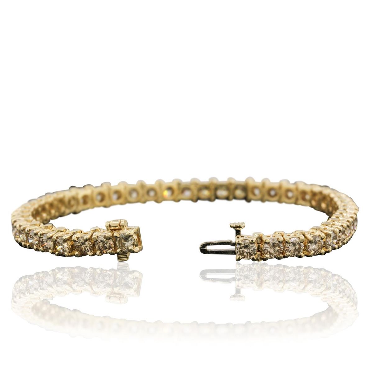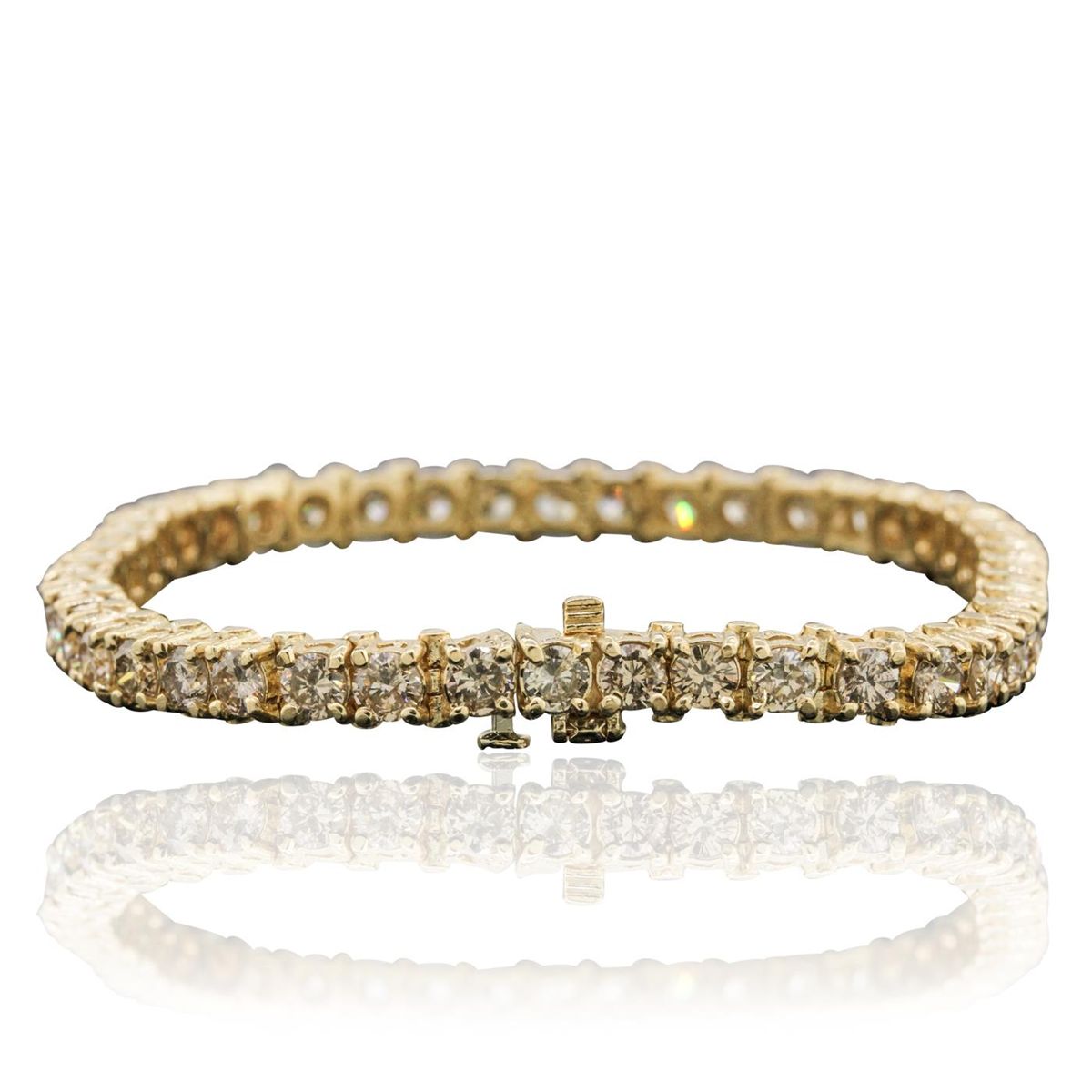 One electronically tested 14KT yellow gold ladies combination cast & assembled tennis bracelet with a hidden box clasp with a bright polish finish. Condition is new. Measurements: 7" in length. Identified with markings of "14K". Containing: Forty-Four prong set round brilliant cut diamonds, measuring 3.50 - 3.50 x 2.10mm (depth est.) approximate. Total Weight of 44 Stones = 6.90ct. Clarity: SI-2 to I-1. Color: L - M, Cut is Good. All diamonds are graded in the mounting, unless otherwise stated. Total Weight of Diamonds 6.90ct. Total Weight of Bracelet 20.50 grams. GGL Appraised at $20,495.00.
